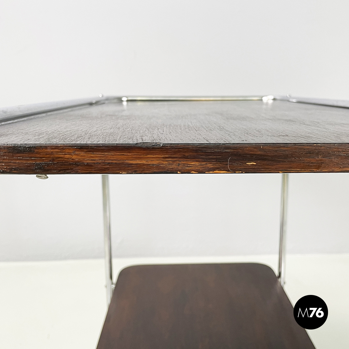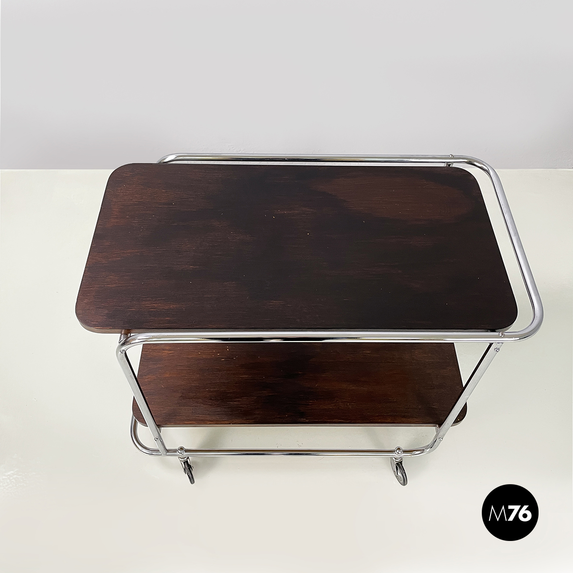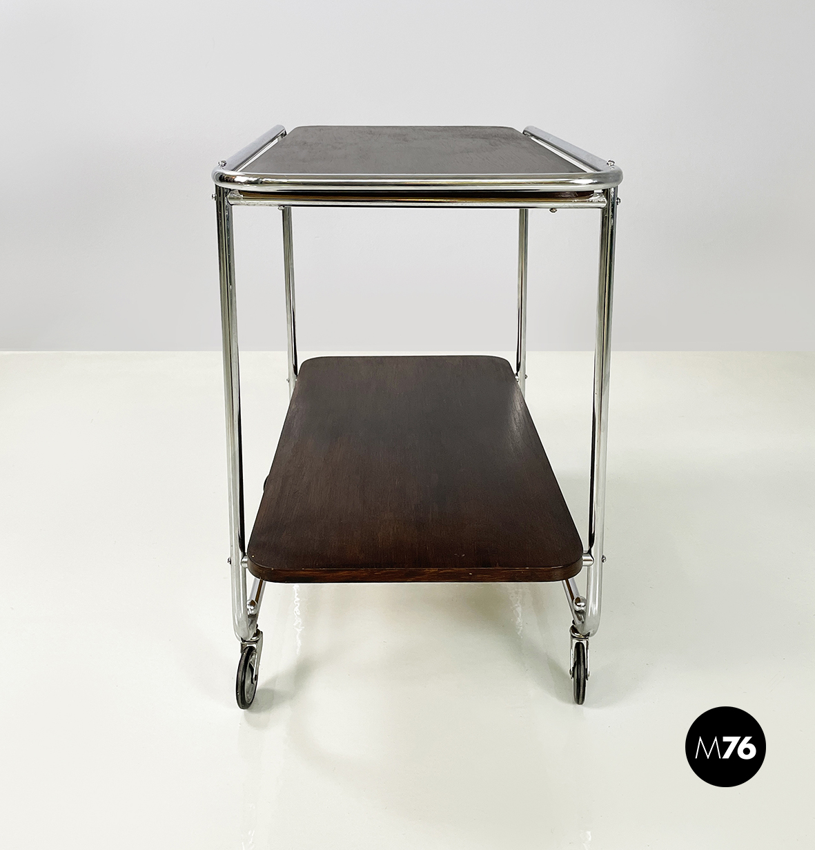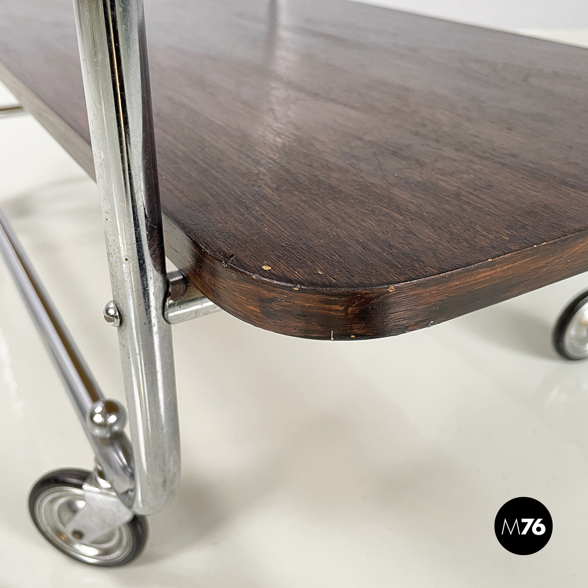 Carrello portavivande con doppio ripiano ad angoli arrotondati in legno scuro. La struttura è in tondino di metallo. Ruote alla base.