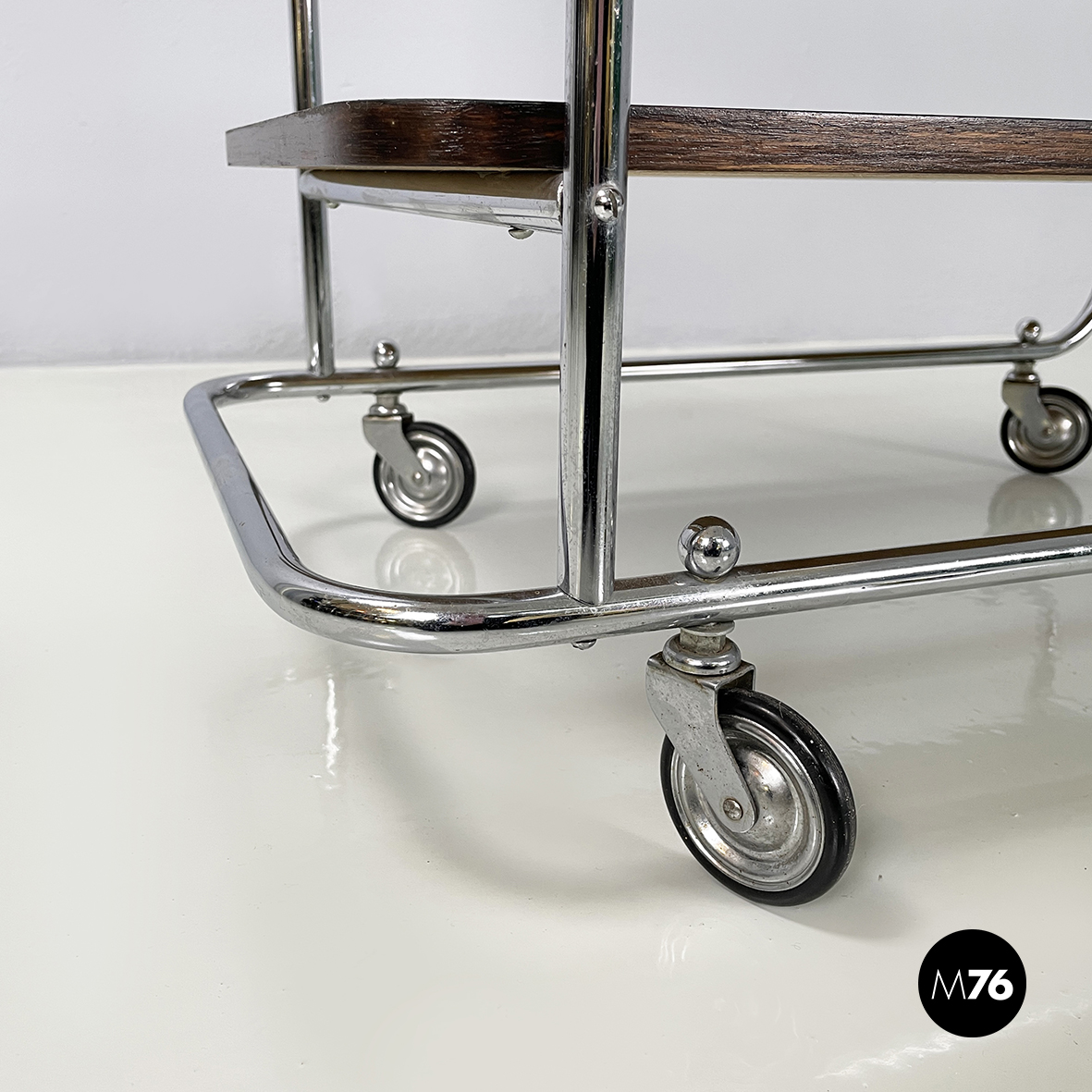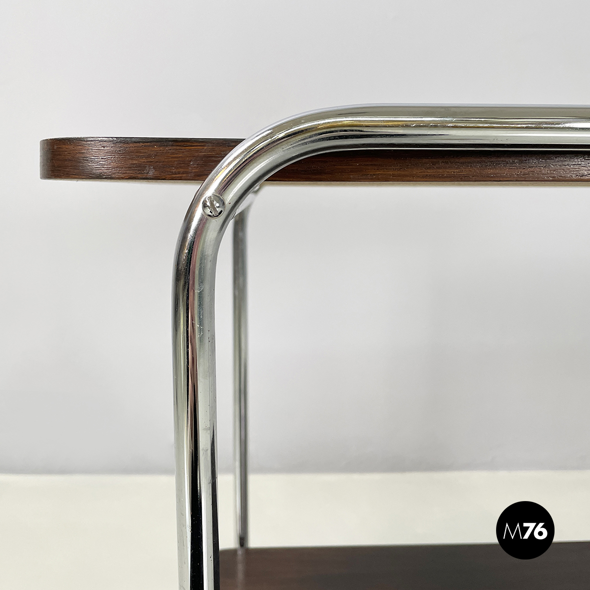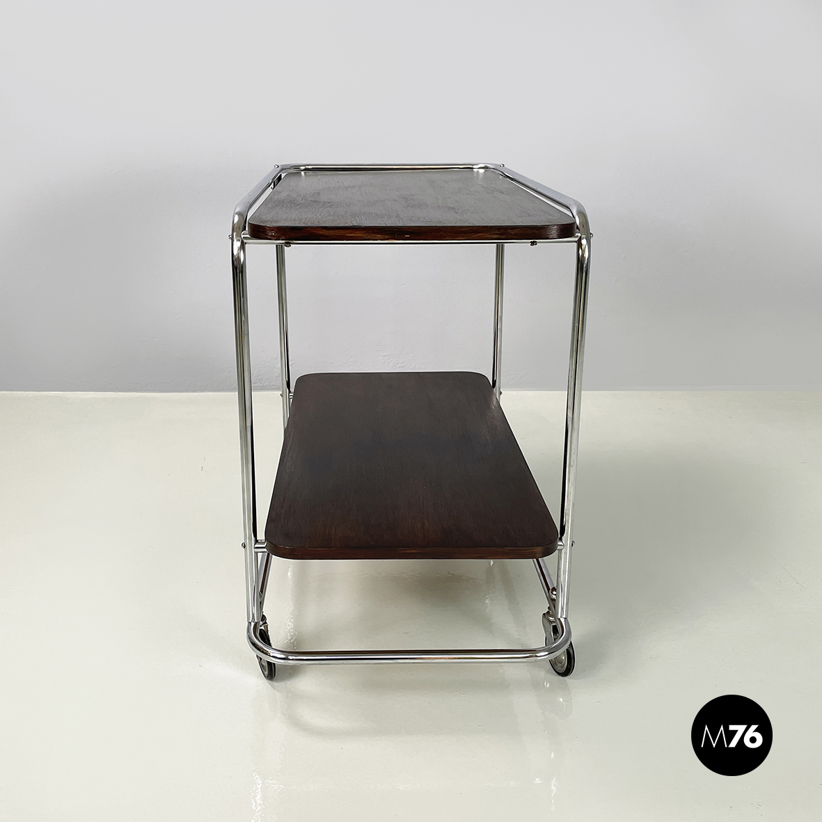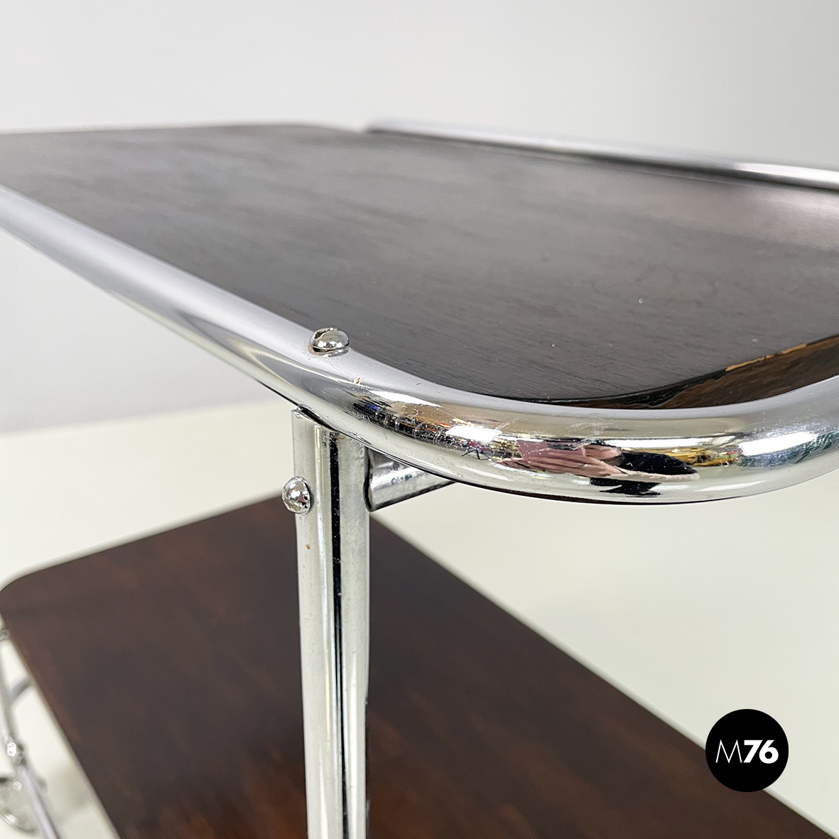 Carrello portavivande con doppio ripiano ad angoli arrotondati in legno scuro. La struttura è in tondino di metallo. Ruote alla base.