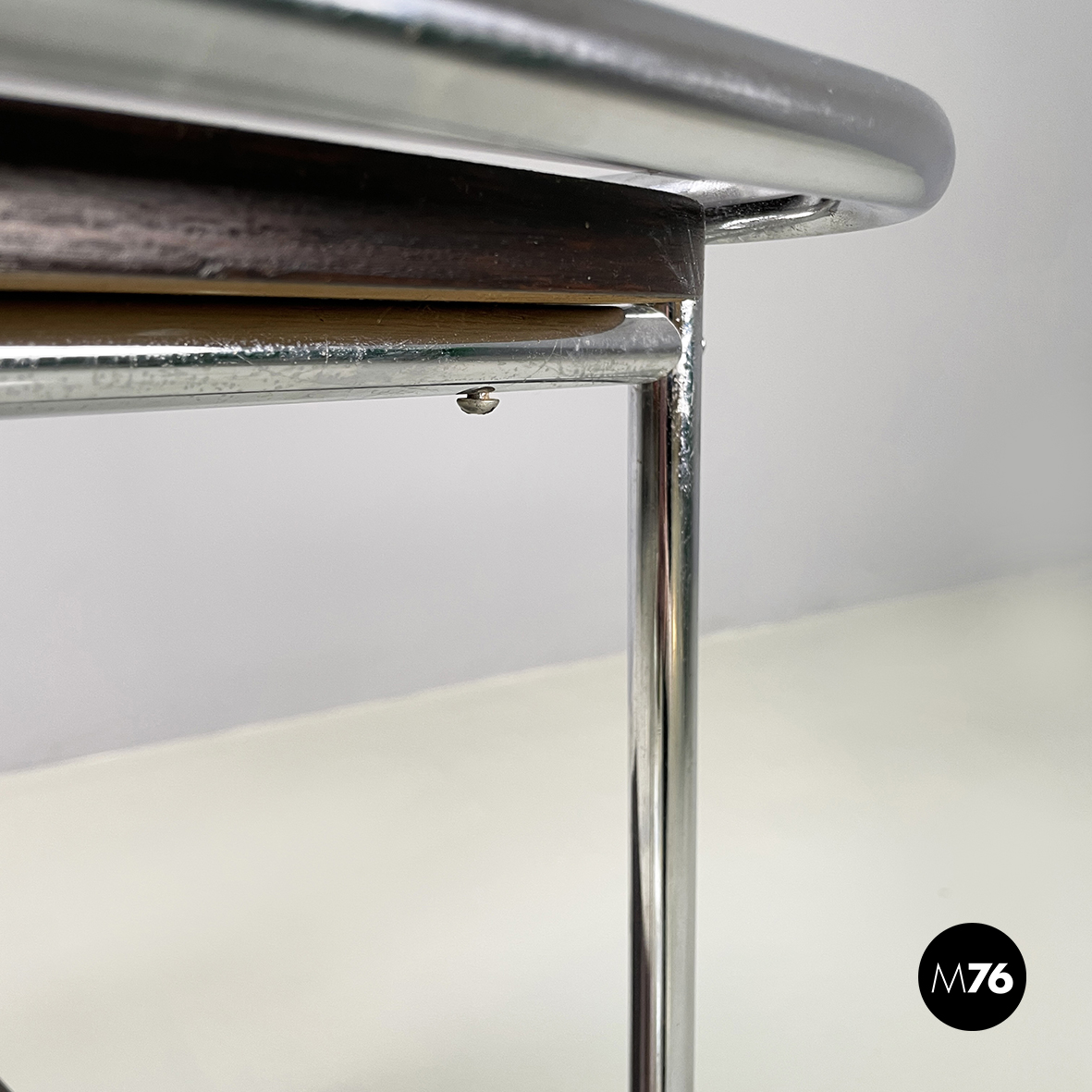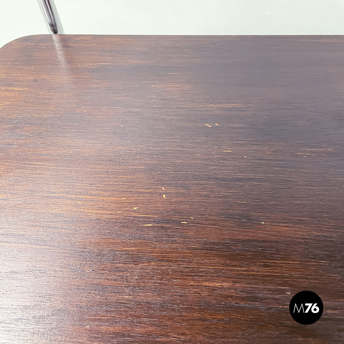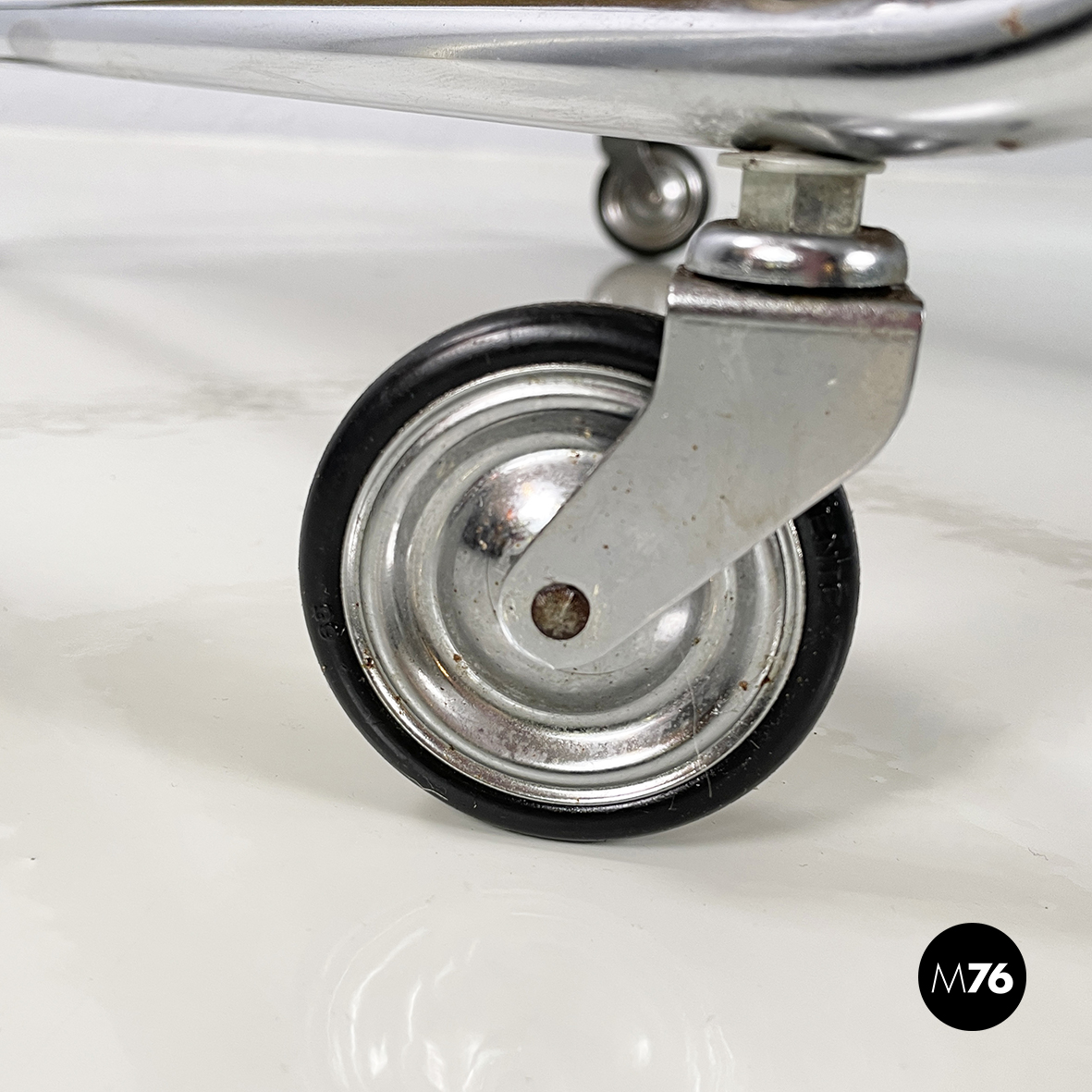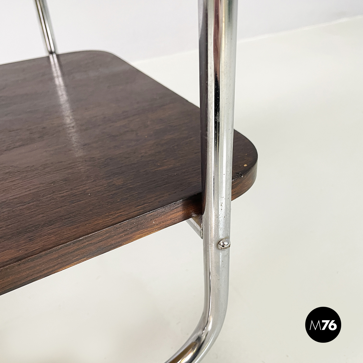 Carrello portavivande con doppio ripiano ad angoli arrotondati in legno scuro. La struttura è in tondino di metallo. Ruote alla base.