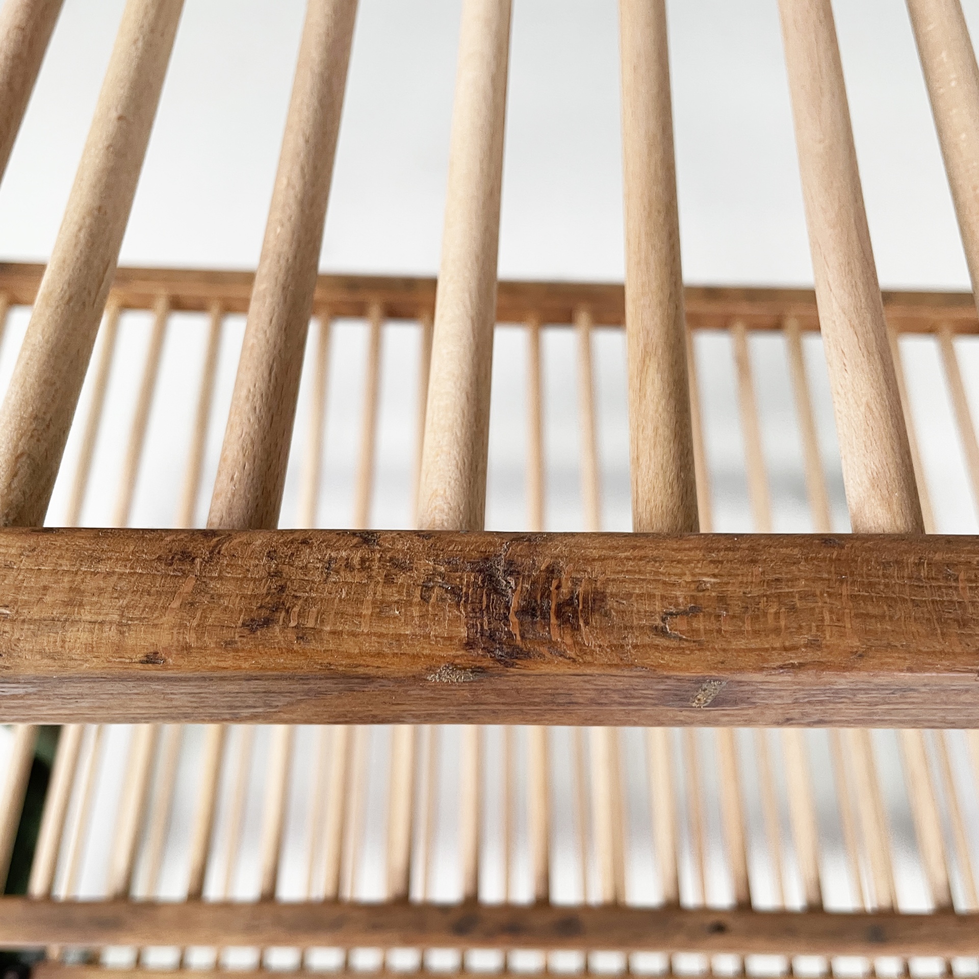 Carrello con quattro ripiani in legno e metallo verniciato verde. Ogni piano è composto da una serie di listelli a sezione tonda, incastrati in due listelli orizzontali a sezione squadrata. La struttura è composta da due tubolari verticali con listelli orizzontali, in metallo verde. Alla base sono presenti quattro ruote.