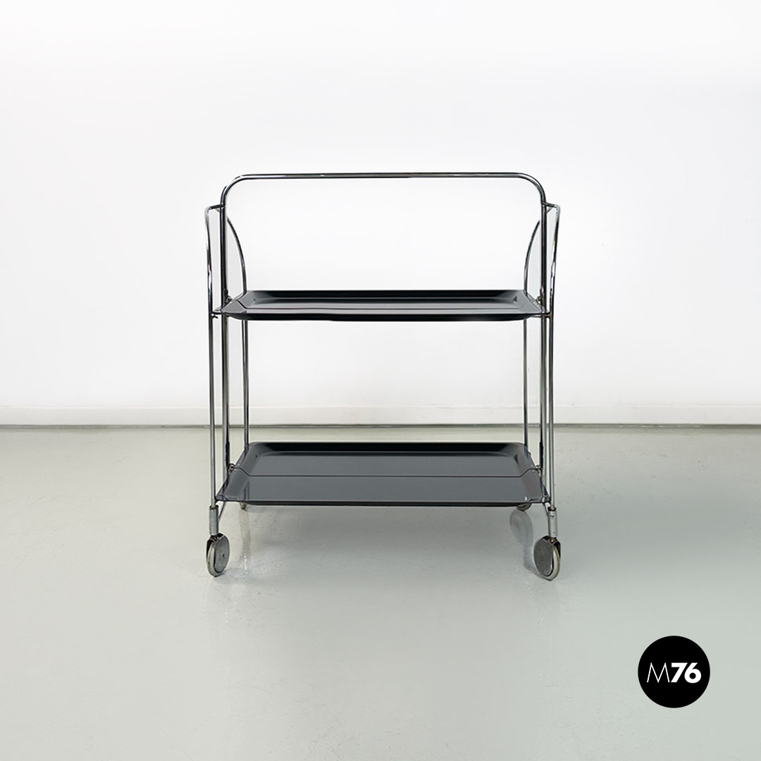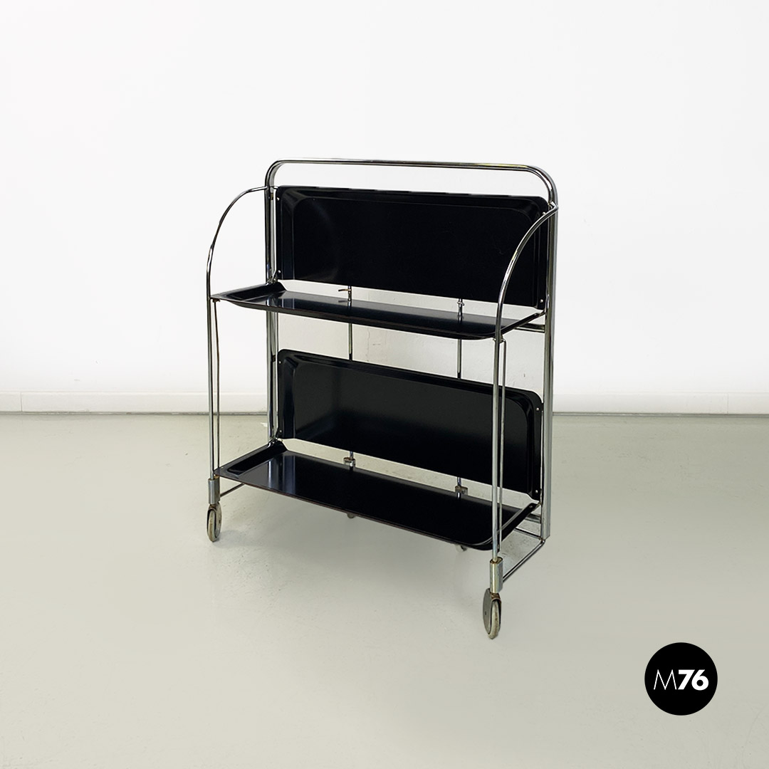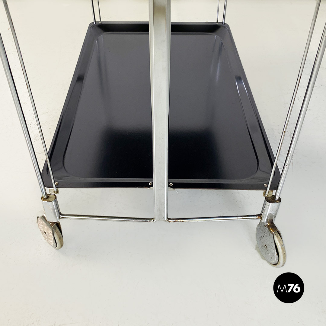 Carrello portavivande con struttura in tondino di metallo cromato utilizzabile aprendo una o entrambe le metà che lo compongono e totalmente richiudibile su se stesso. Provvisto di due ripiani d’appoggio apribili simultaneamente in plastica nera lucida. Molto stabile e ben conservato. Ruote alla base.