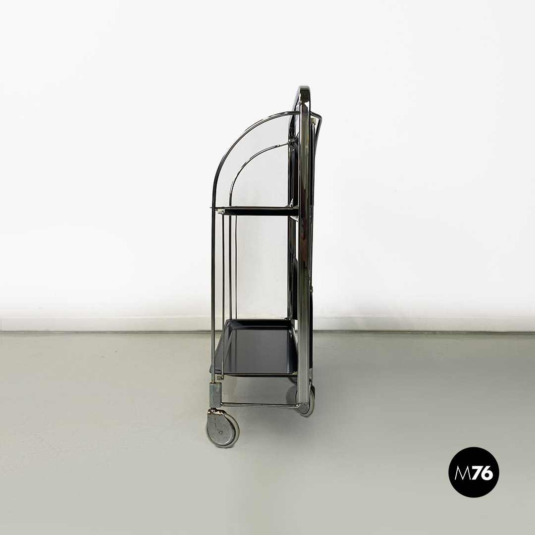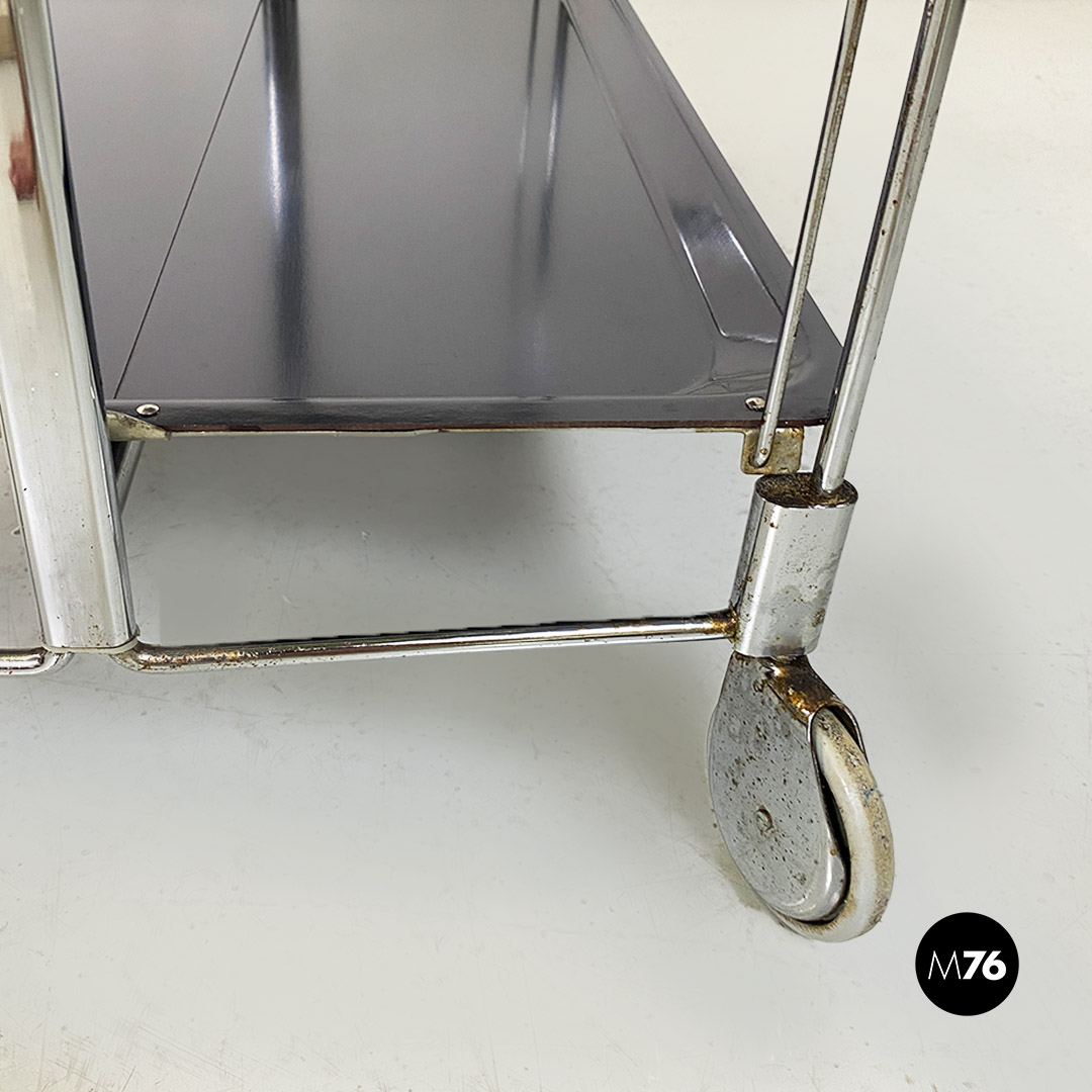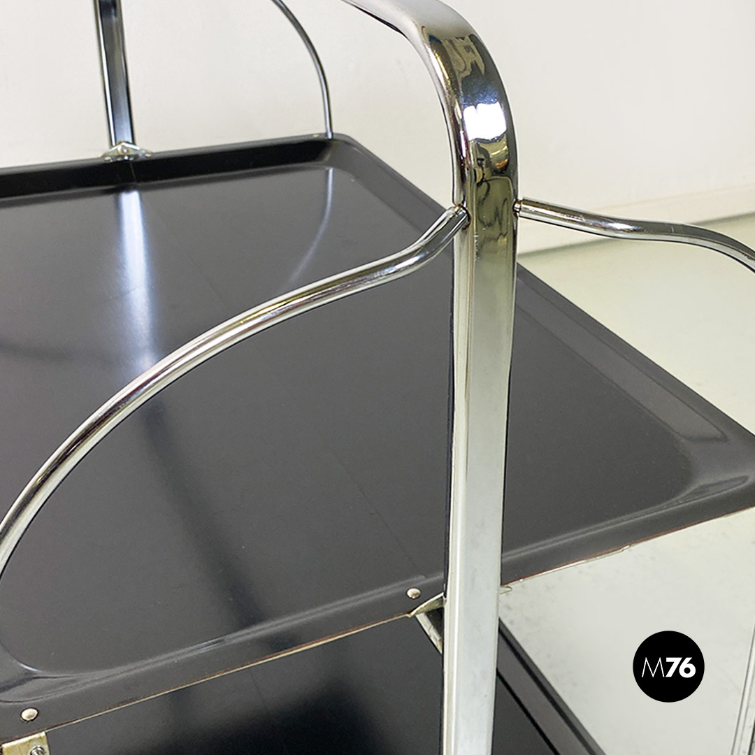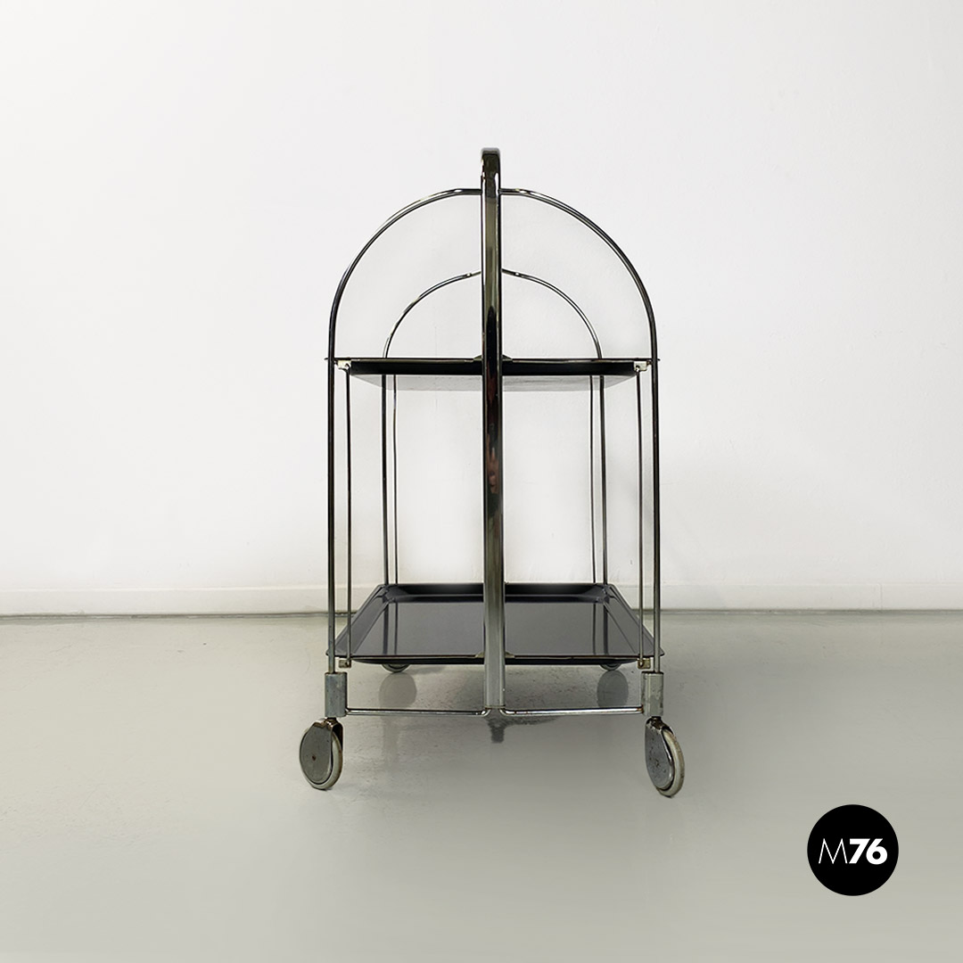 Carrello portavivande con struttura in tondino di metallo cromato utilizzabile aprendo una o entrambe le metà che lo compongono e totalmente richiudibile su se stesso. Provvisto di due ripiani d’appoggio apribili simultaneamente in plastica nera lucida. Molto stabile e ben conservato. Ruote alla base.