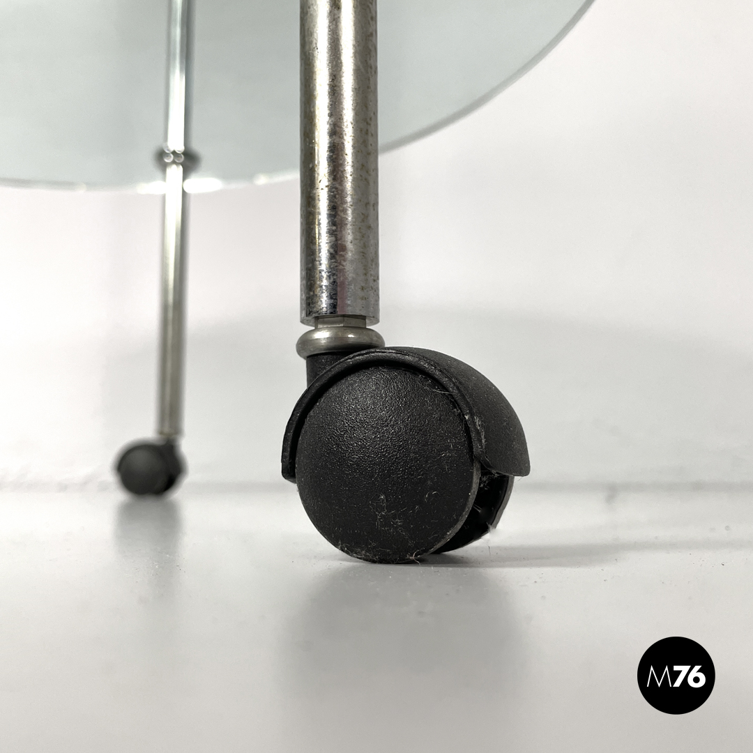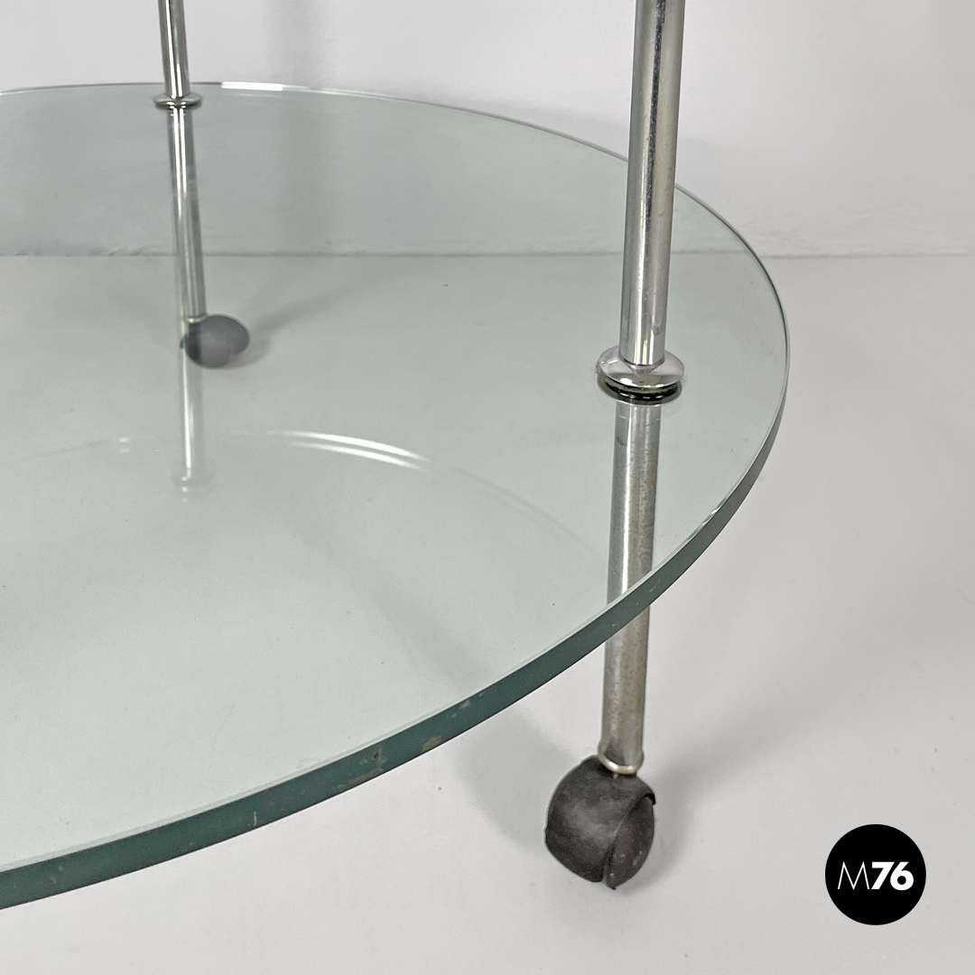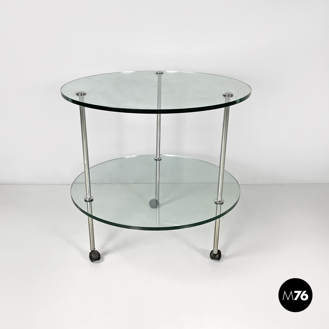 Carrello modello T6 a base tonda. Presenta due piani in vetro trasparente tondi, con tre steli in tondino metallo cromato che fanno da struttura portante e che terminano con tre ruote in plastica nera. Utilizzabile anche come tavolo da caffè.