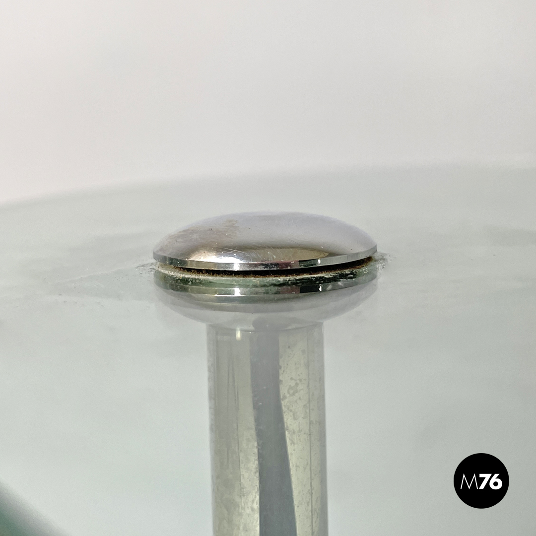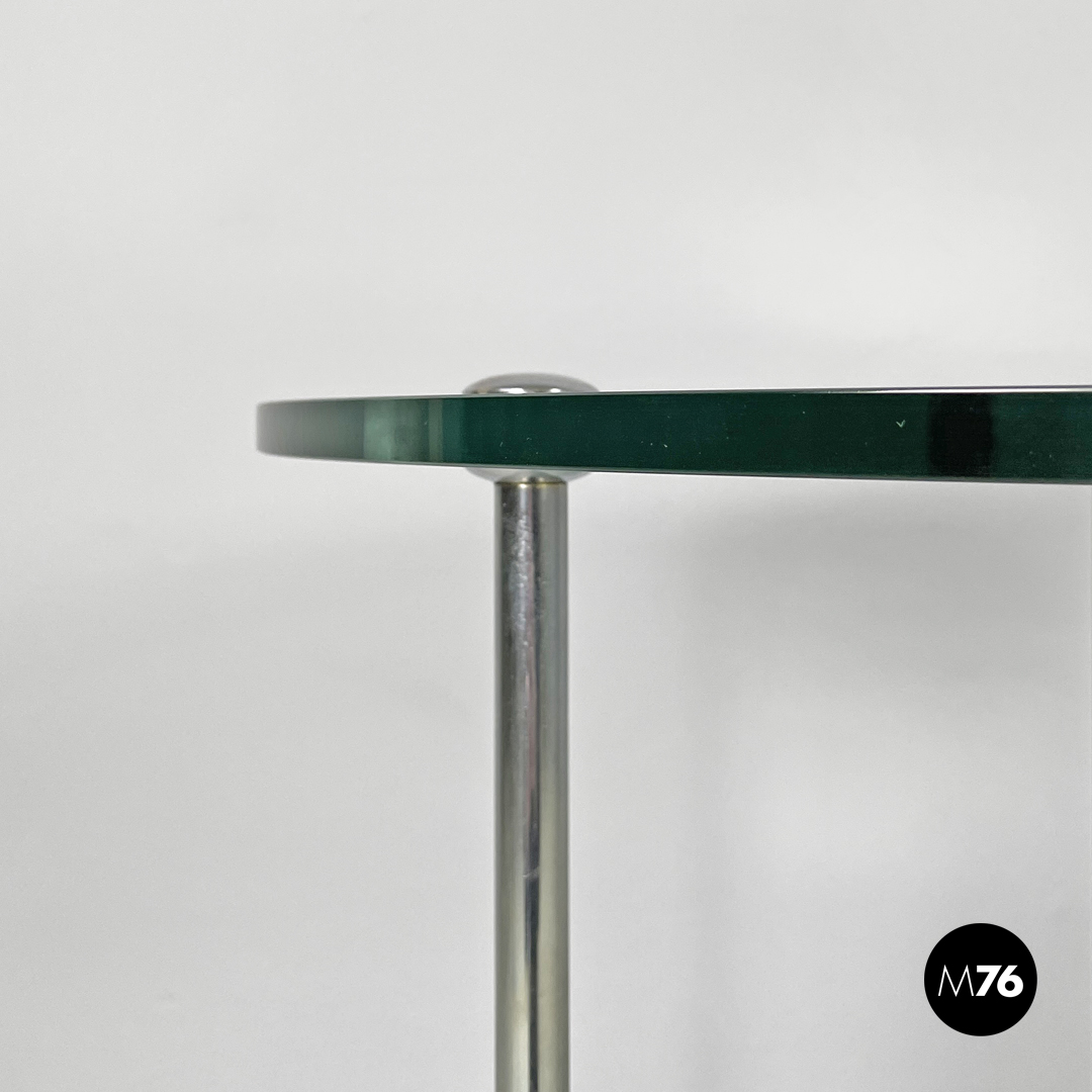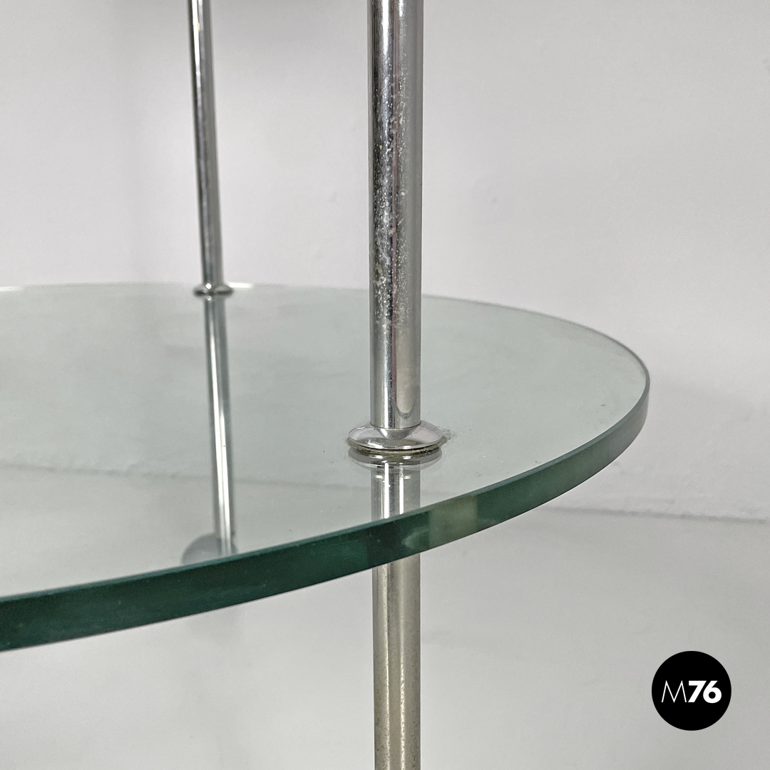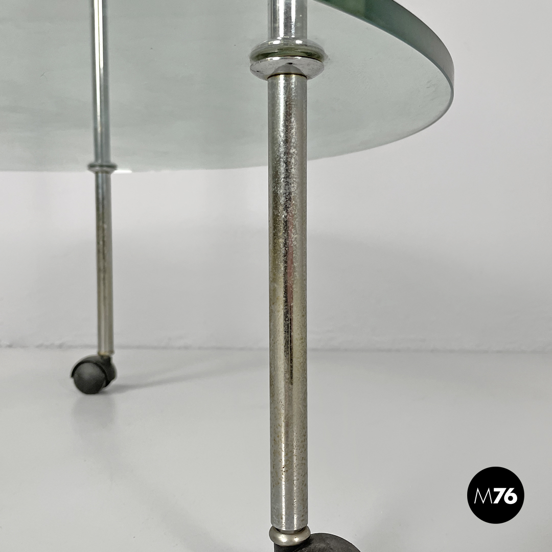 Carrello modello T6 a base tonda. Presenta due piani in vetro trasparente tondi, con tre steli in tondino metallo cromato che fanno da struttura portante e che terminano con tre ruote in plastica nera. Utilizzabile anche come tavolo da caffè.