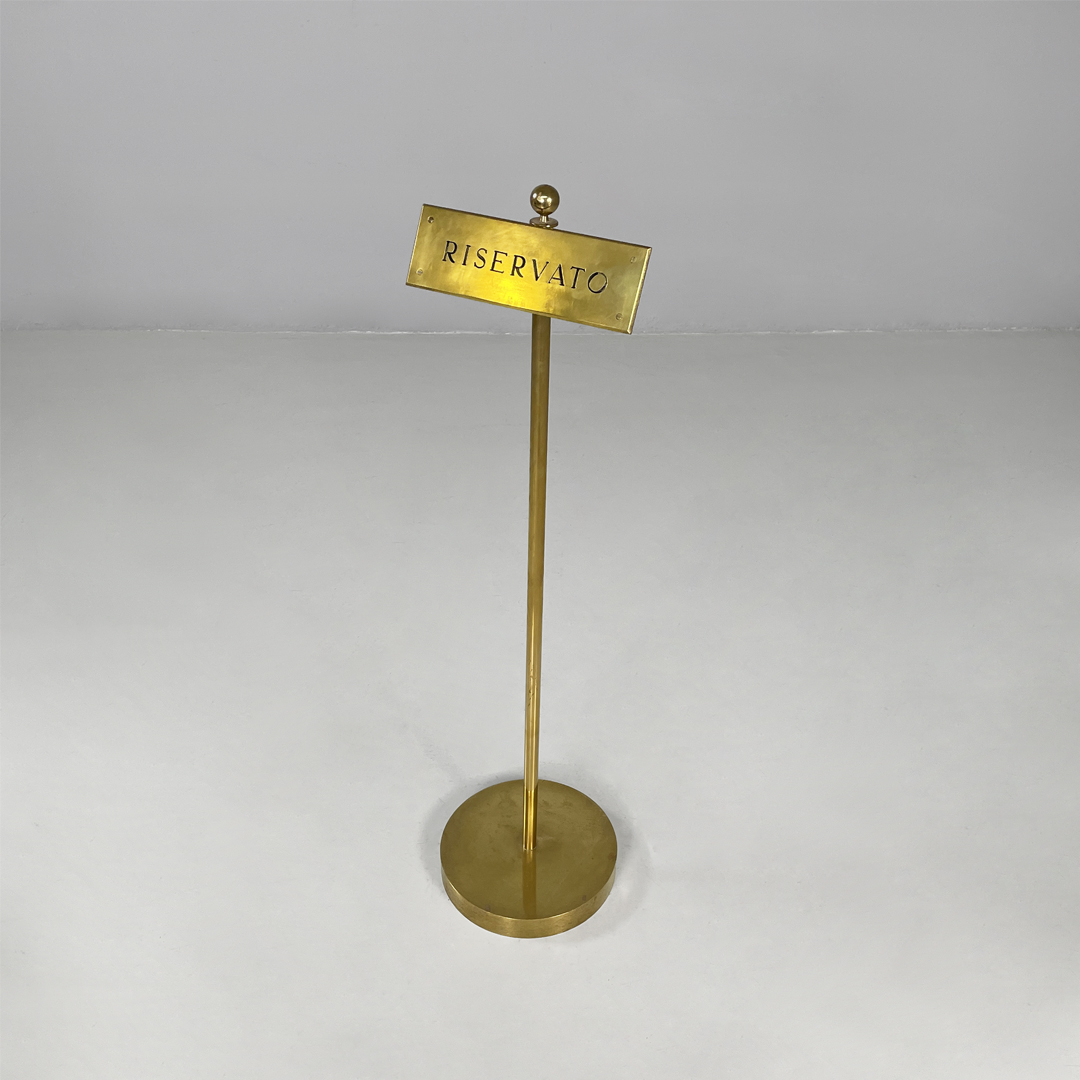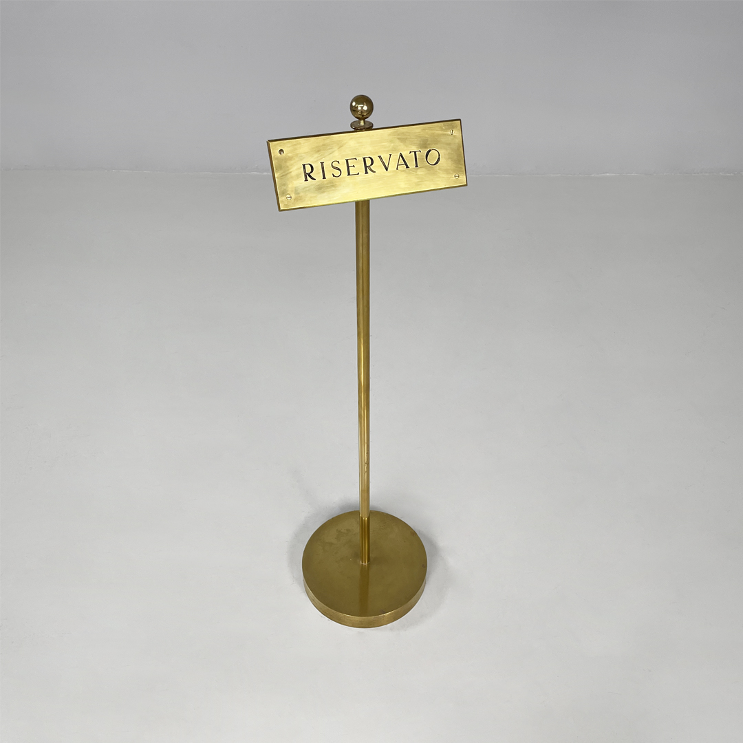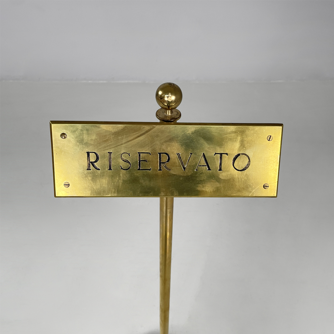 Cartello o piantana interamente in ottone. Sulla parte frontale si trova una targa con scritta “riservato” di colore nero. L’asta centrale presenta un pomello decorativo sulla parte superiore e termina con una base tonda.