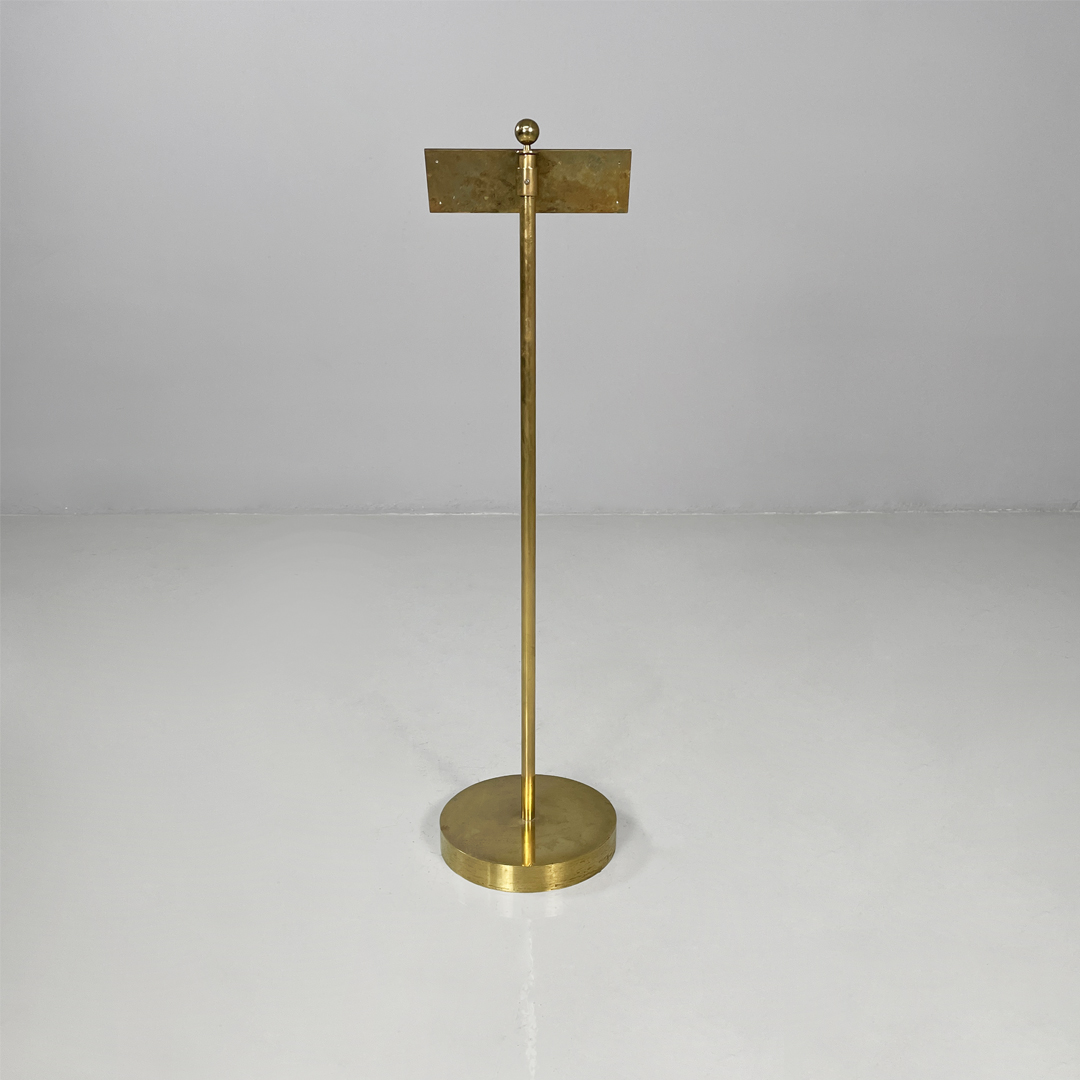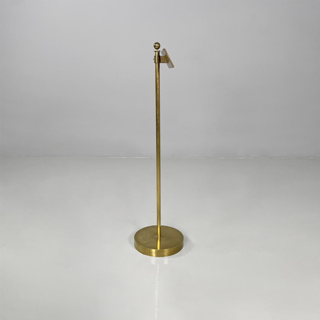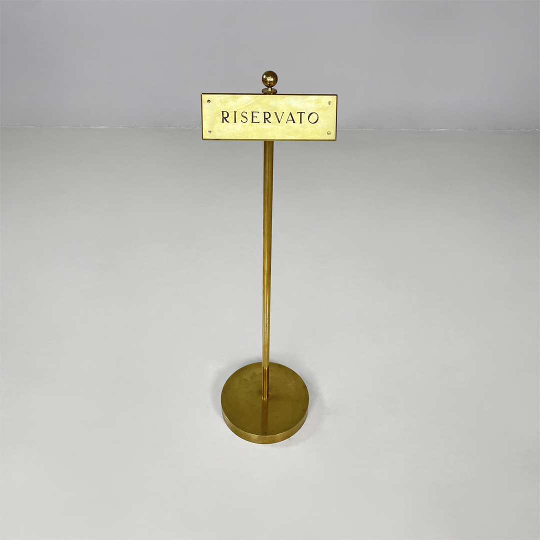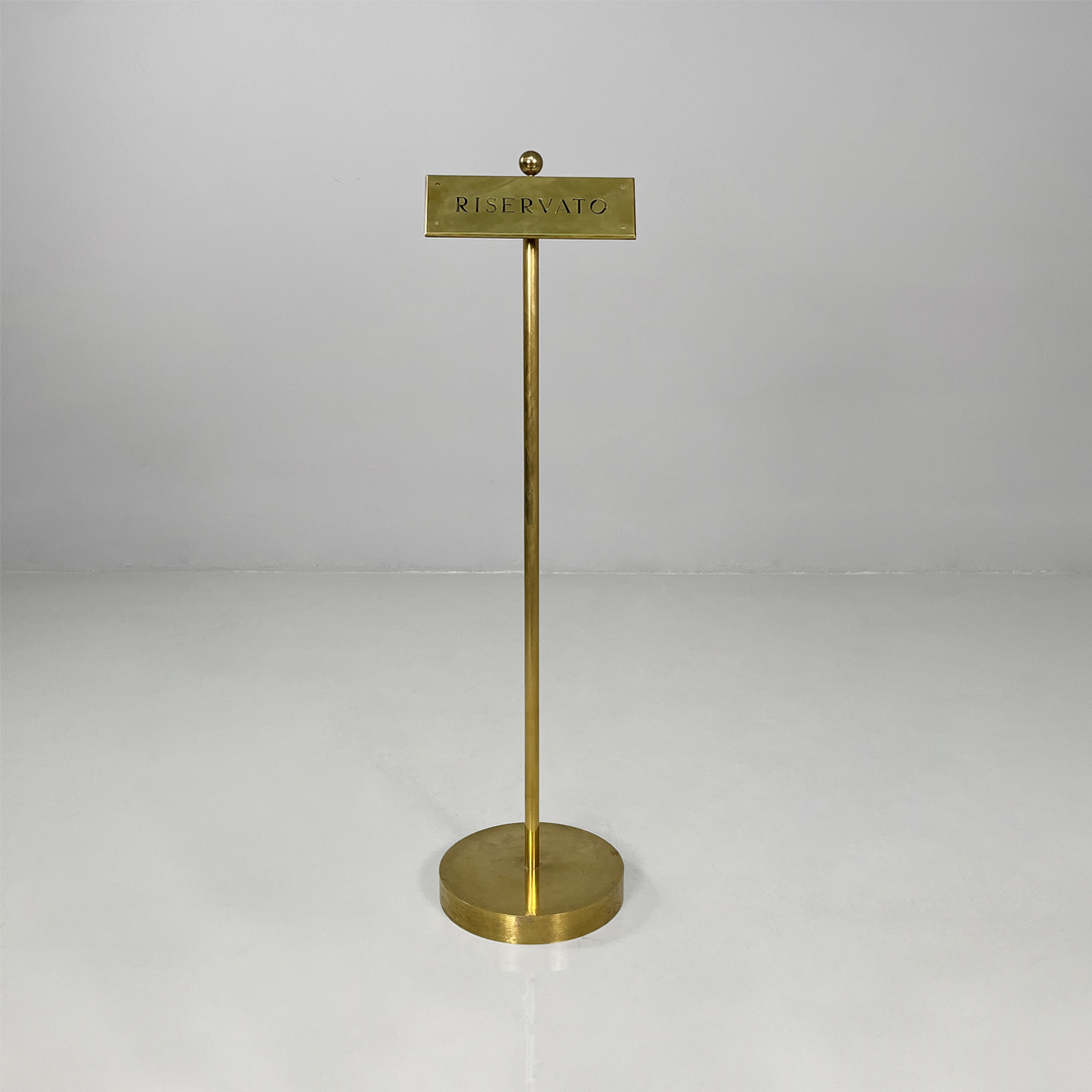 Cartello o piantana interamente in ottone. Sulla parte frontale si trova una targa con scritta “riservato” di colore nero. L’asta centrale presenta un pomello decorativo sulla parte superiore e termina con una base tonda.