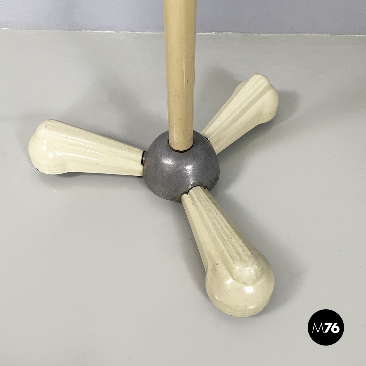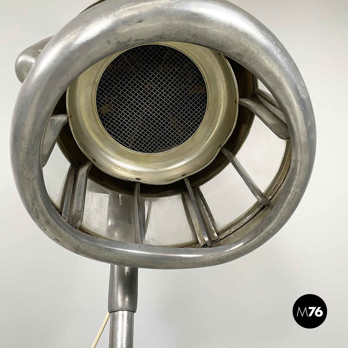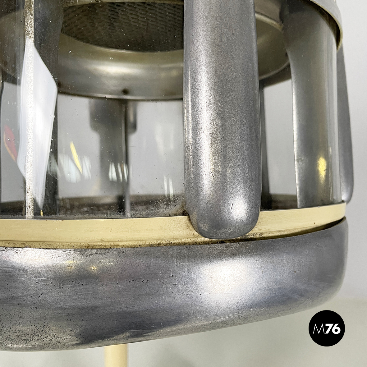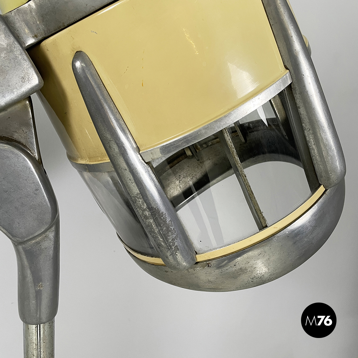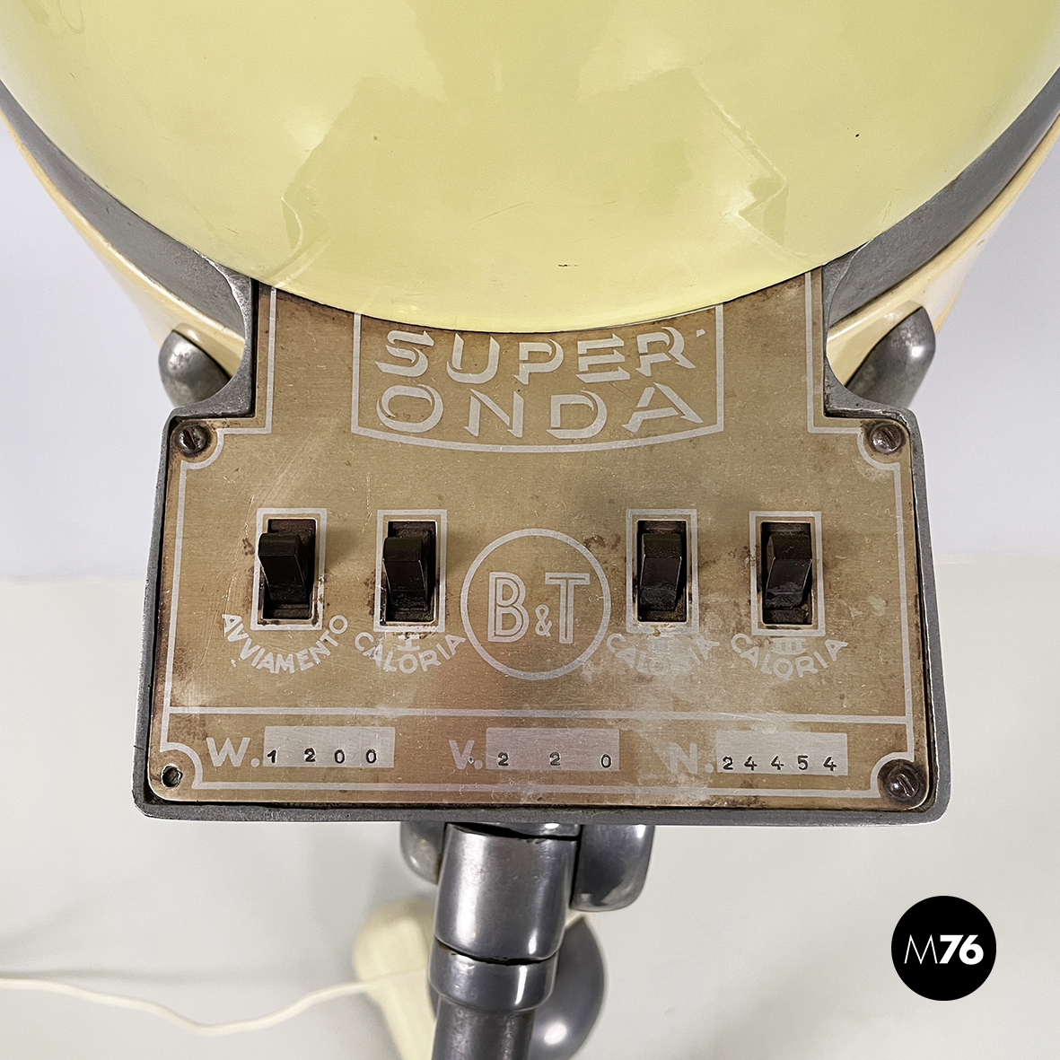 Casco da parrucchiere da terra in metallo. Il casco a forma di cupola presenta inserti in metallo verniciato giallo, in plastica trasparente e metallo. Sul retro presenta una maniglia per poter muovere il casco e una pannello di controllo per le varie funzioni. La struttura in tubolare di metallo è ad altezza regolabile. La base a tre razze con ruote è in metallo e in metallo verniciato bianco-beige.