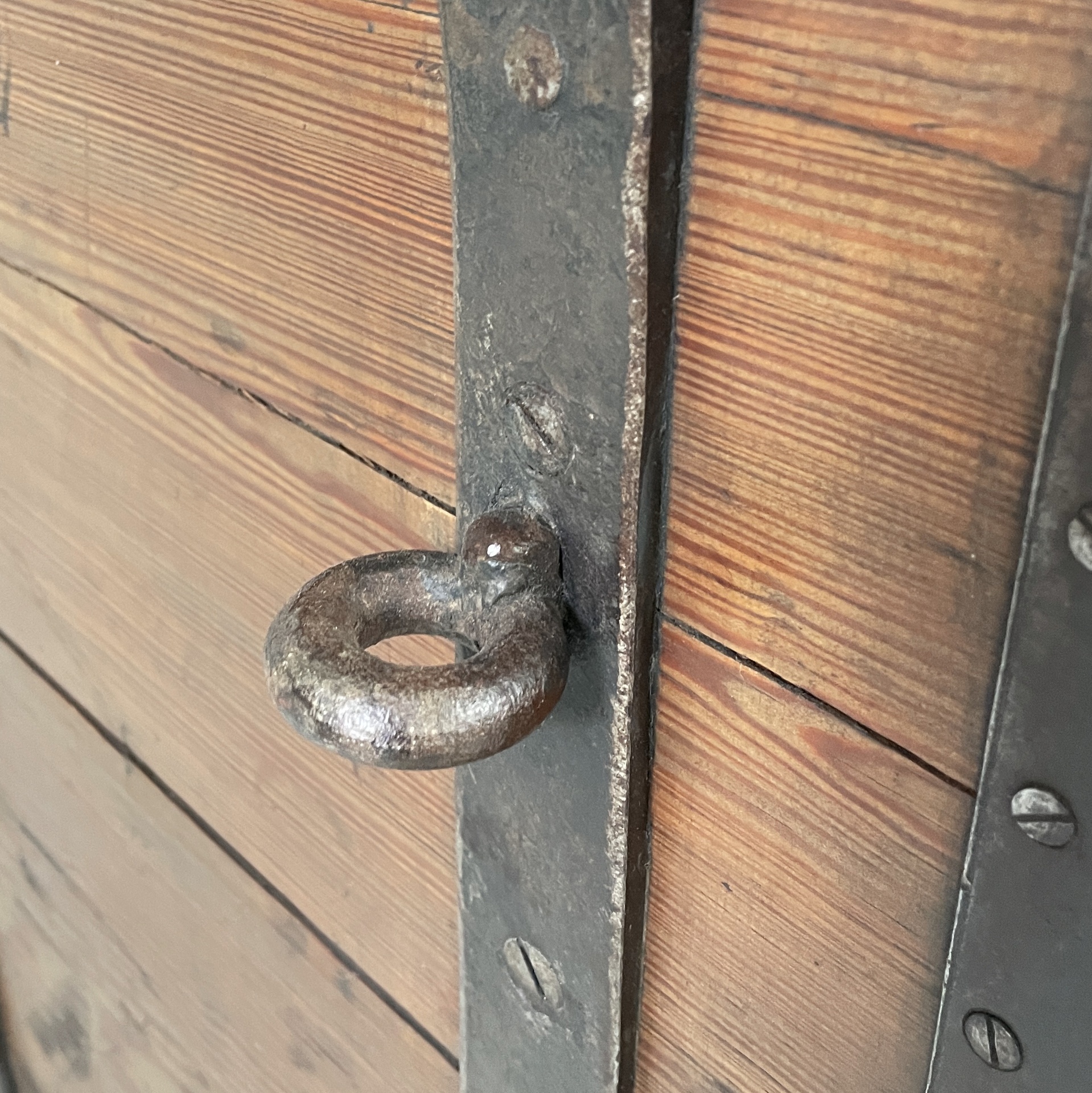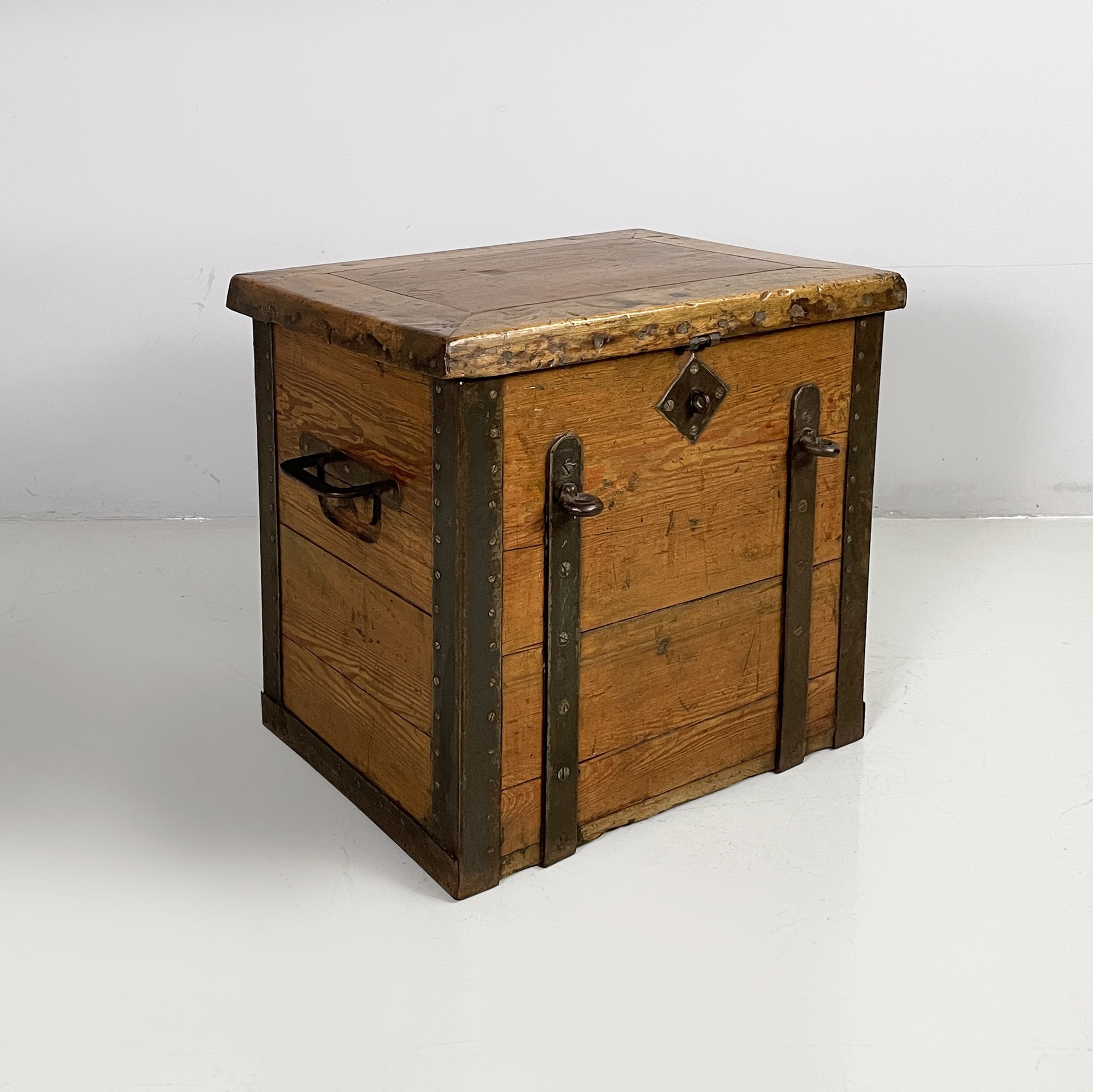 Cassa con coperchio a base rettangolare in legno con dettagli in metallo. Ai lati sono presenti due manici in metallo. Utilizzabile come mobile contenitore. In stile 1800 ca.
