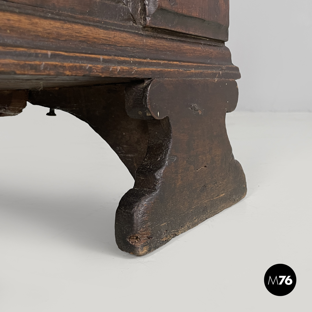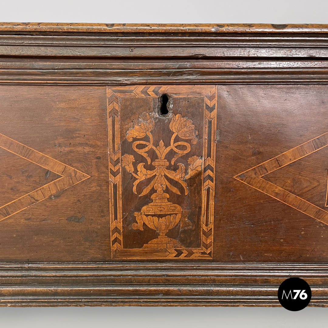Cassapanca rettangolare in legno con piano a ribalta. La parte frontale della struttura è riccamente decorata con intarsi dalle forme floreali e geometriche. Presenta quattro piedini in legno, i due posteriori sono a sezione rettangolare mentre i due frontali si allargano verso l’appoggio a terra.