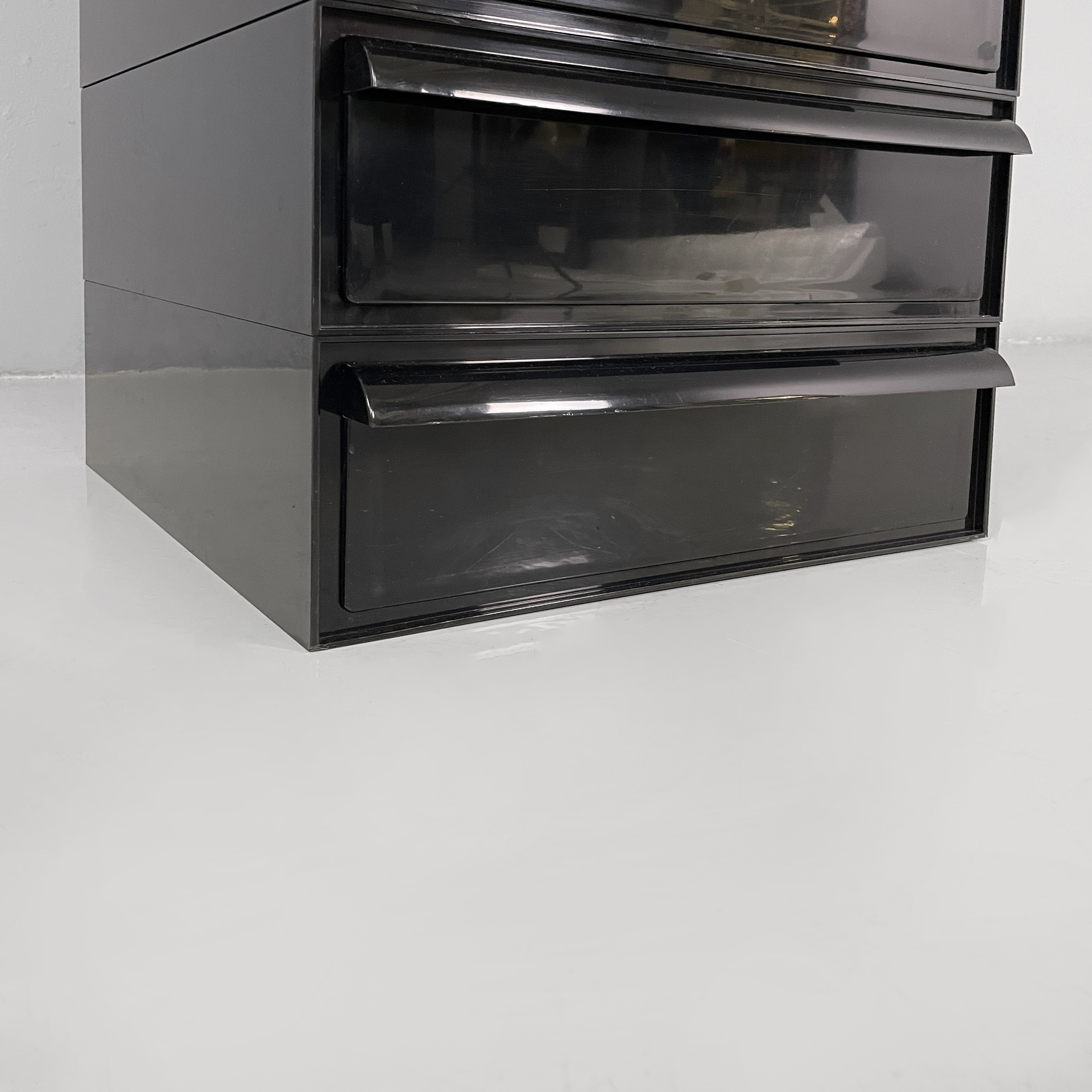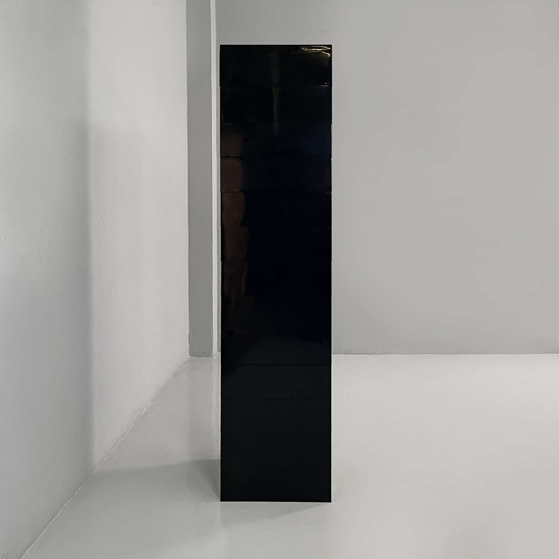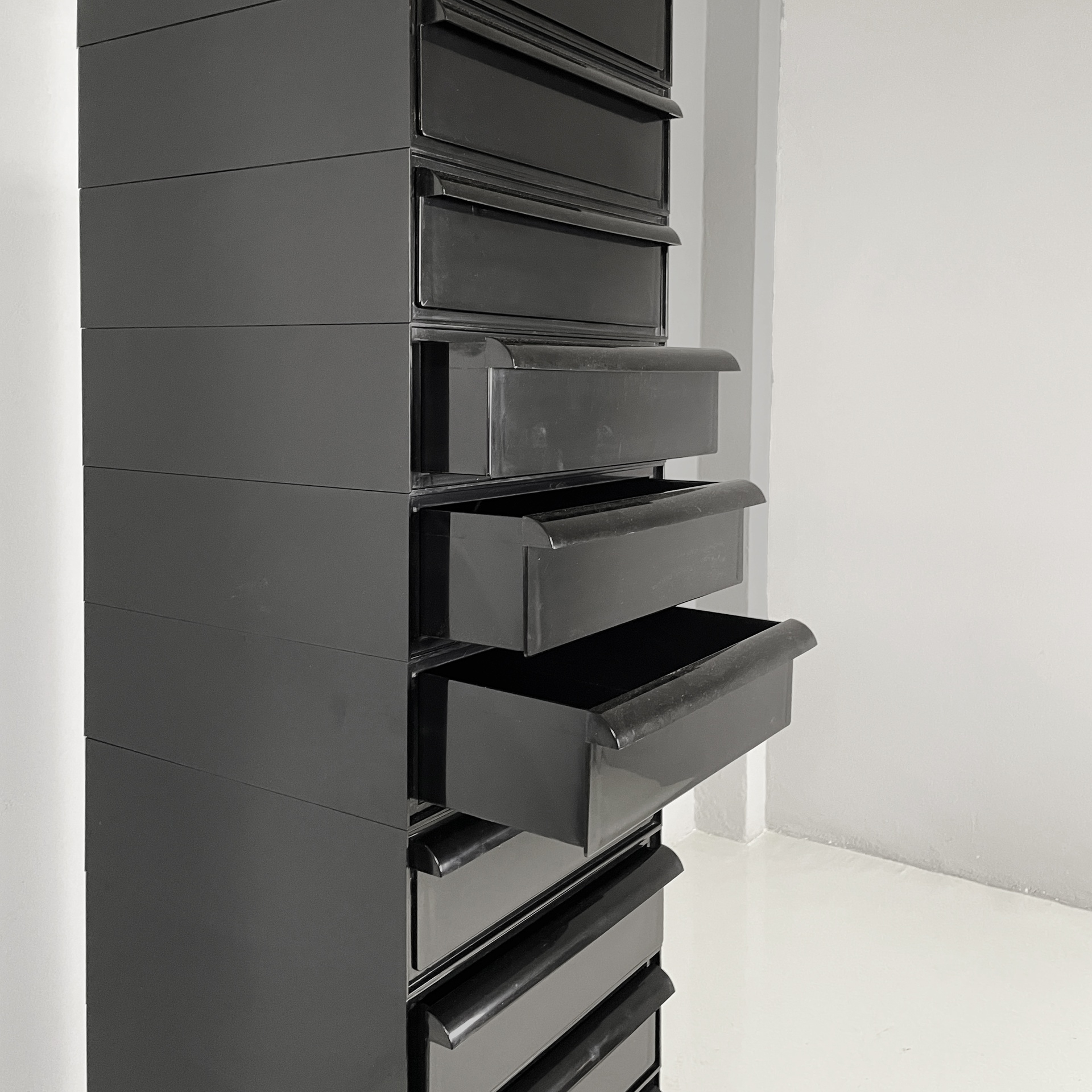 Cassettiera modulare modello 4602 a base quadrata interamente in plastica nera. I tredici cassetti presentano una maniglia con profilo a triangolo stondato, lunga quanto il cassetto.