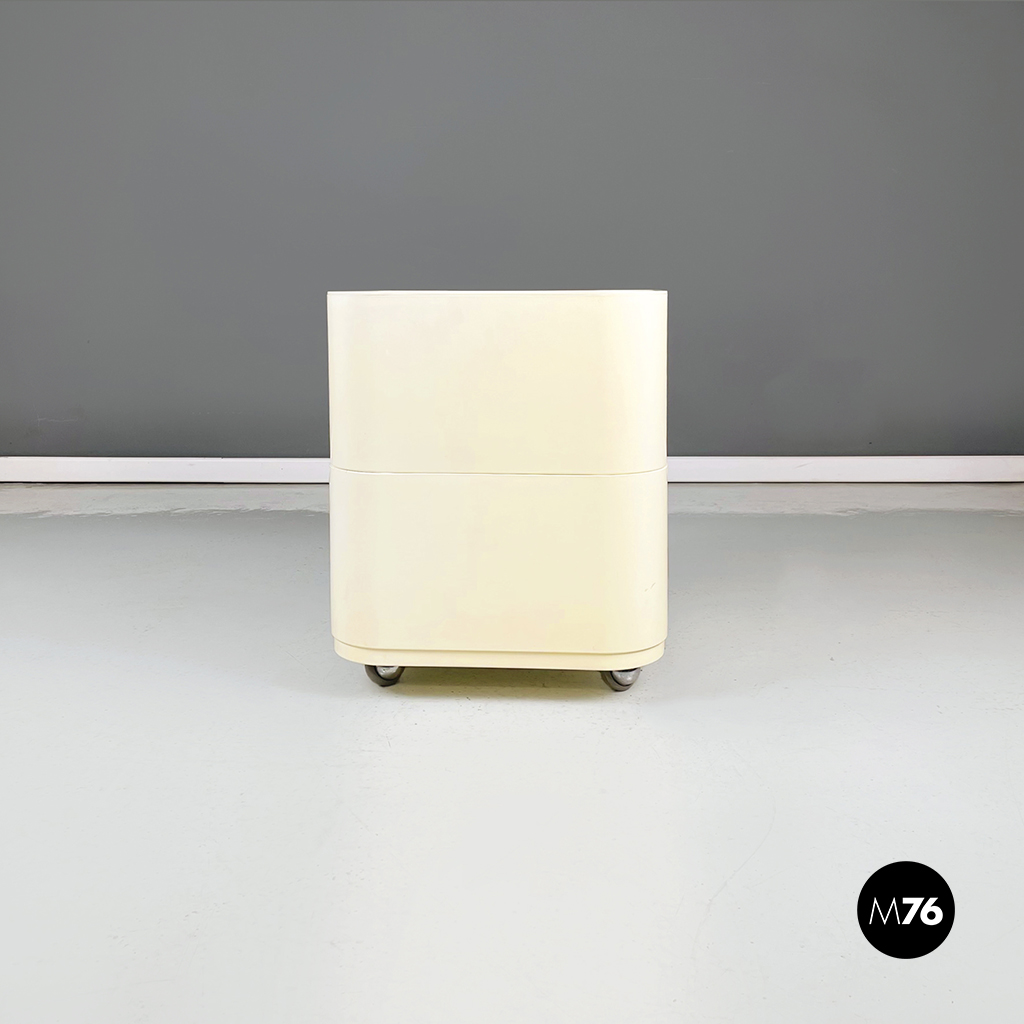 Cassettiera modulare a base quadrata con angoli arrotondati in plastica bianca. La cassettiera presenta due vani aperti. Rotelle alla base.