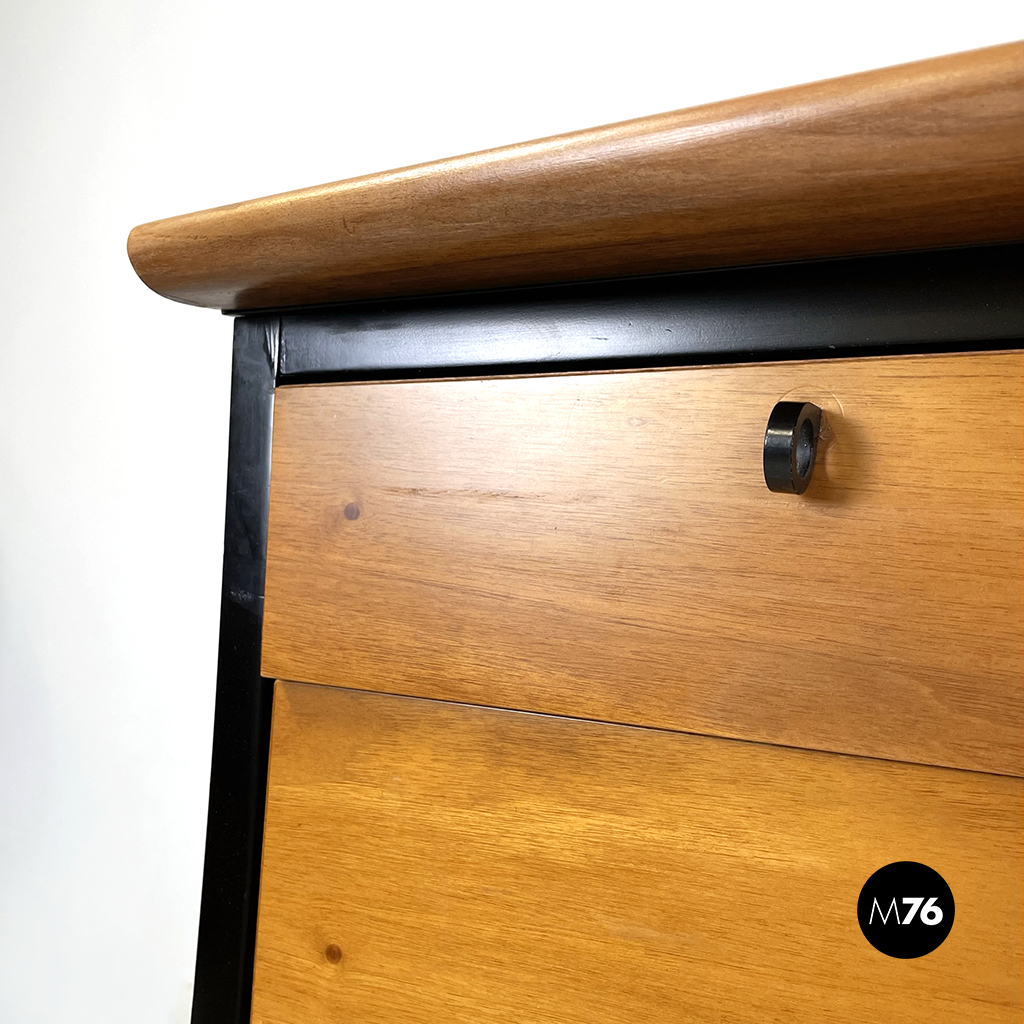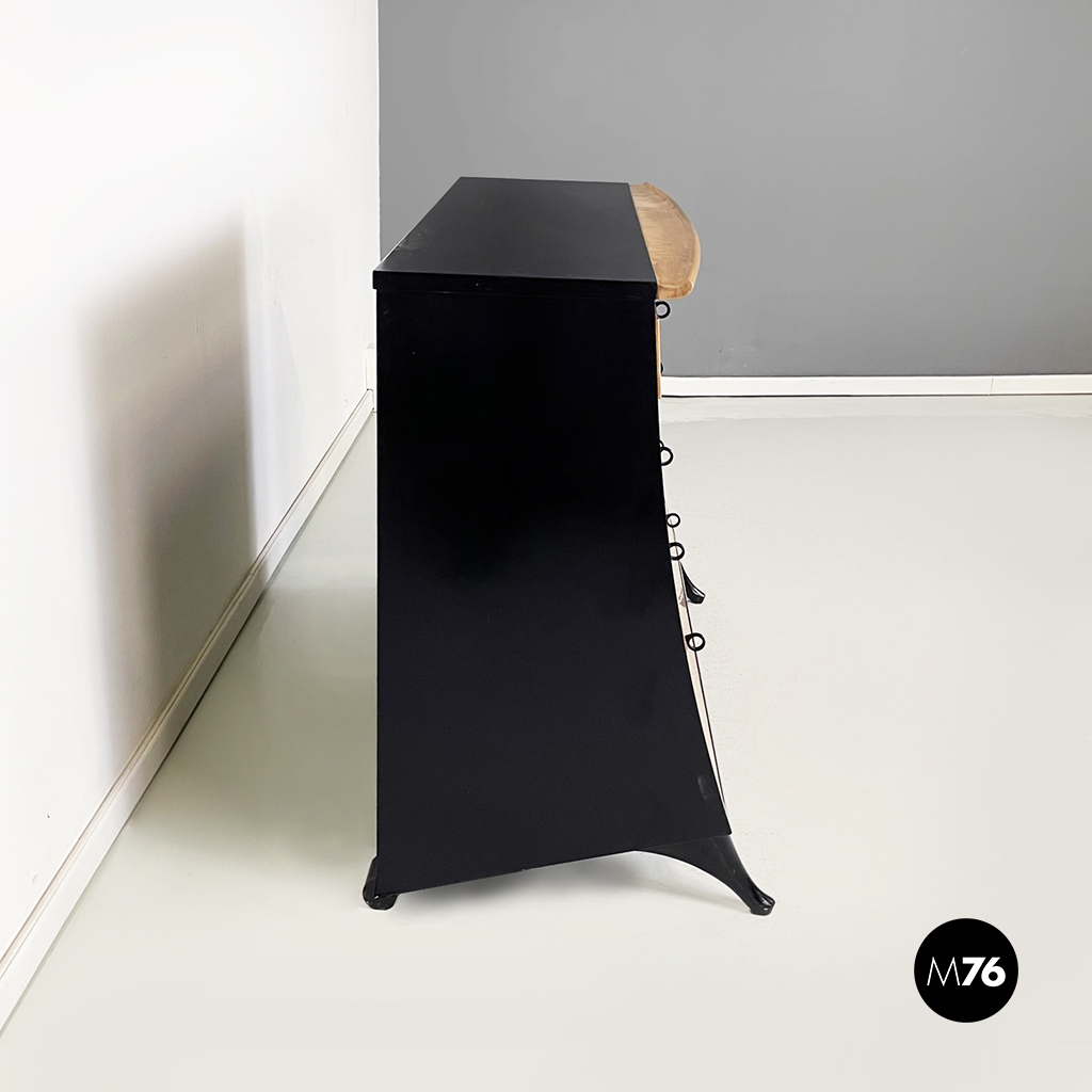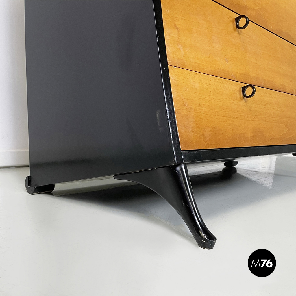 Cassettiera a sbalzo con profilo curvato e struttura in legno massello in colorazione chiara e legno verniciato nero. Sul fronte presenta 8 cassetti di differenti dimensioni con maniglia ad anello in legno nero opaco. Le zampe anteriori sono rialzate a sezione tonda curvata, mentre le posteriori sono di forma cilindrica.