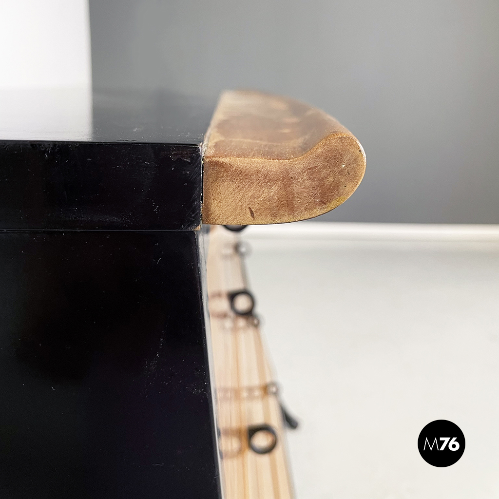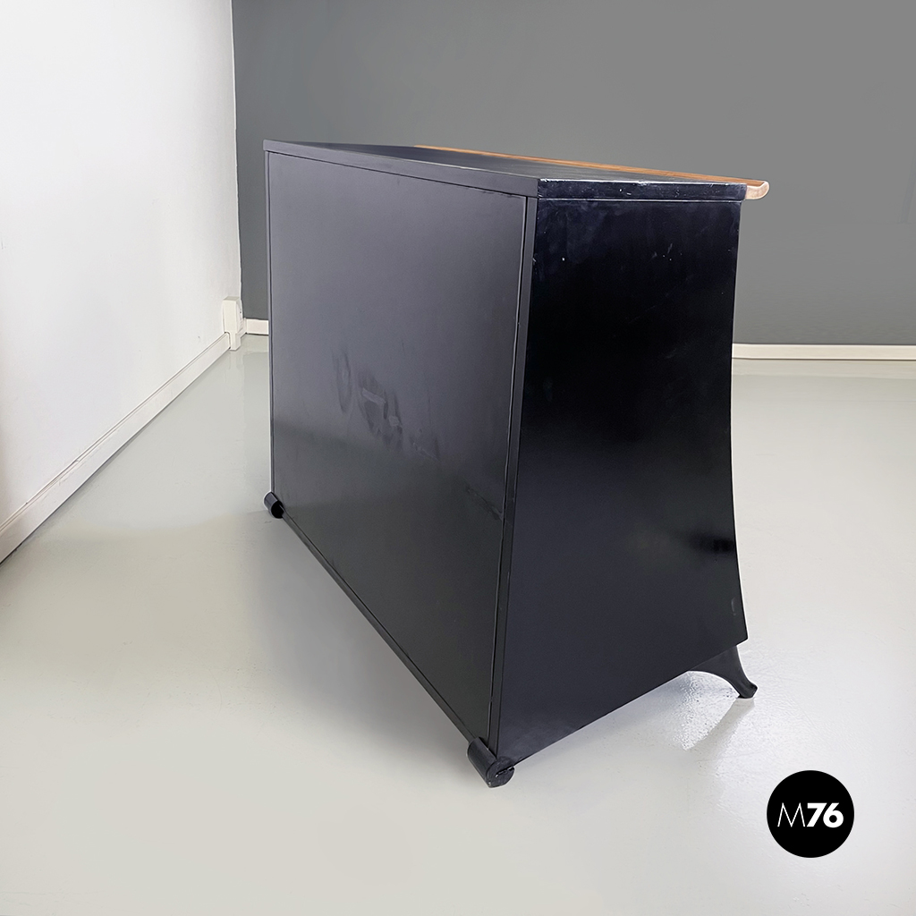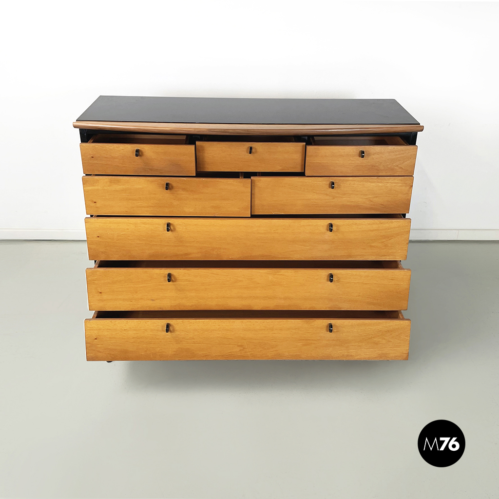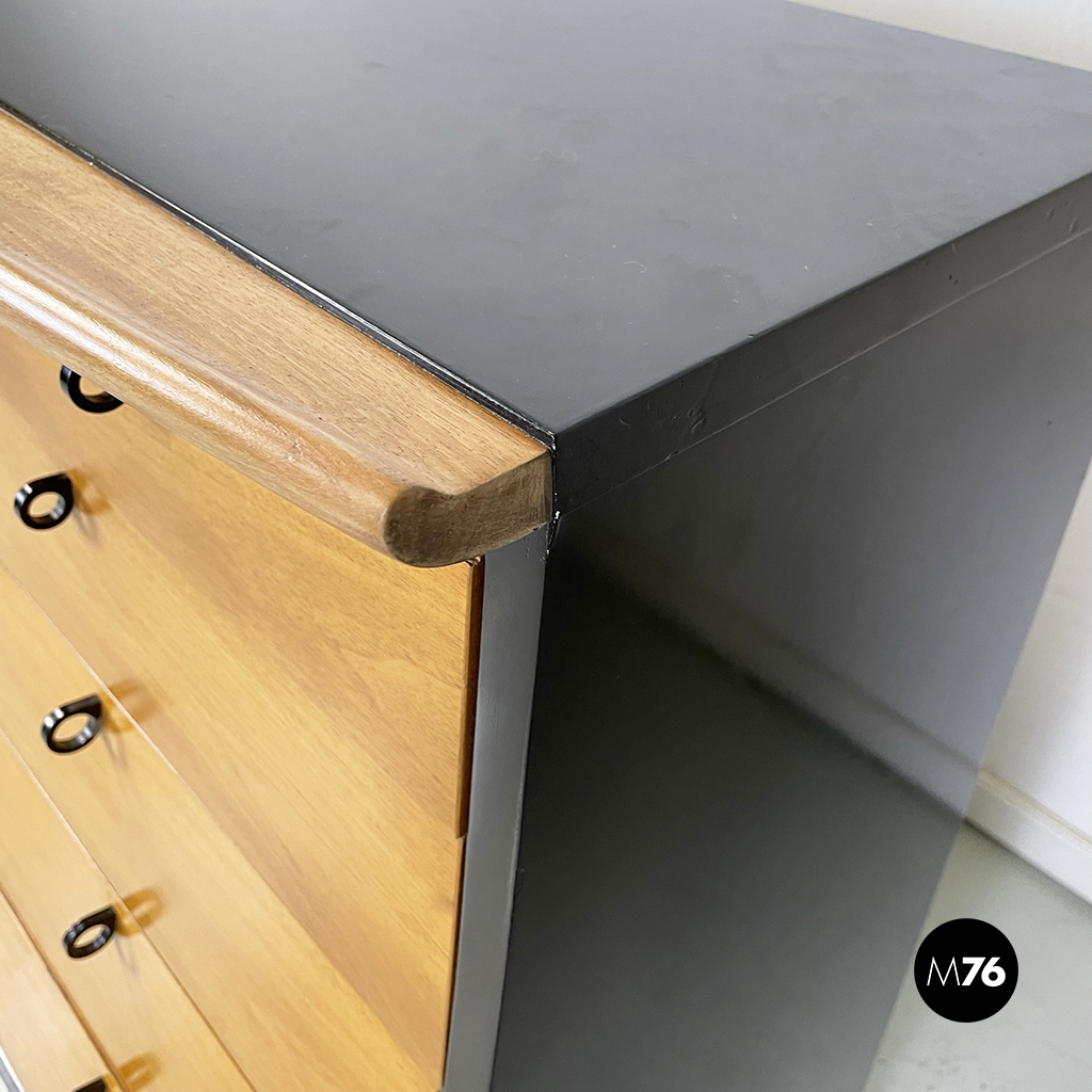 Cassettiera a sbalzo con profilo curvato e struttura in legno massello in colorazione chiara e legno verniciato nero. Sul fronte presenta 8 cassetti di differenti dimensioni con maniglia ad anello in legno nero opaco. Le zampe anteriori sono rialzate a sezione tonda curvata, mentre le posteriori sono di forma cilindrica.