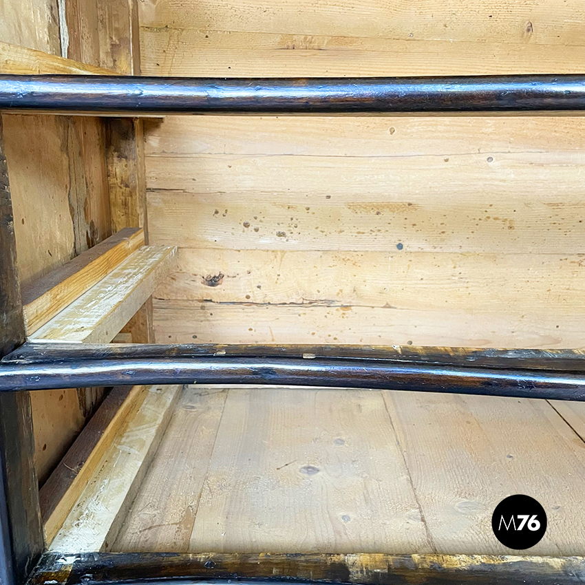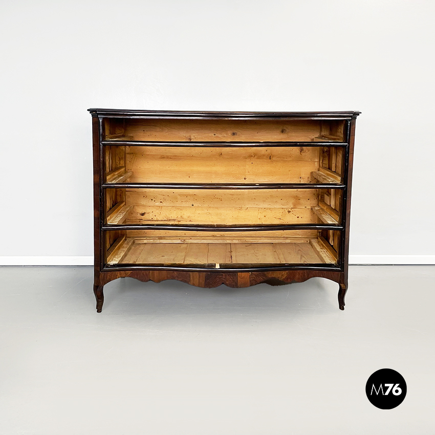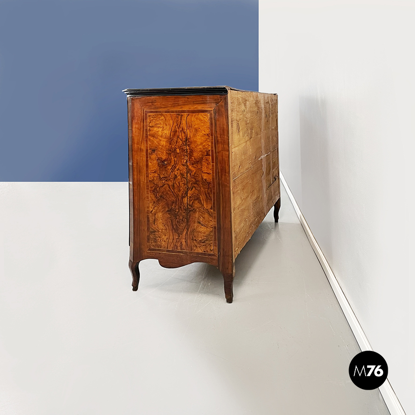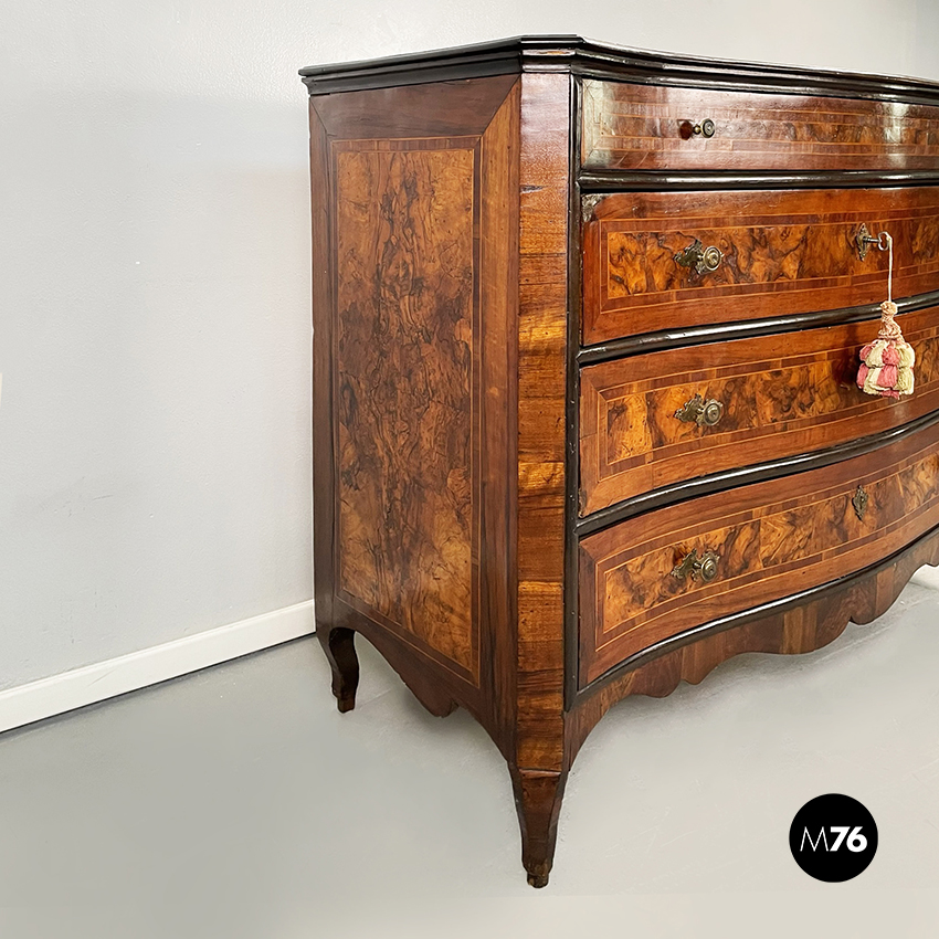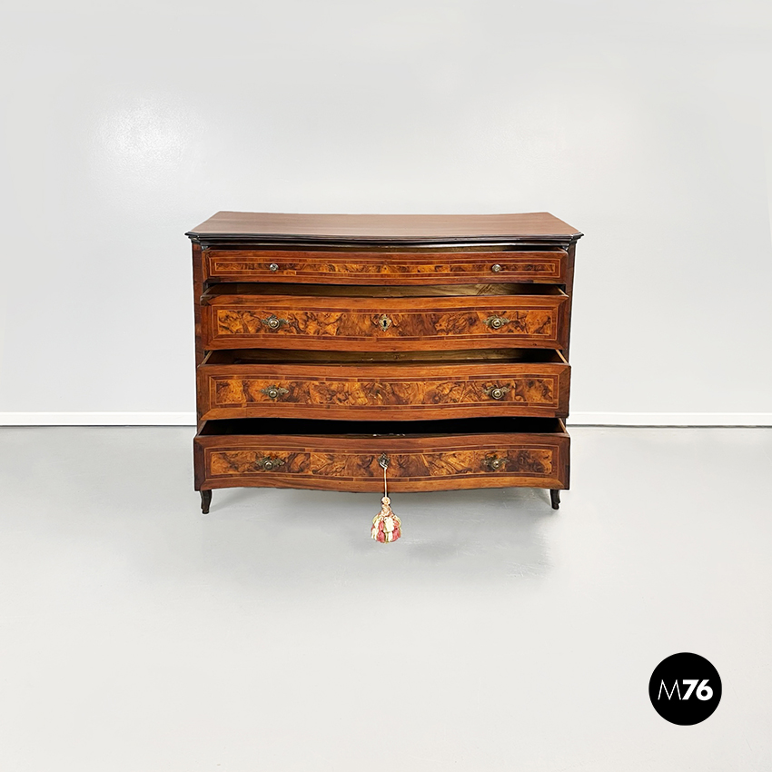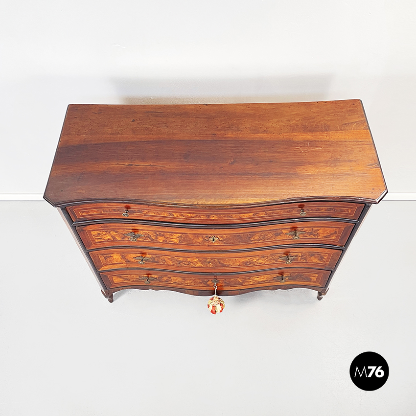 Cassettiera finemente lavorata in legno chiaro e scuro. I fianchi e il fronte, dove sono presenti i quattro cassetti, sono mossi e sagomati. Pomelli tondi bronzei. Due cassetti presentano serratura e chiave. In stile barocchetto.