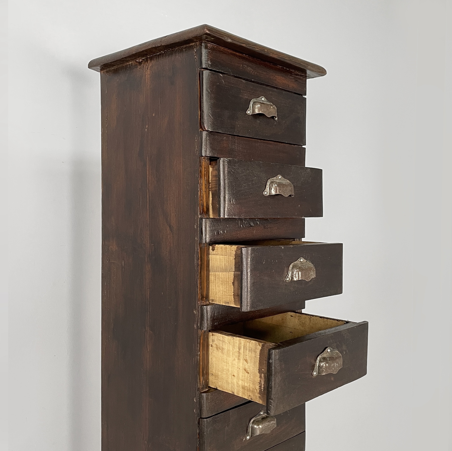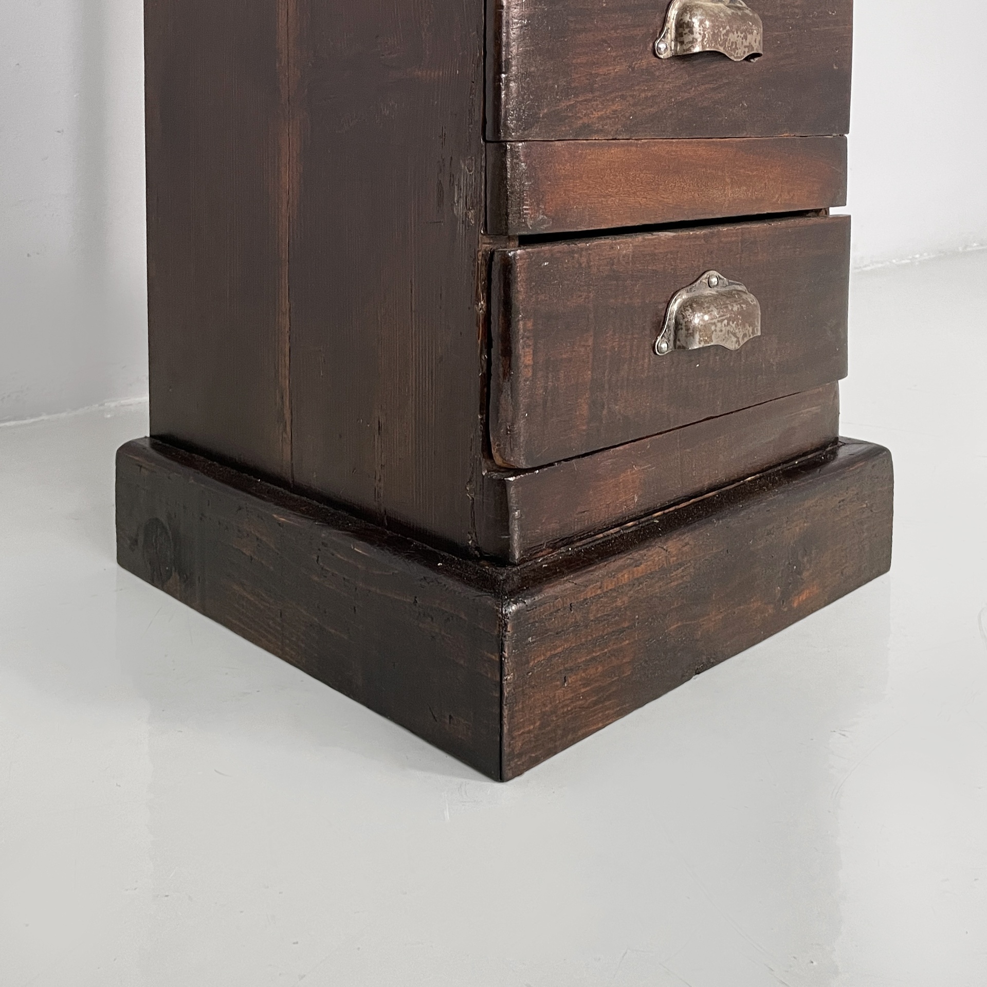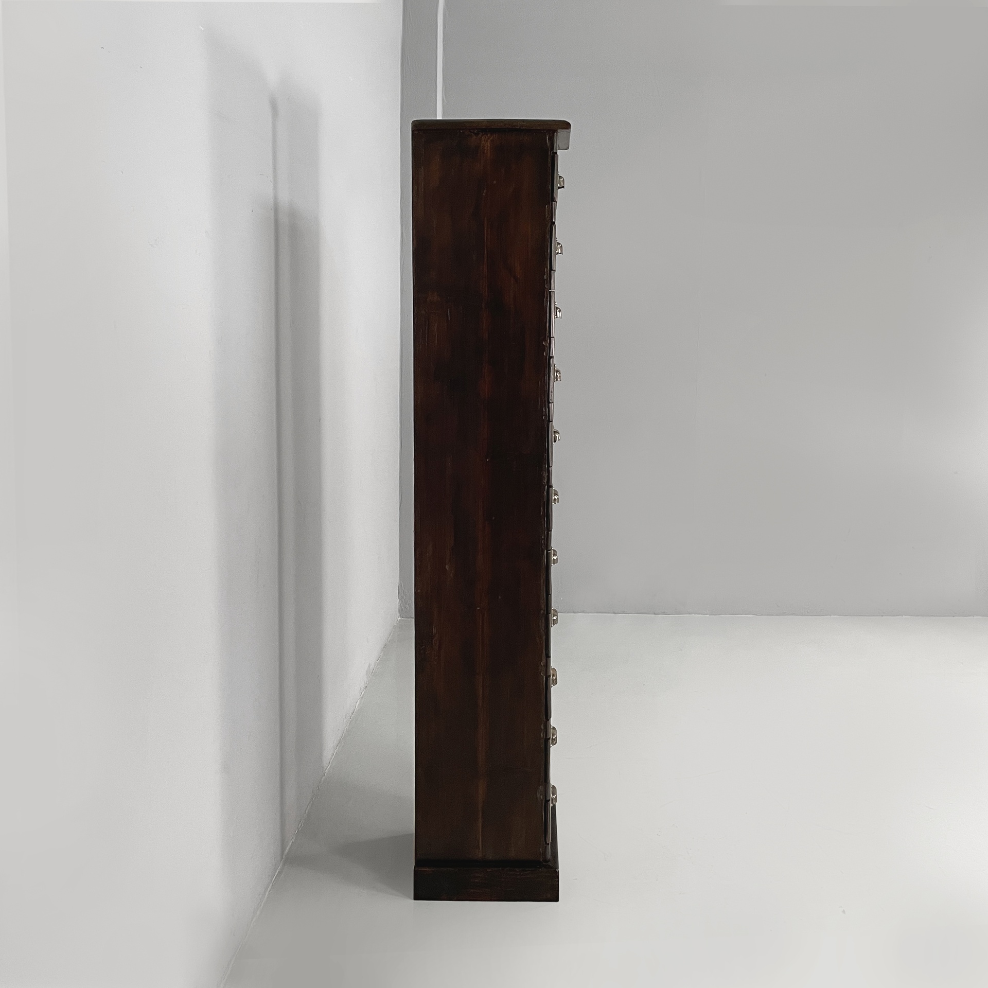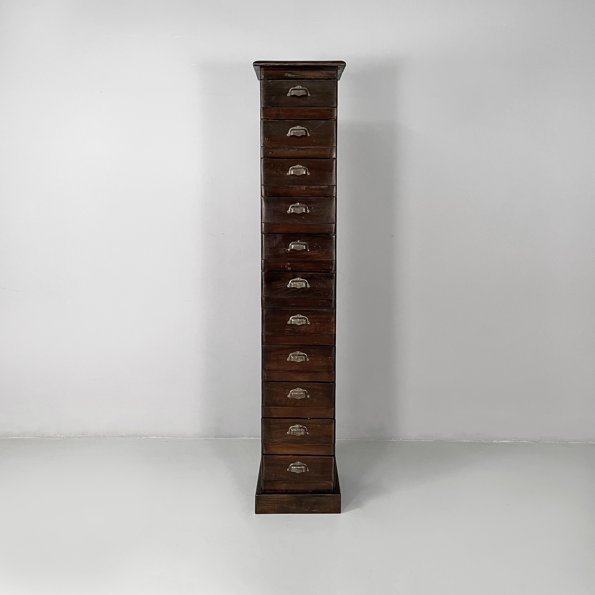 Cassettiera a base squadrata in legno con maniglie metallo. Sul fronte presenta undici cassetti rettangolari. Utilizzabile come mobile archivio.