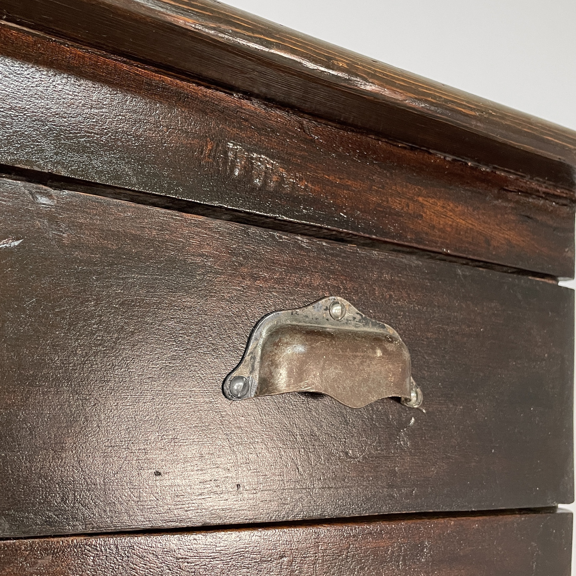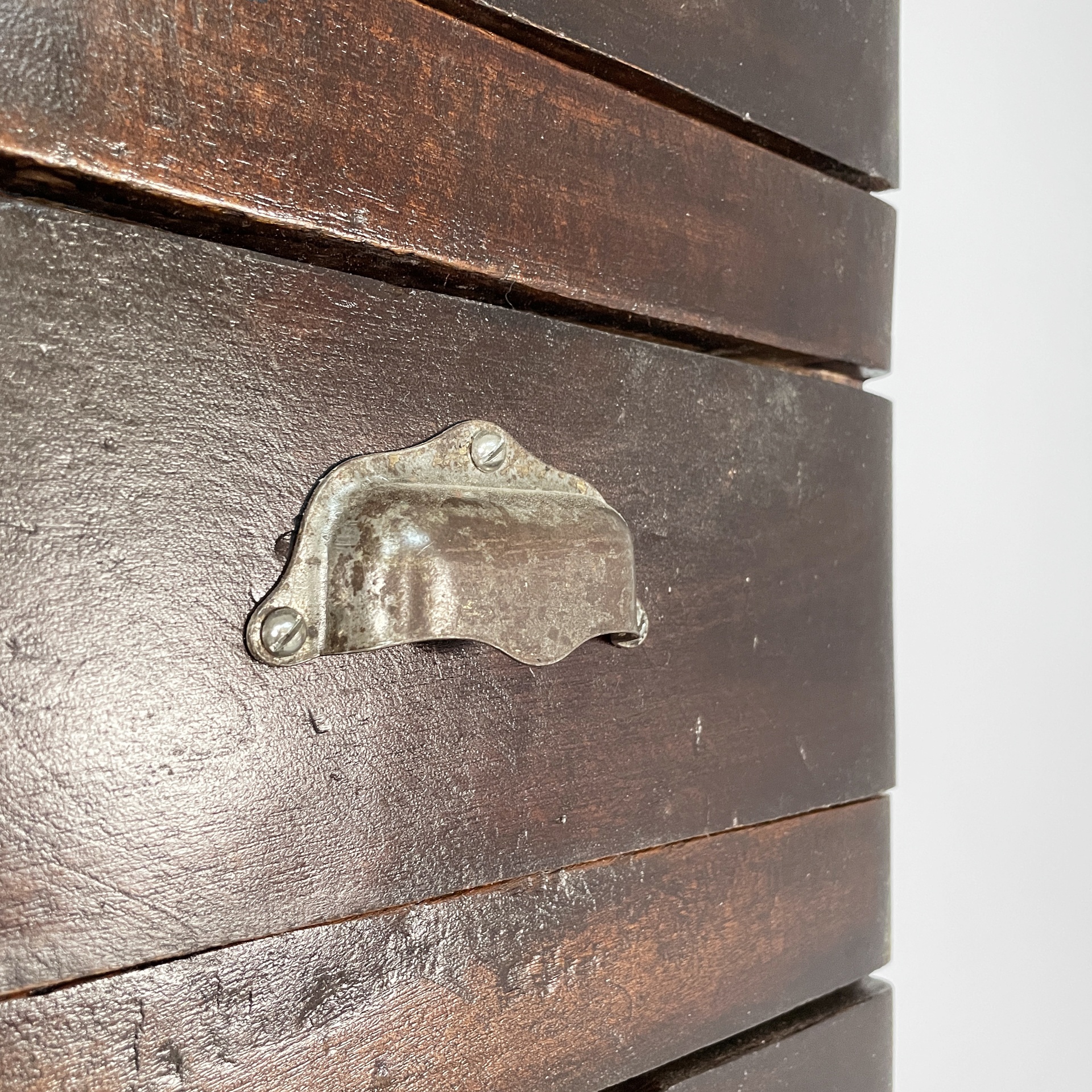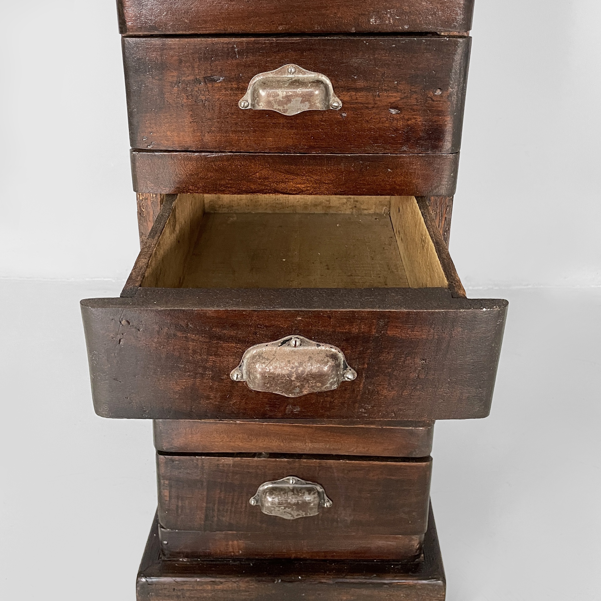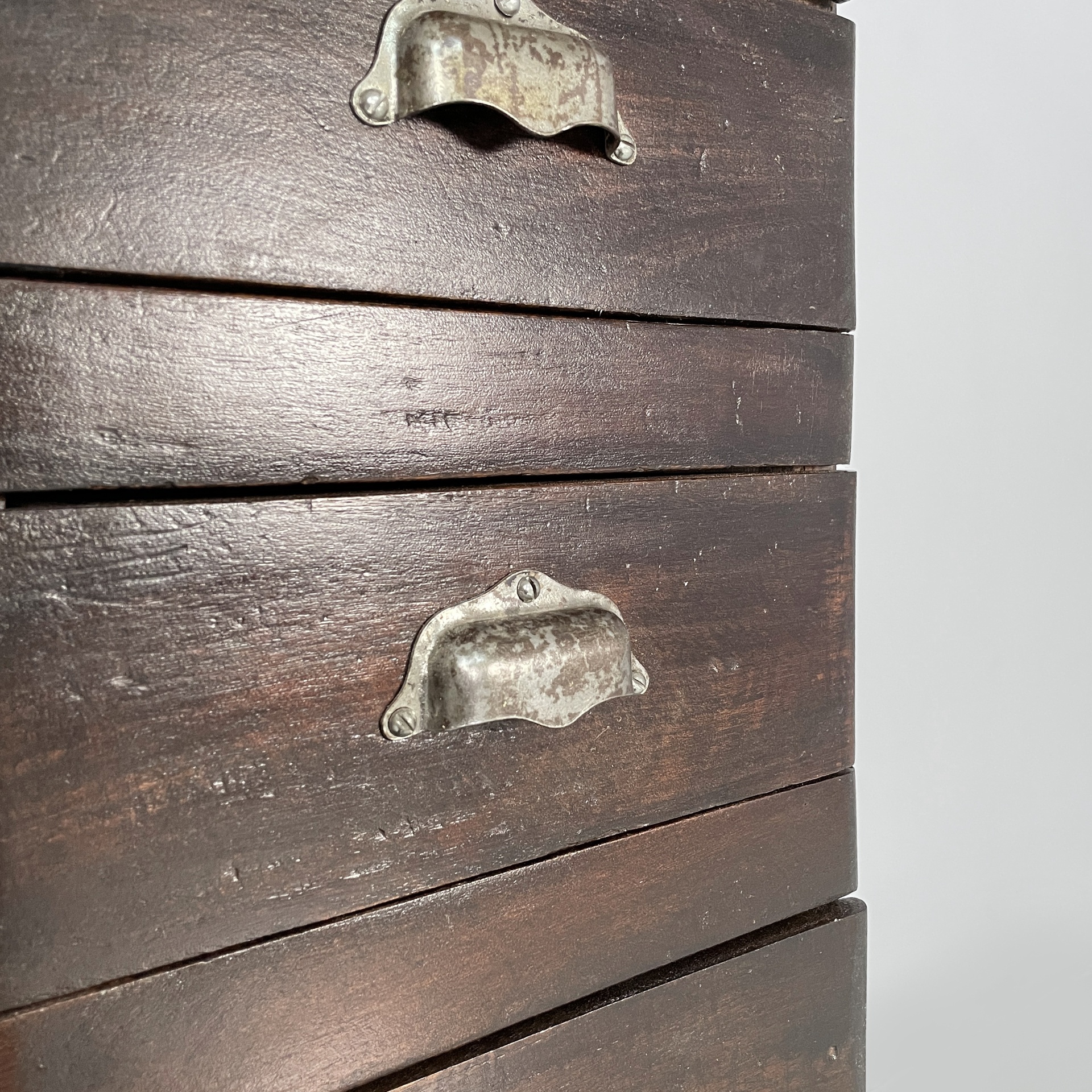 Cassettiera a base squadrata in legno con maniglie metallo. Sul fronte presenta undici cassetti rettangolari. Utilizzabile come mobile archivio.