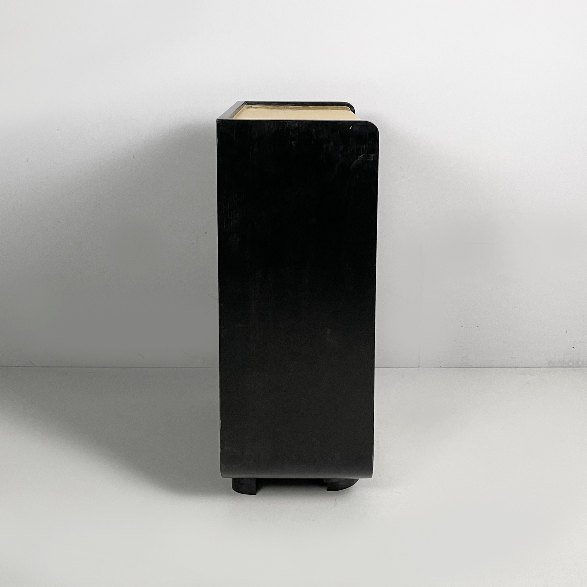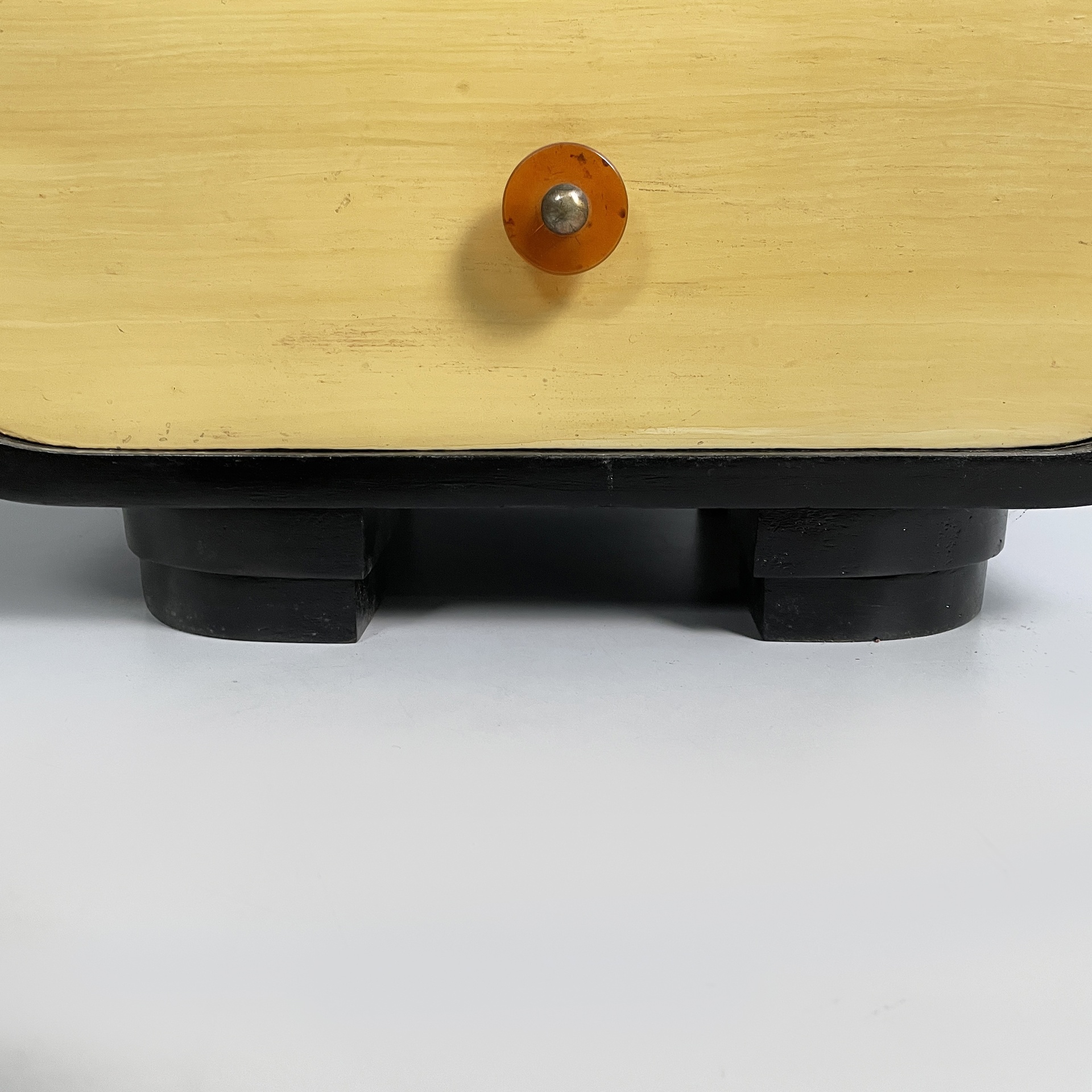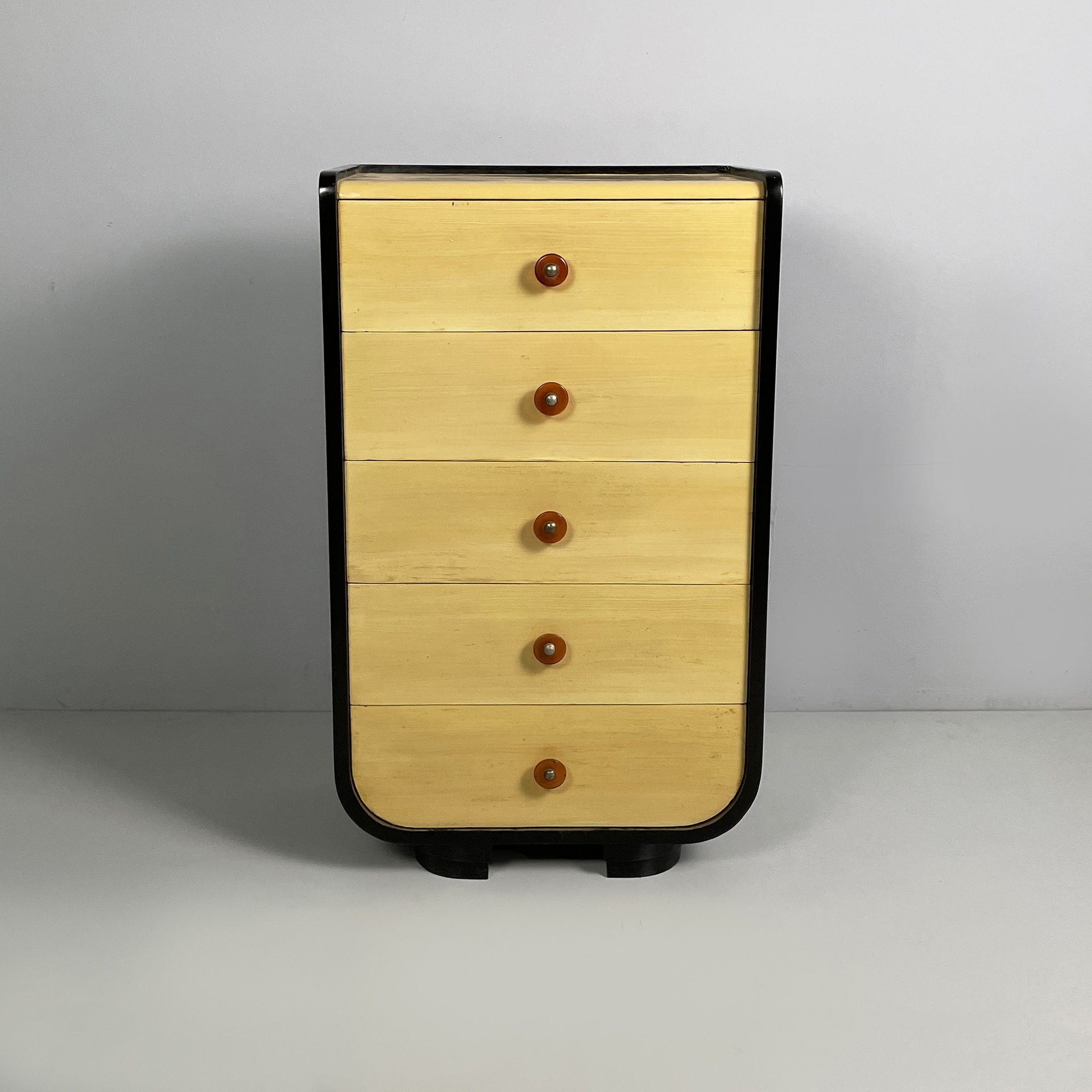 Cassettiera a base rettangolare in legno chiaro con profili in legno nero. Sul fronte sono presenti cinque cassetti con maniglia tonda di bachelite arancione. Piedini in legno nero. Art Deco.