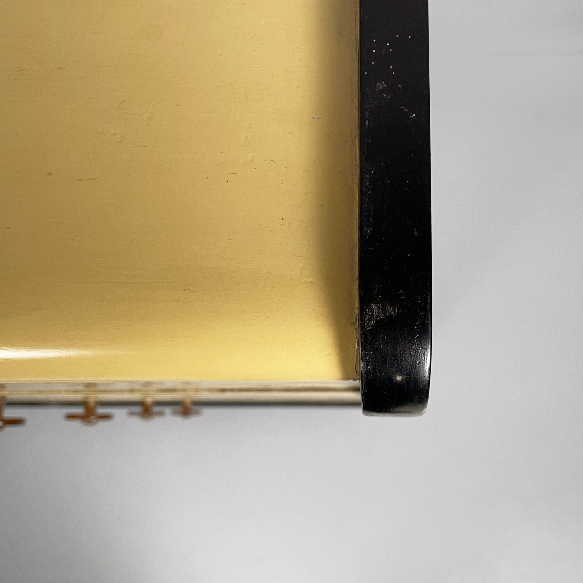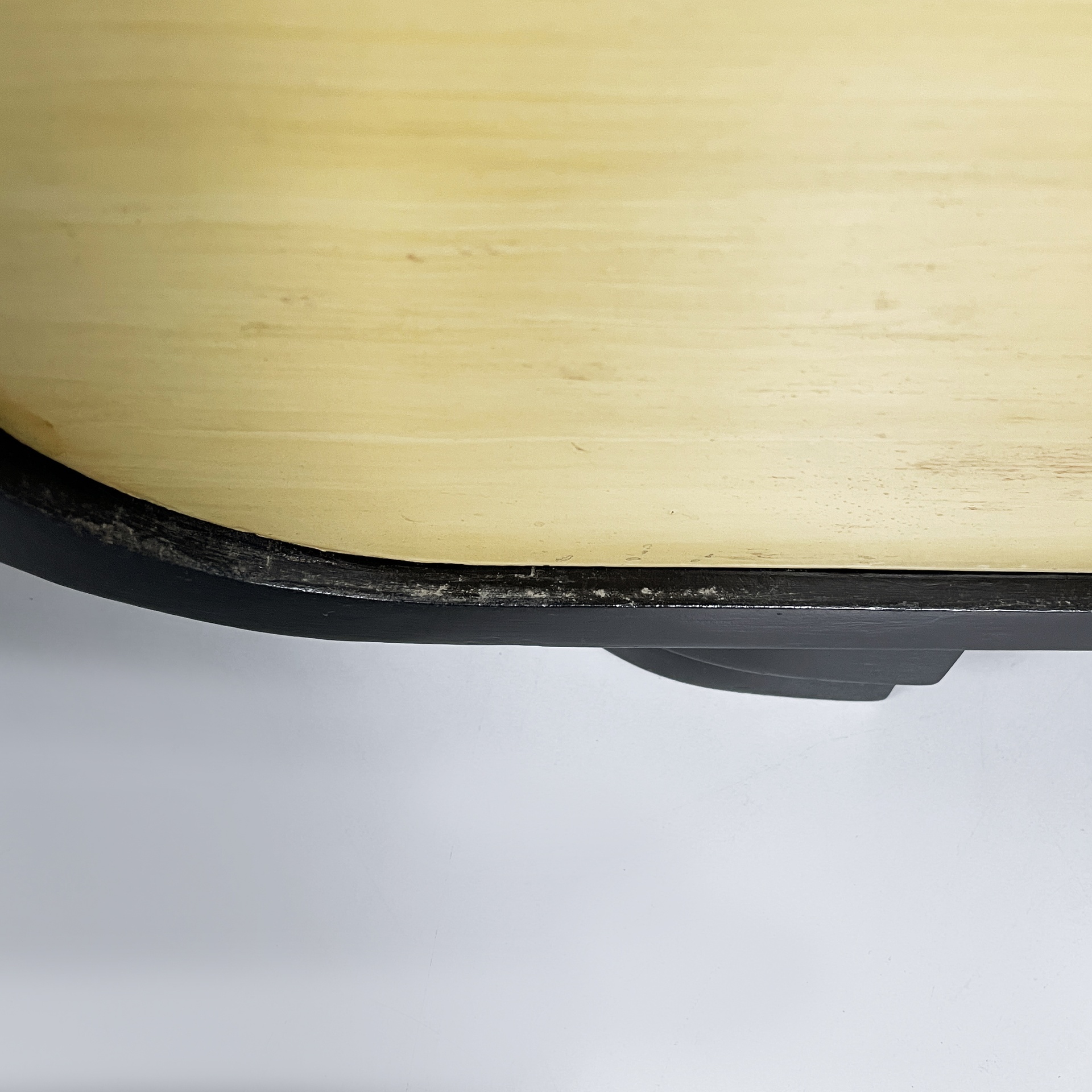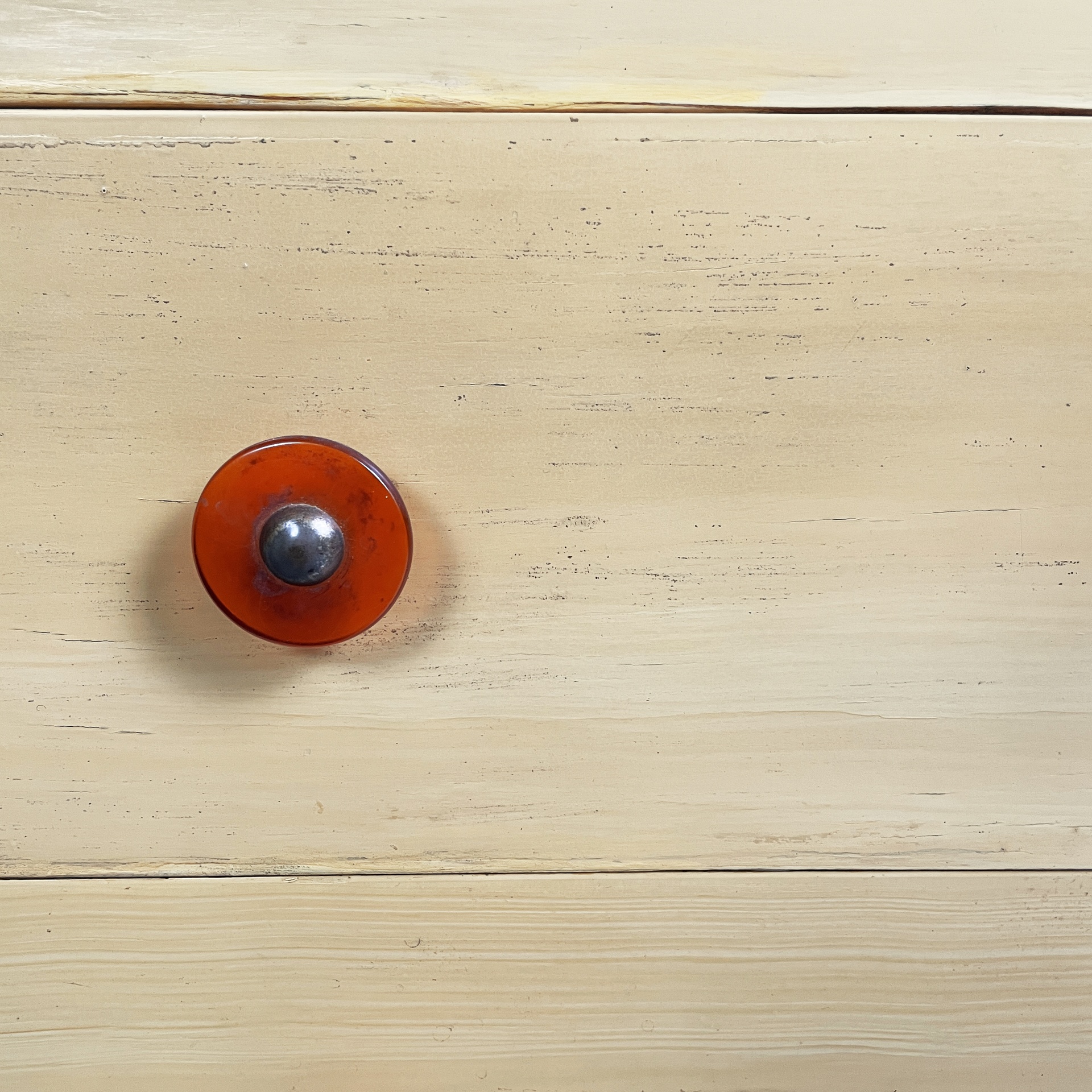 Cassettiera a base rettangolare in legno chiaro con profili in legno nero. Sul fronte sono presenti cinque cassetti con maniglia tonda di bachelite arancione. Piedini in legno nero. Art Deco.