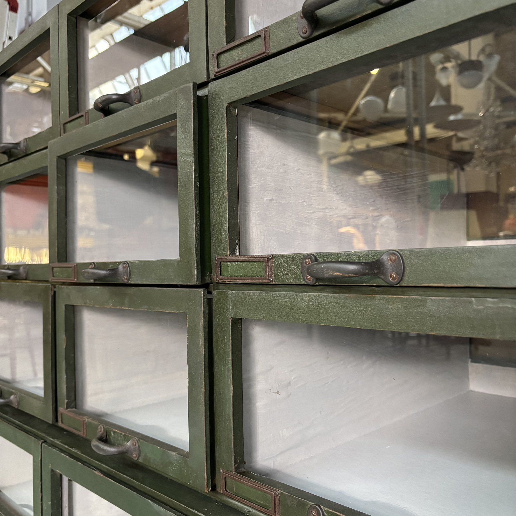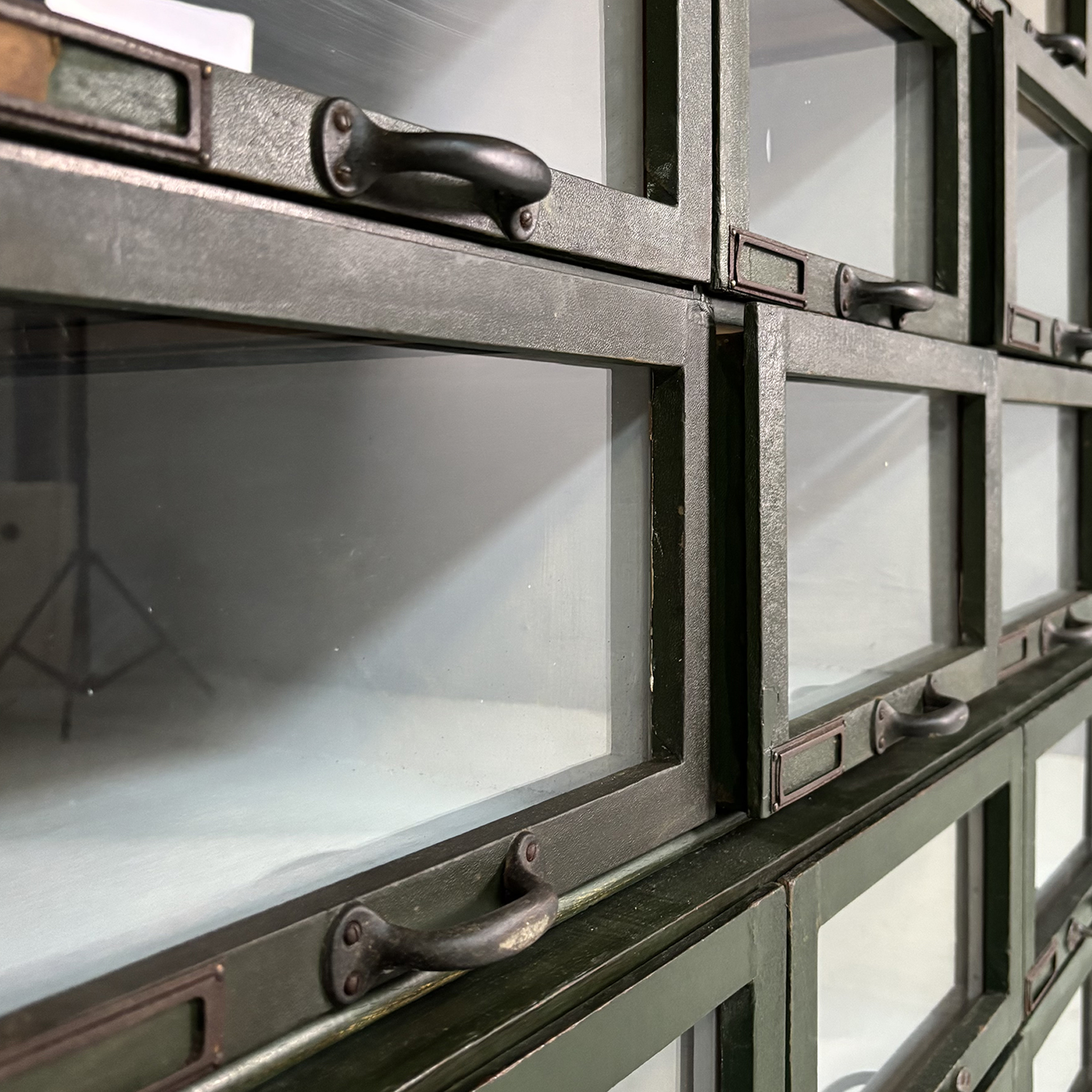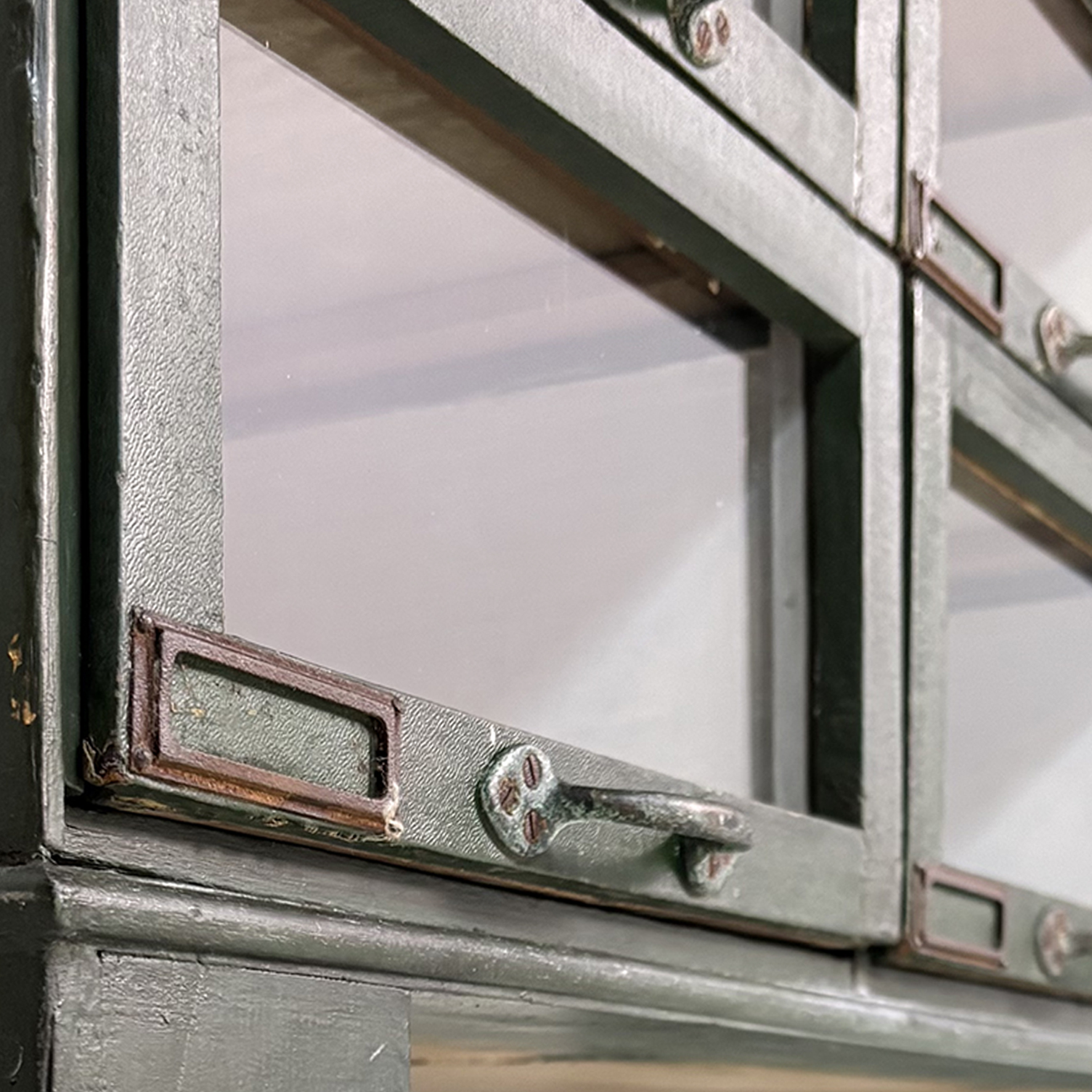 Cassettiera interamente in legno massello di colore verde scuro e composta da due moduli. Il mobile è organizzato in una serie di numerosi cassetti di piccole dimensione. Il fronte dei cassetti è dotato di sportellini con vetro e all’interno sono rivestiti in carta stampata. La base è rialzata, con piedini sagomati.
