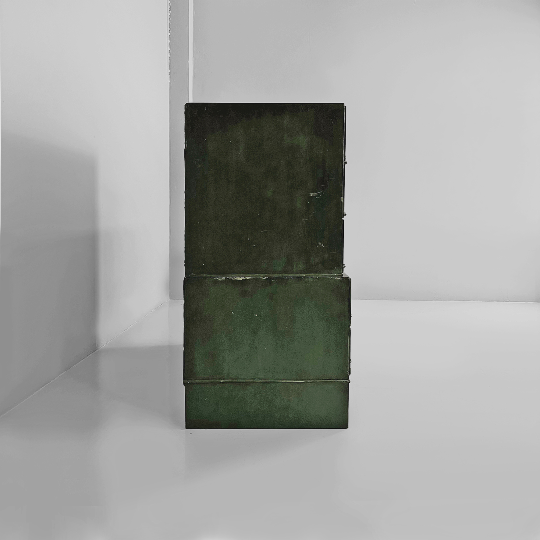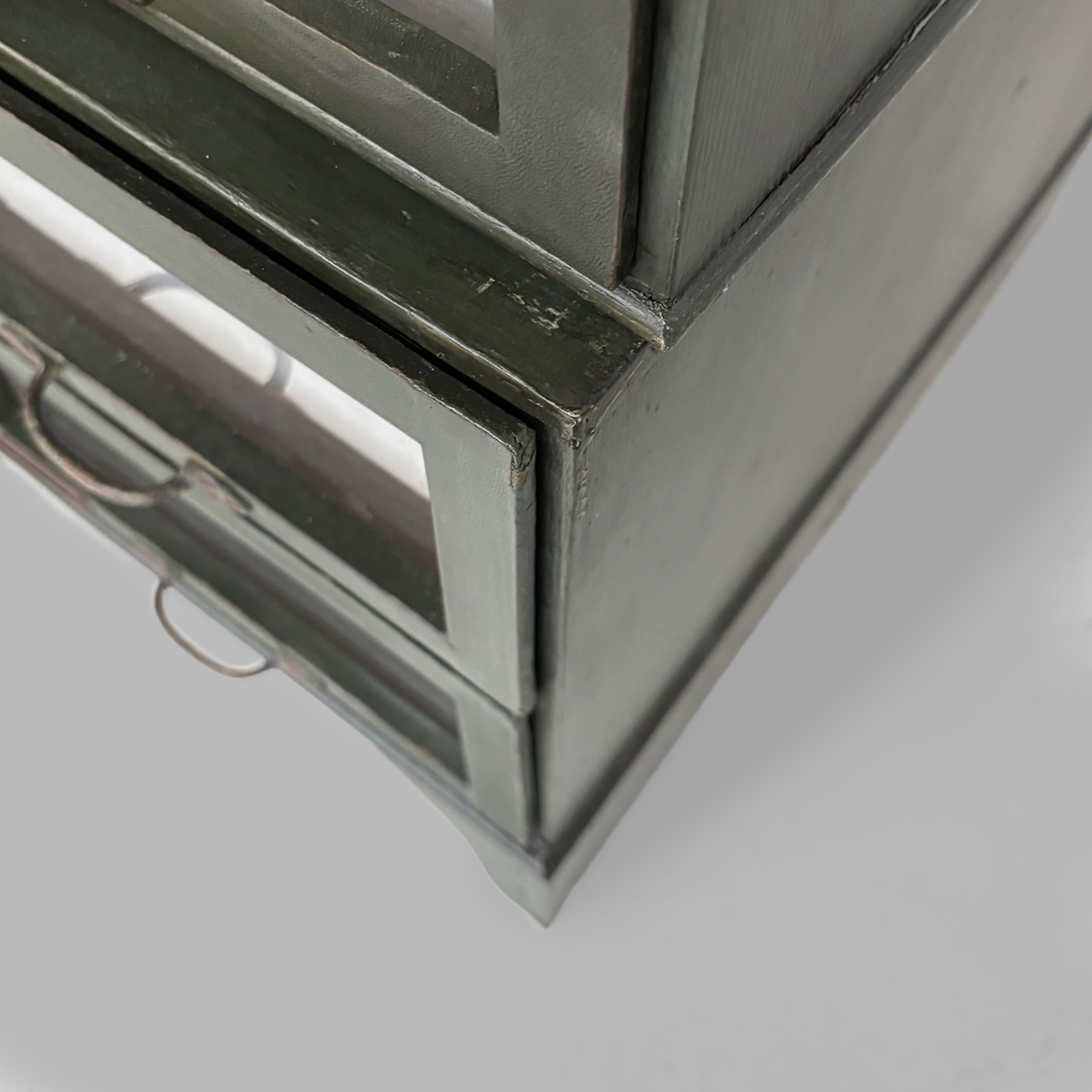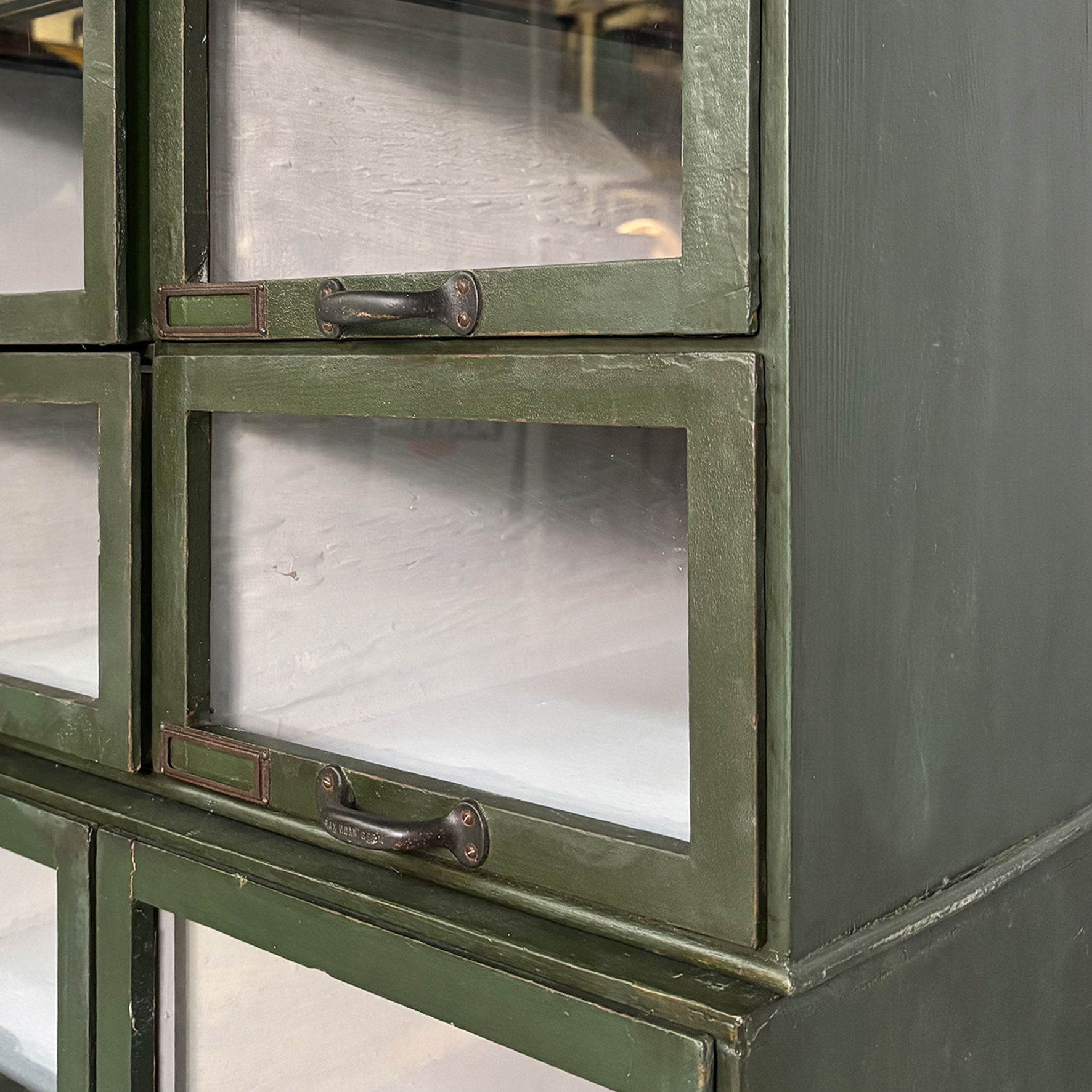 Cassettiera interamente in legno massello di colore verde scuro e composta da due moduli. Il mobile è organizzato in una serie di numerosi cassetti di piccole dimensione. Il fronte dei cassetti è dotato di sportellini con vetro e all’interno sono rivestiti in carta stampata. La base è rialzata, con piedini sagomati.