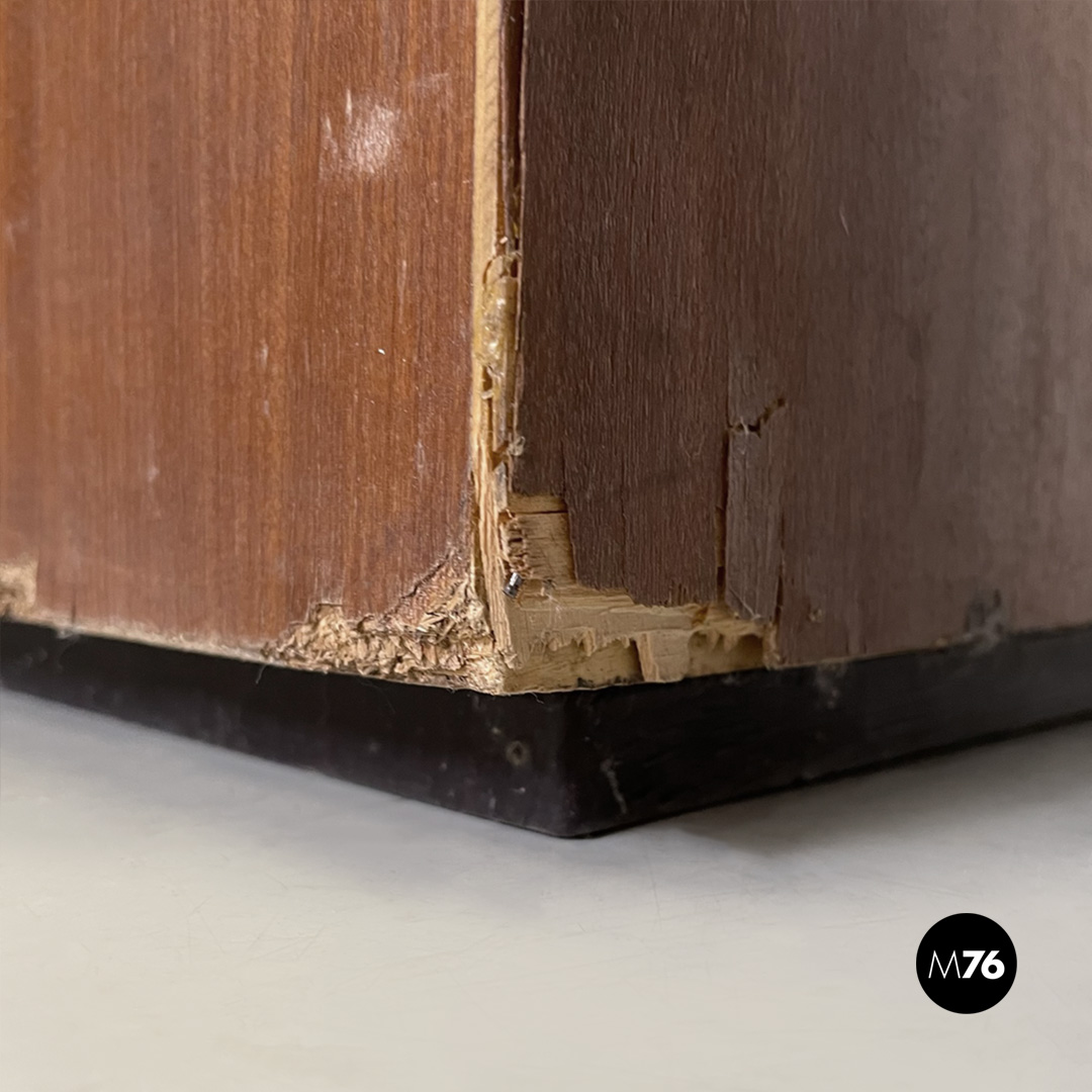 Cassettiera porta cucito a base rettangolare in legno chiaro e scuro. La parte frontale dei cassetti è inclinata, nell’interno ci sono dei divisori in truciolato che possono essere rimossi.