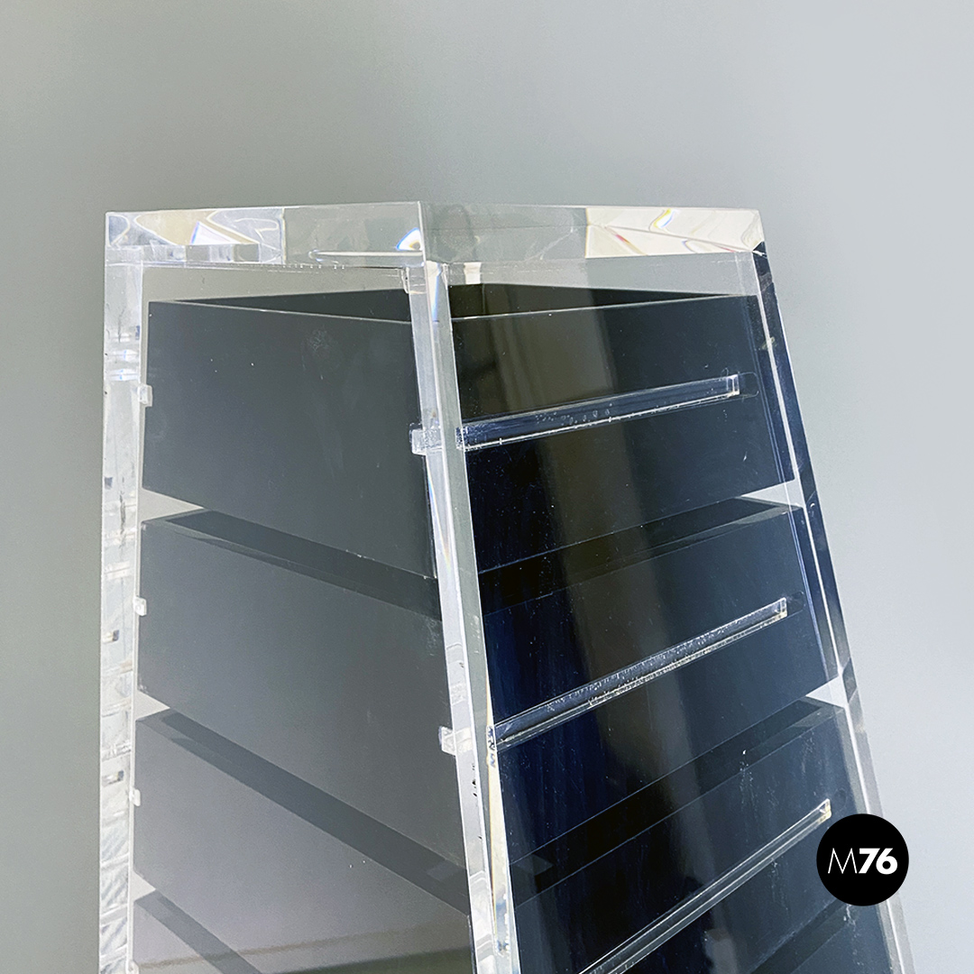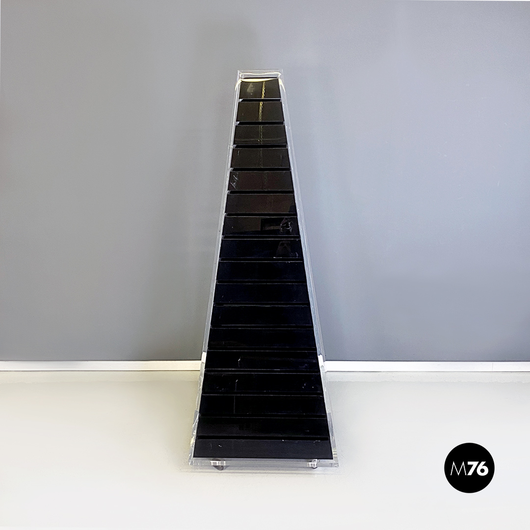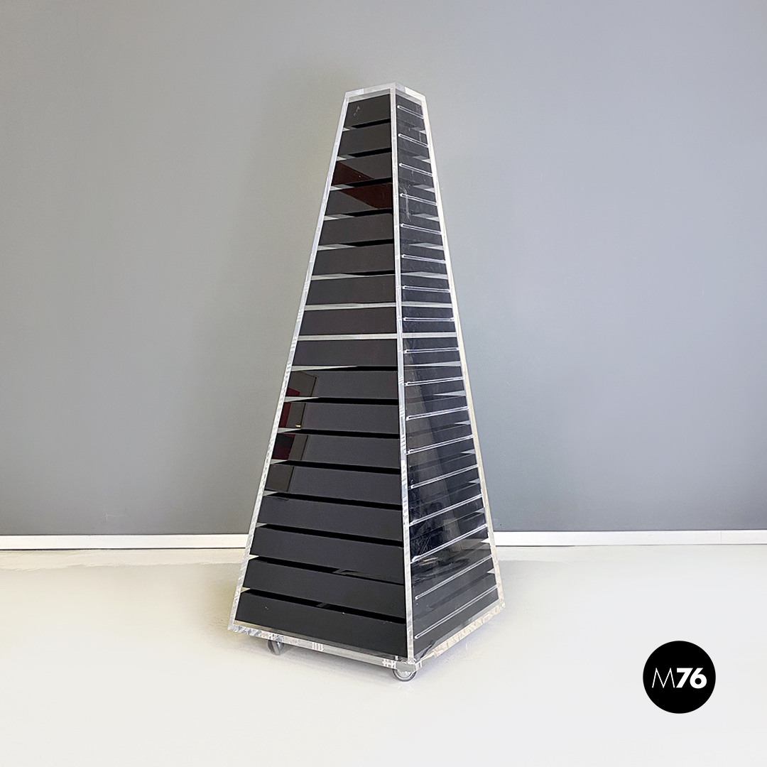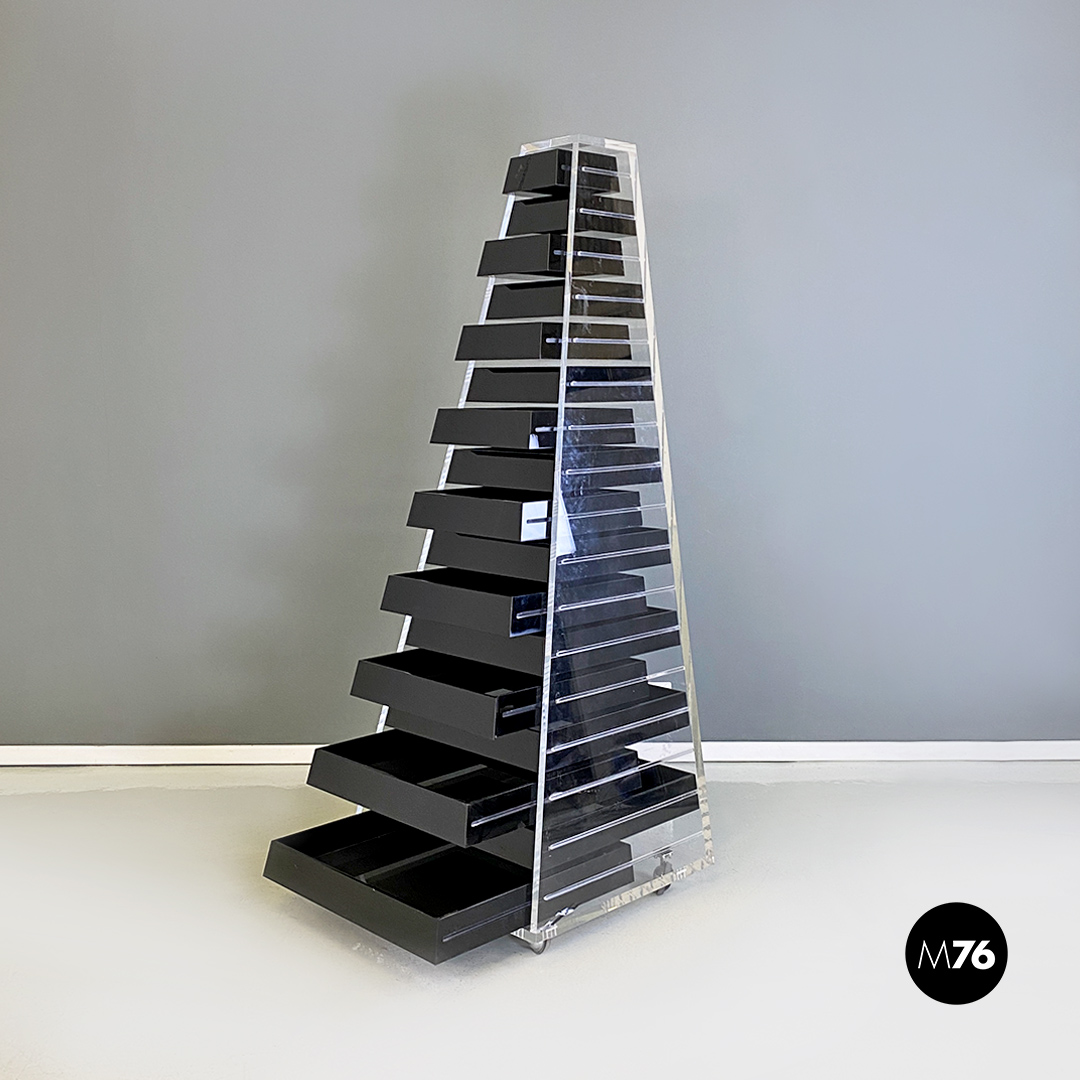Cassettiera modello Pyramid a forma trapezoidale, su ruote, interamente in plexiglass o metacrilato, trasparente in tutta la scatola esterna e nero sui cassetti. Questi ultimi in diciassette dimensioni diverse, di misura crescente dal basso verso l’alto.
