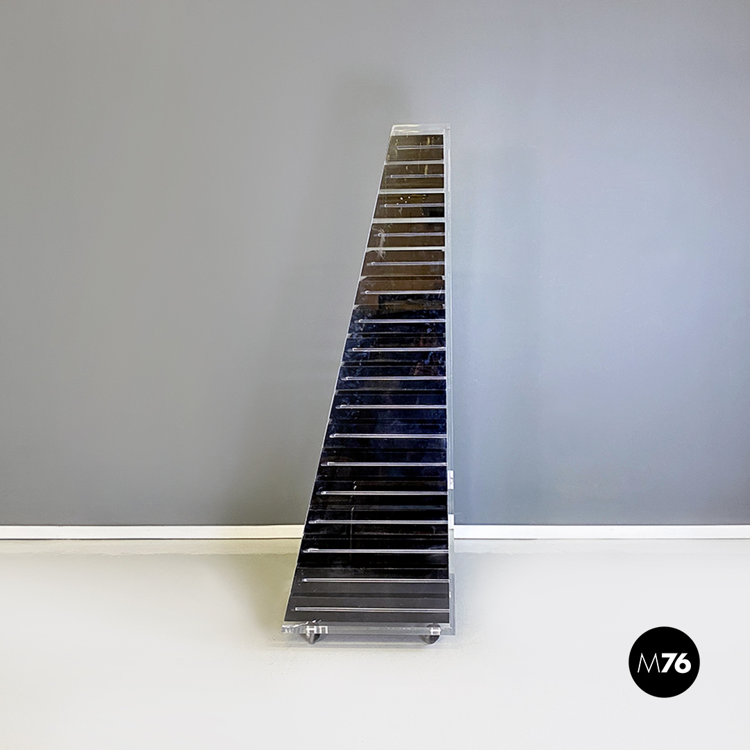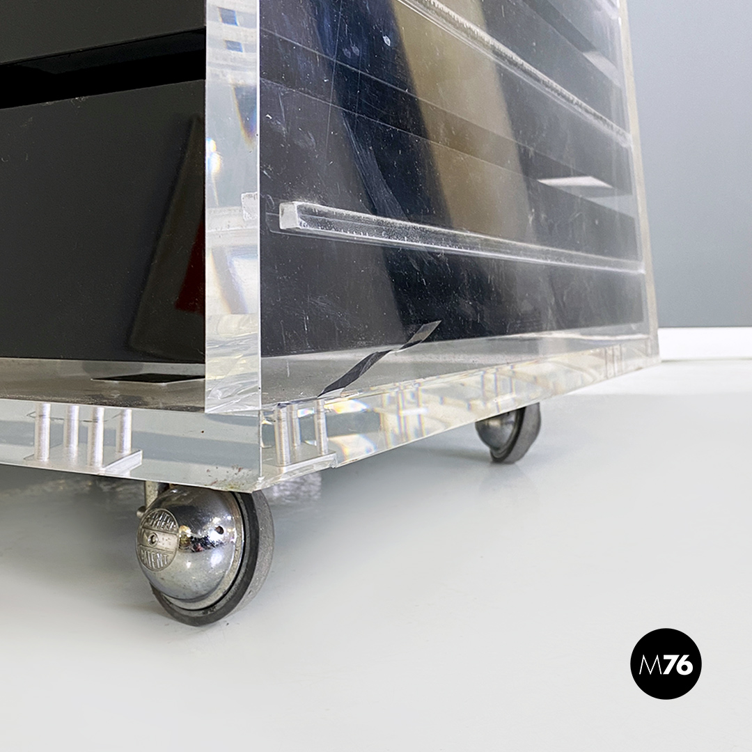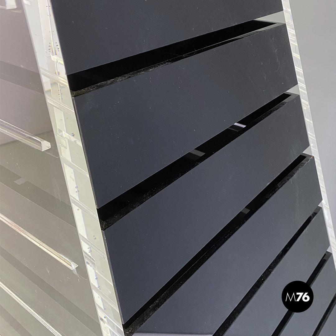 Cassettiera modello Pyramid a forma trapezoidale, su ruote, interamente in plexiglass o metacrilato, trasparente in tutta la scatola esterna e nero sui cassetti. Questi ultimi in diciassette dimensioni diverse, di misura crescente dal basso verso l’alto.