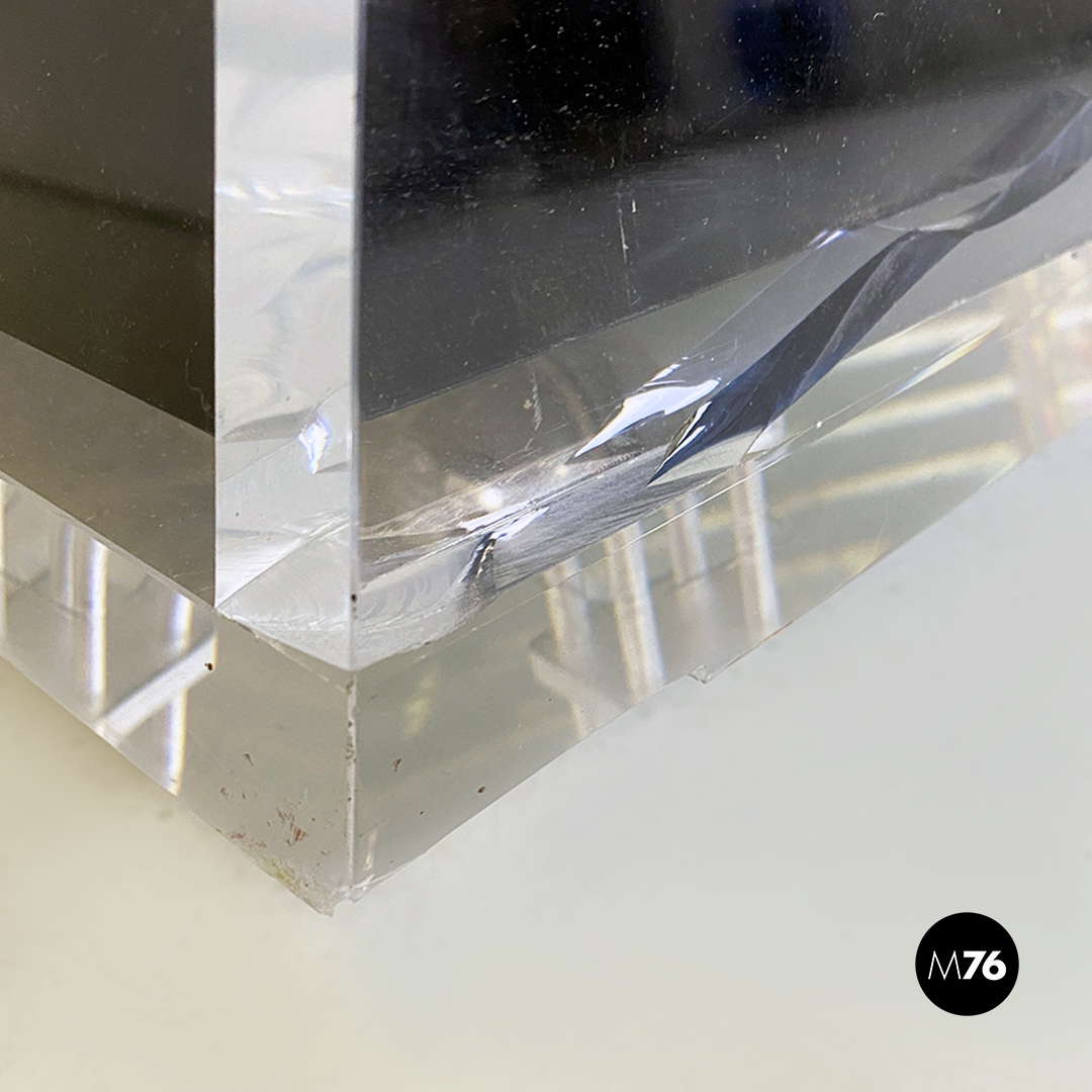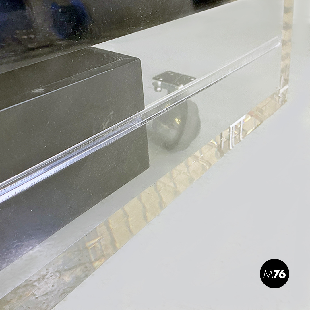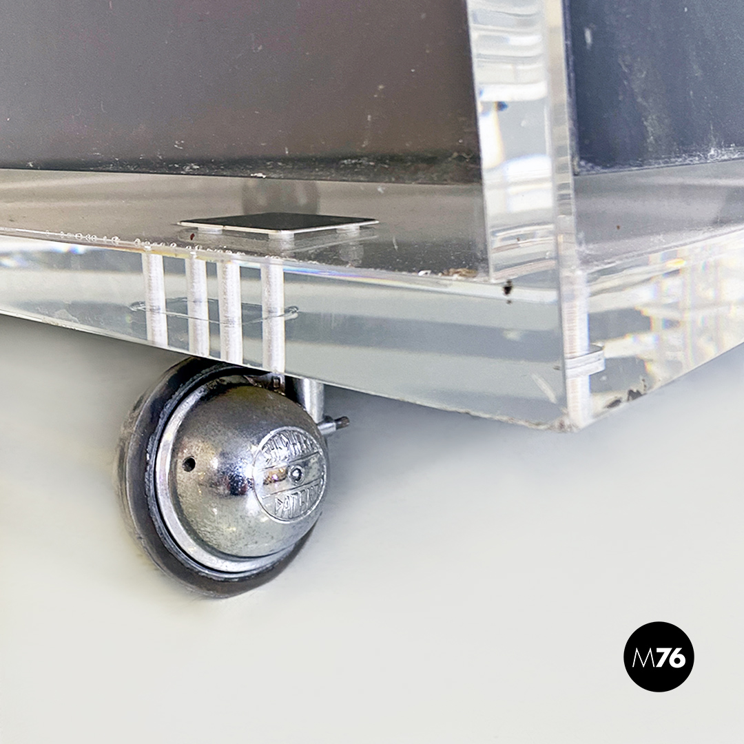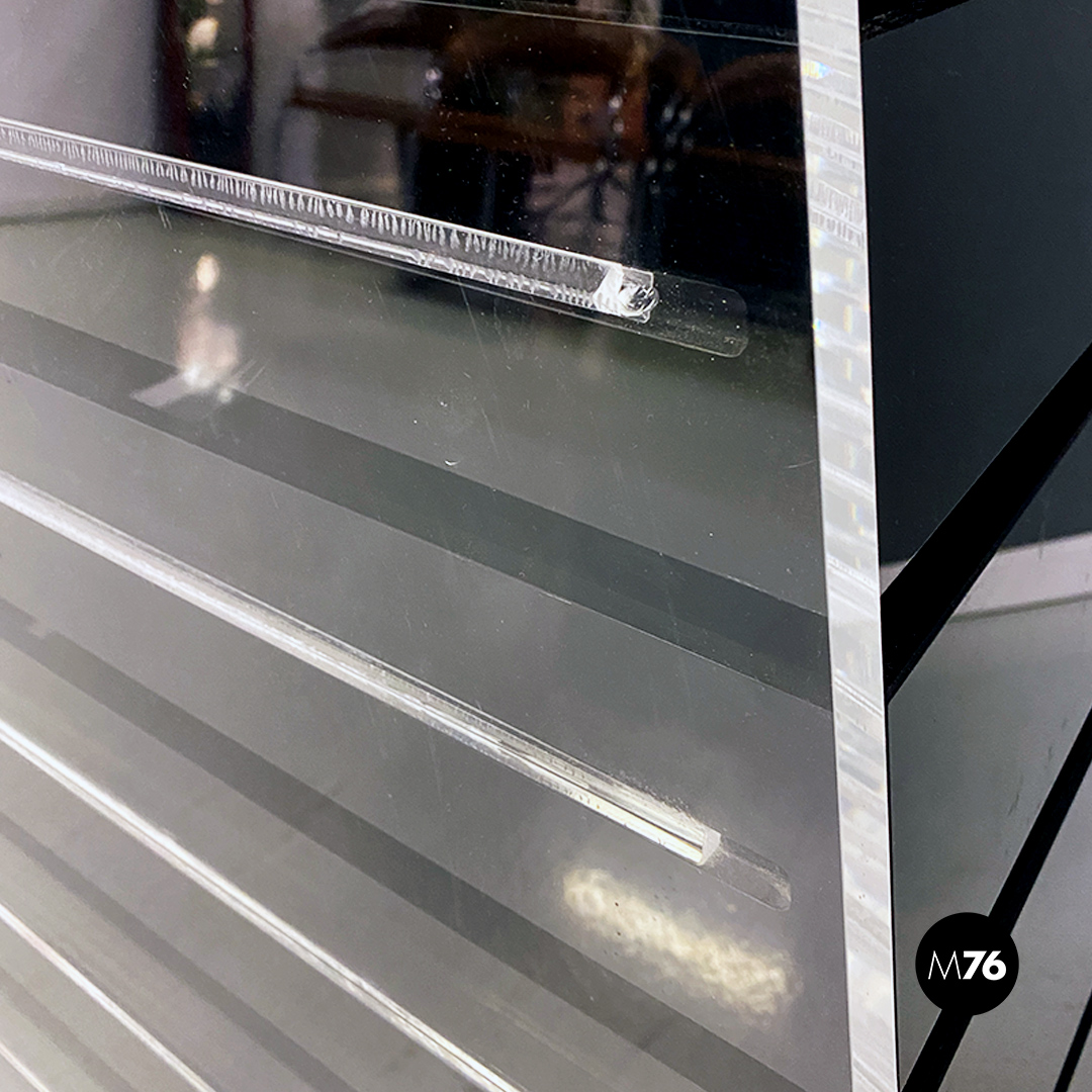 Cassettiera modello Pyramid a forma trapezoidale, su ruote, interamente in plexiglass o metacrilato, trasparente in tutta la scatola esterna e nero sui cassetti. Questi ultimi in diciassette dimensioni diverse, di misura crescente dal basso verso l’alto.