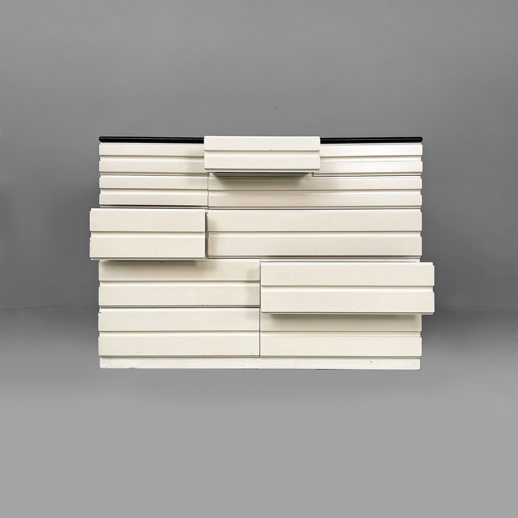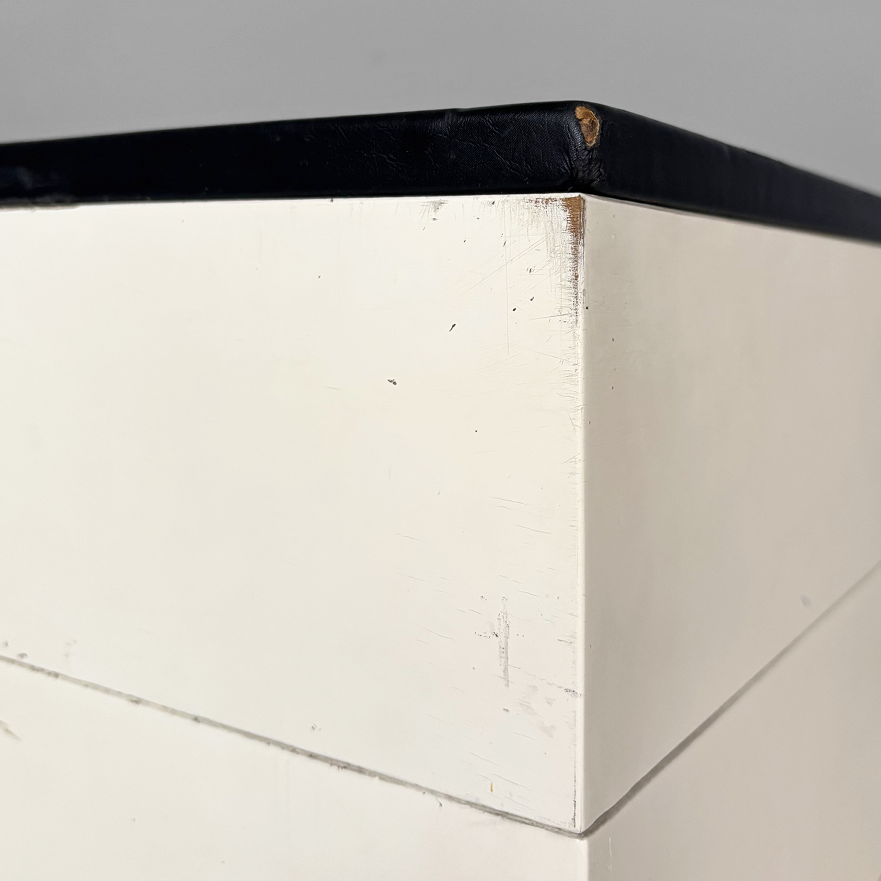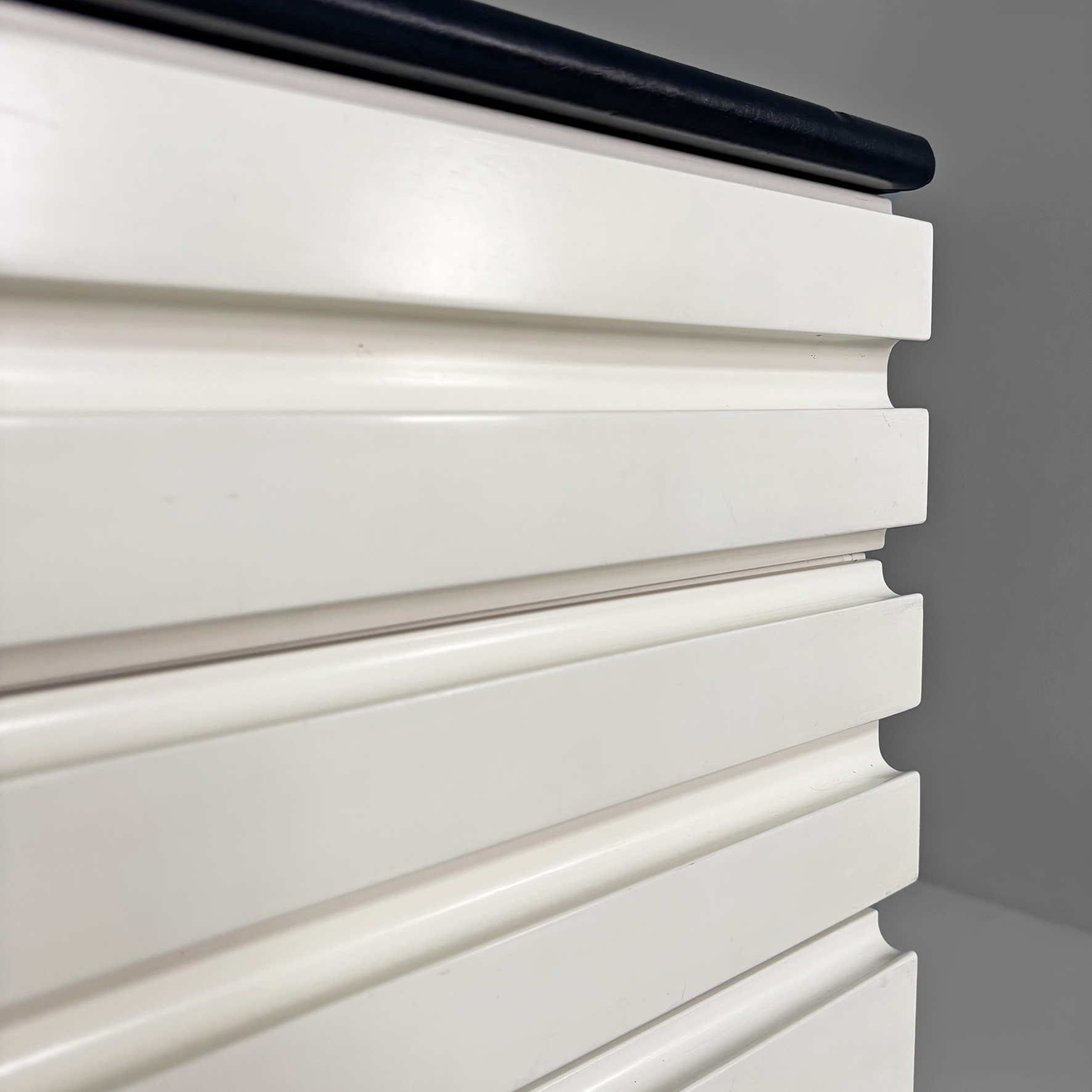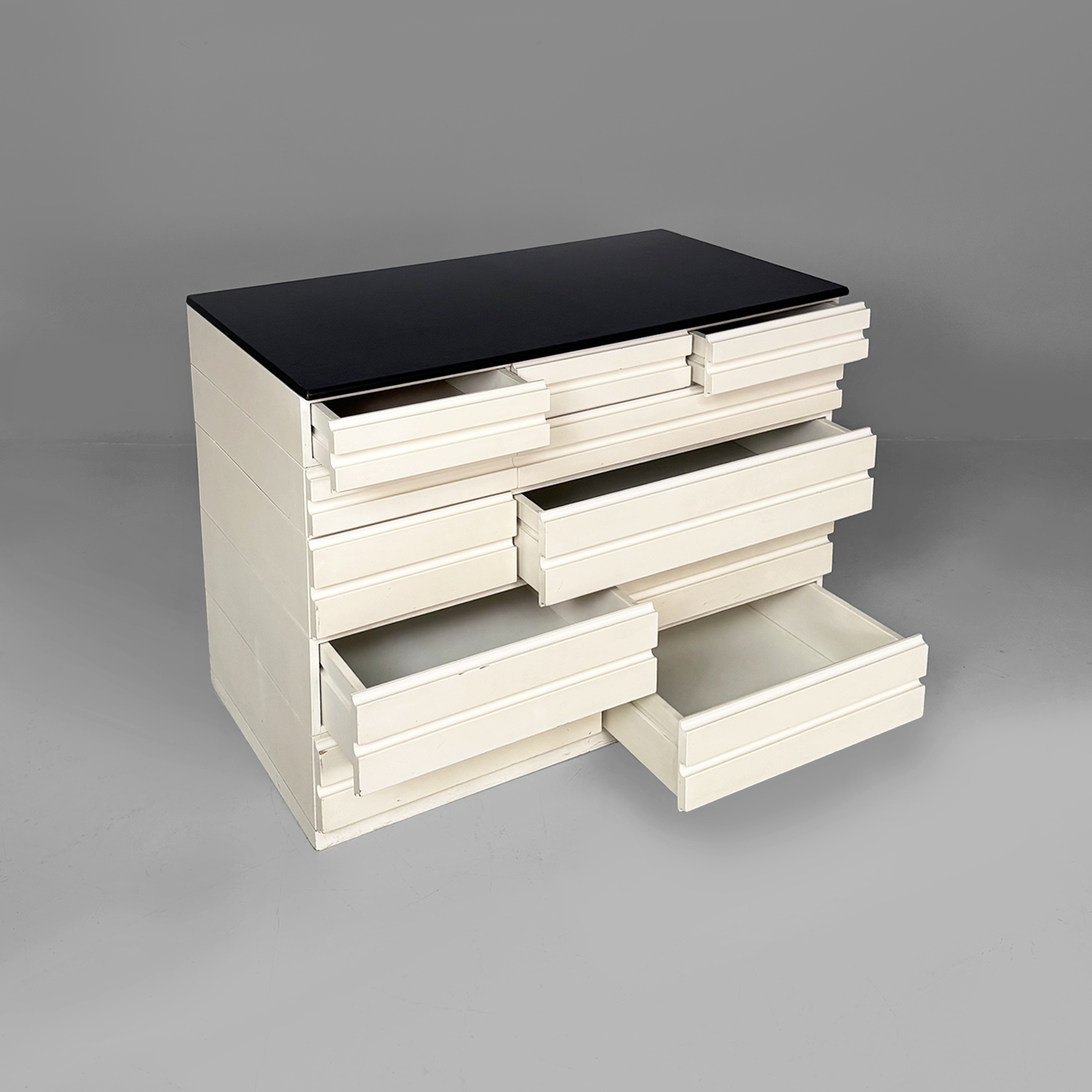 Cassettiera modello Samarcanda a base rettangolare in legno verniciato bianco. Il piano è rivestito in pelle nera. Sul fronte sono presenti undici cassetti di diverse dimensioni e con scanalature decorative.