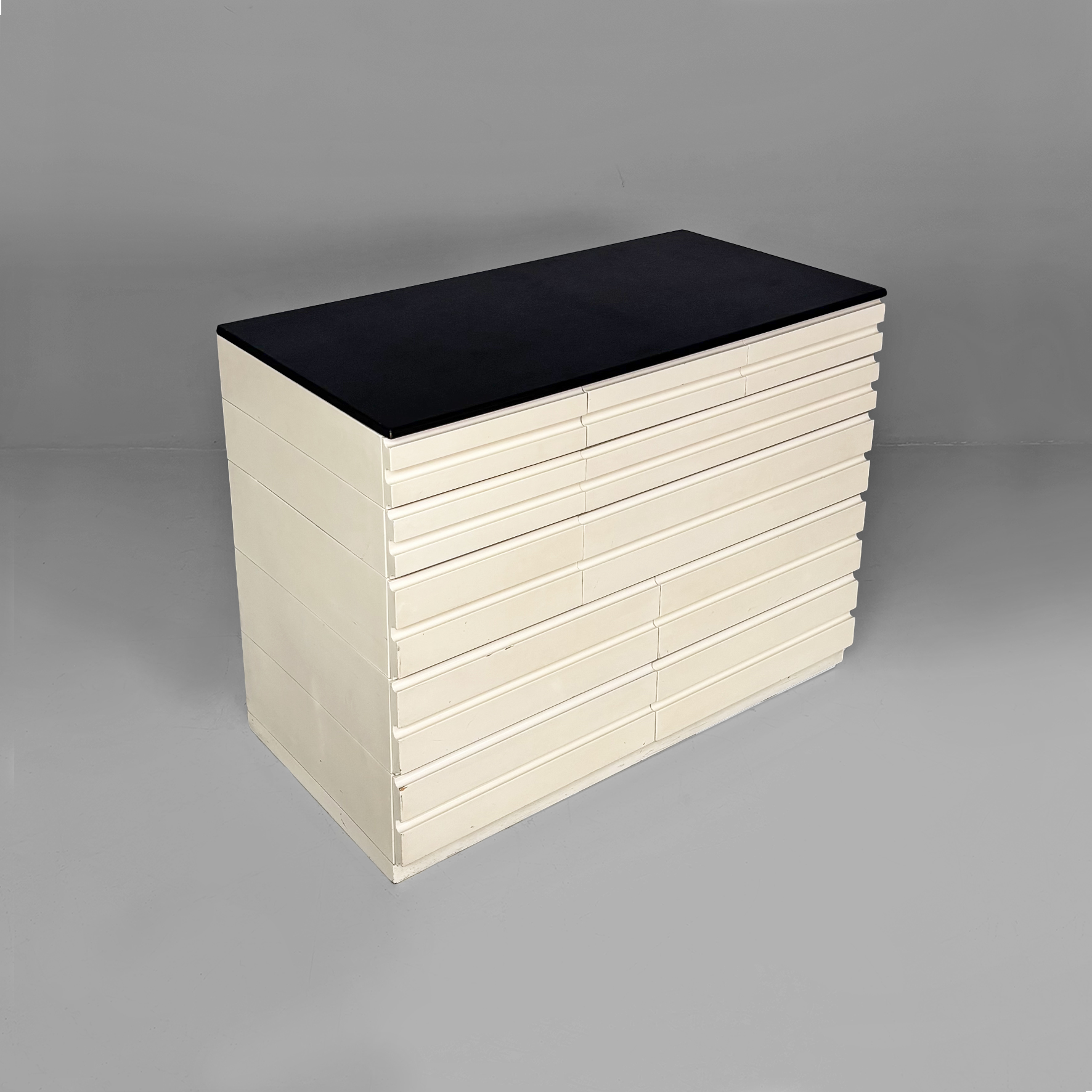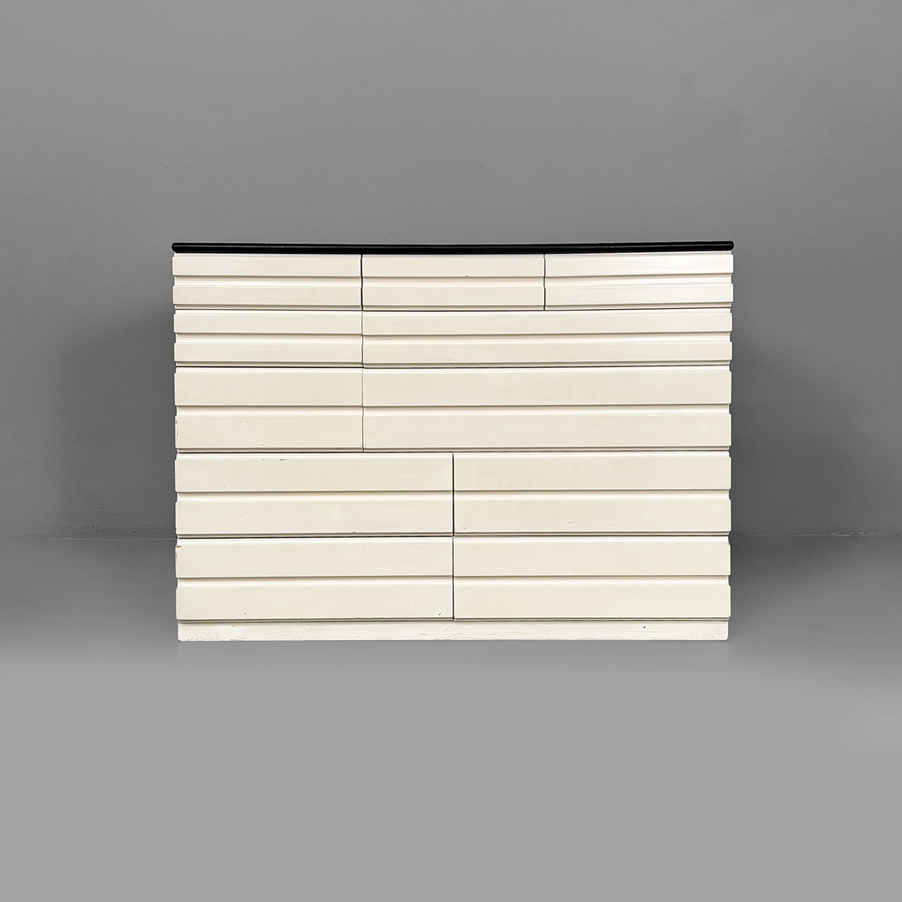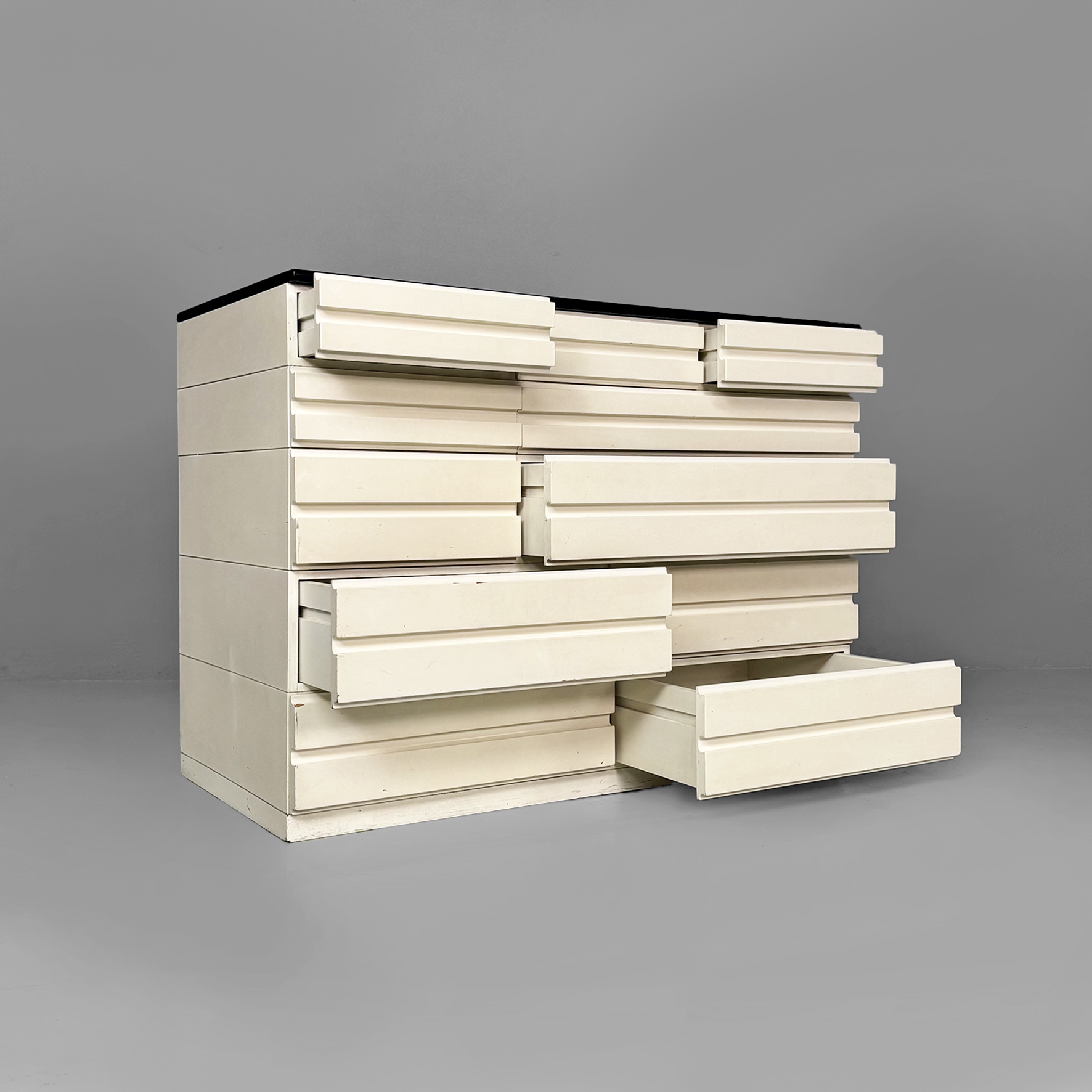Cassettiera modello Samarcanda a base rettangolare in legno verniciato bianco. Il piano è rivestito in pelle nera. Sul fronte sono presenti undici cassetti di diverse dimensioni e con scanalature decorative.