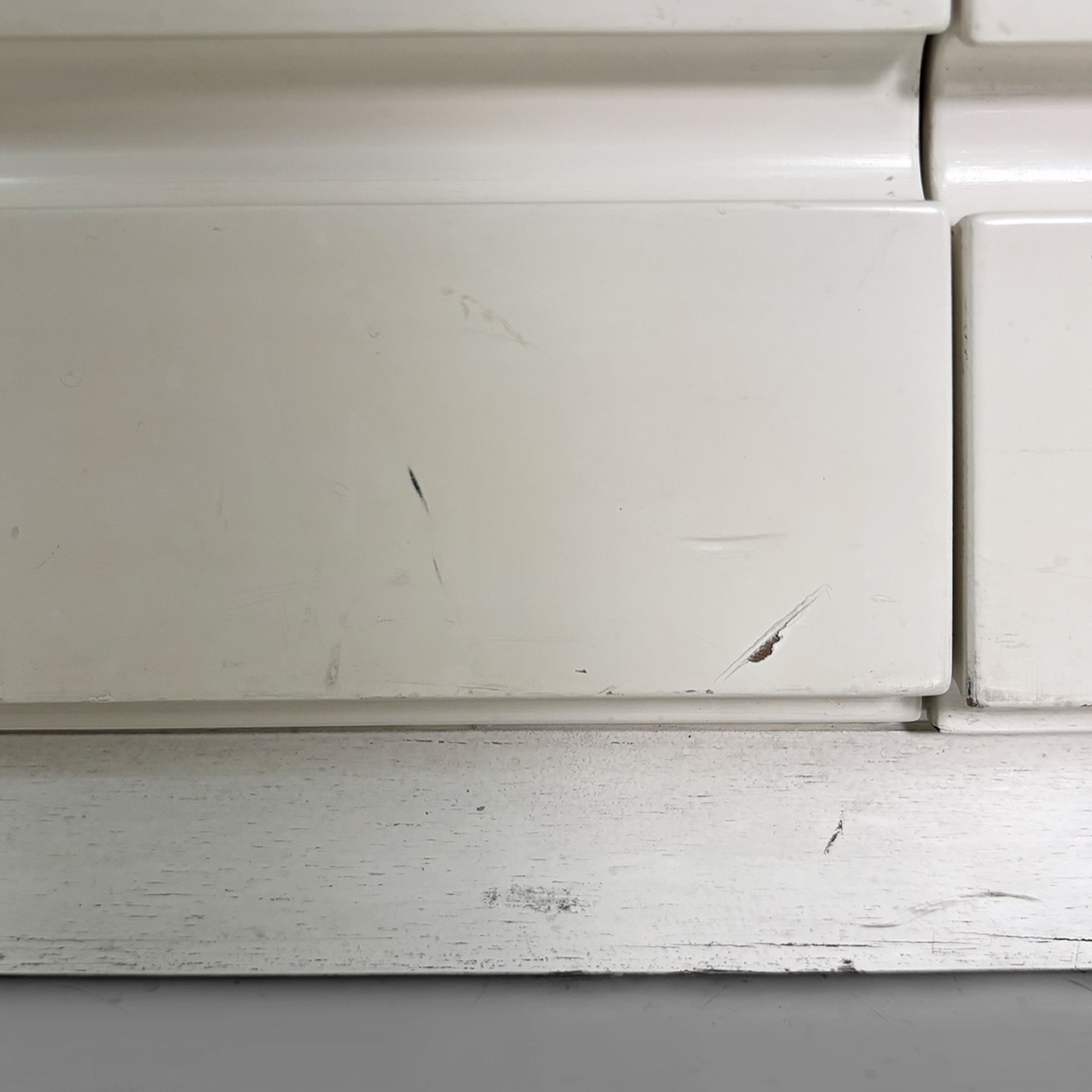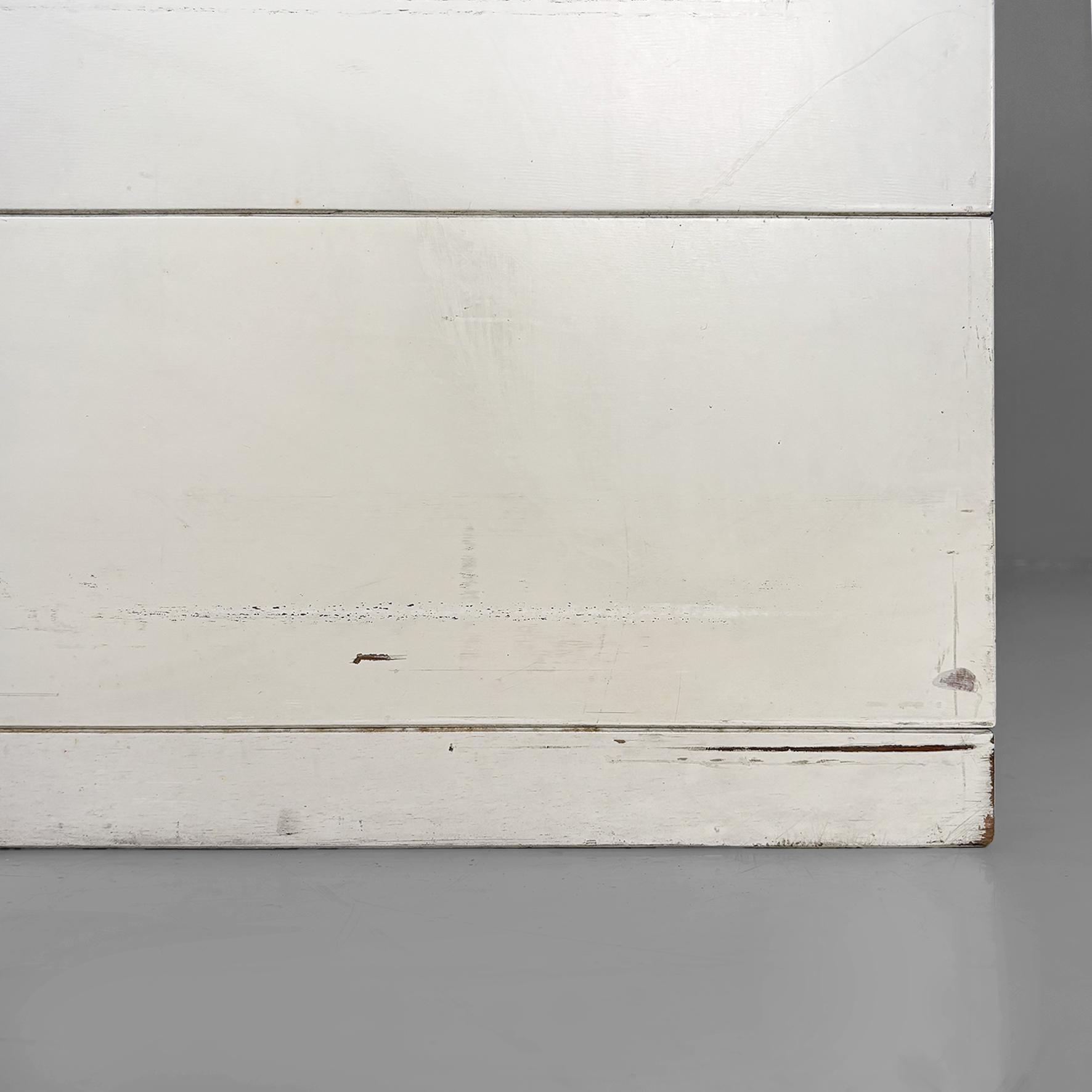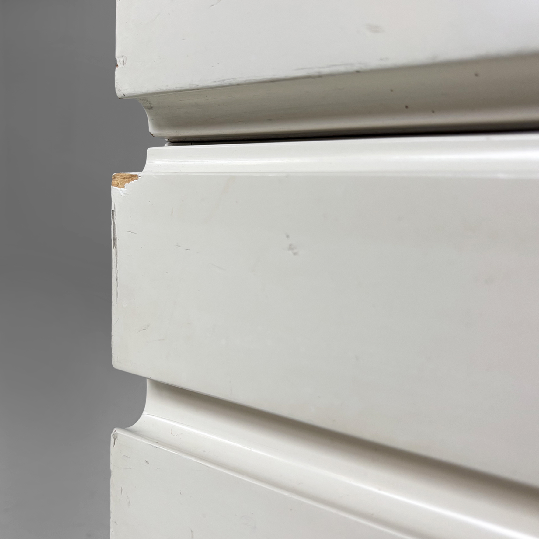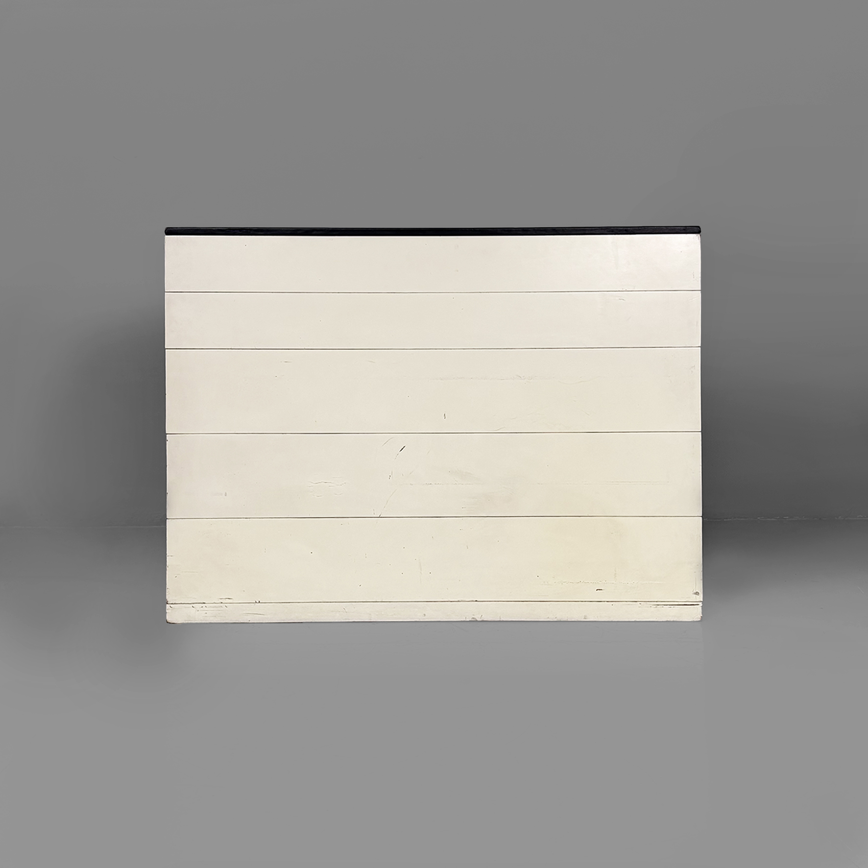 Cassettiera modello Samarcanda a base rettangolare in legno verniciato bianco. Il piano è rivestito in pelle nera. Sul fronte sono presenti undici cassetti di diverse dimensioni e con scanalature decorative.