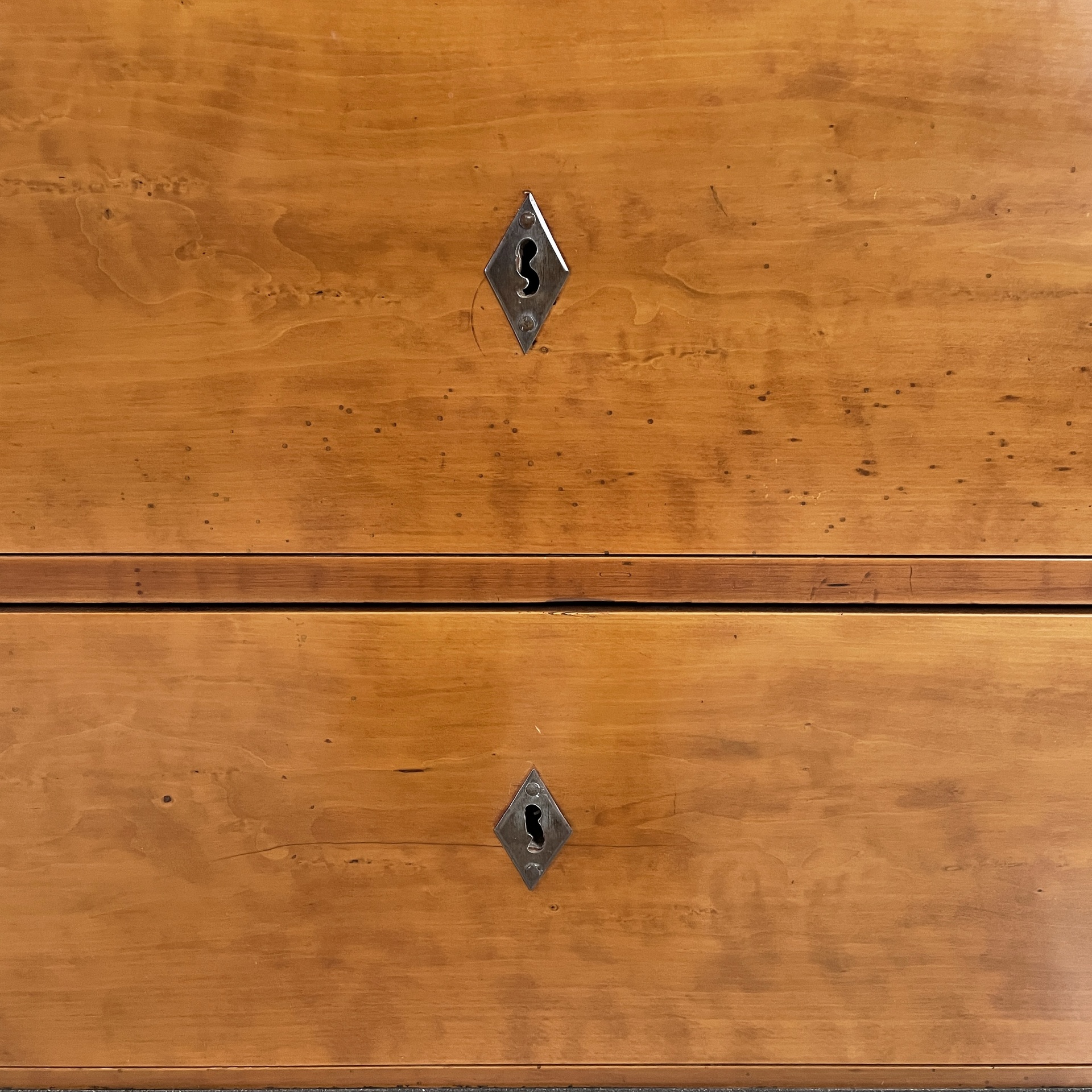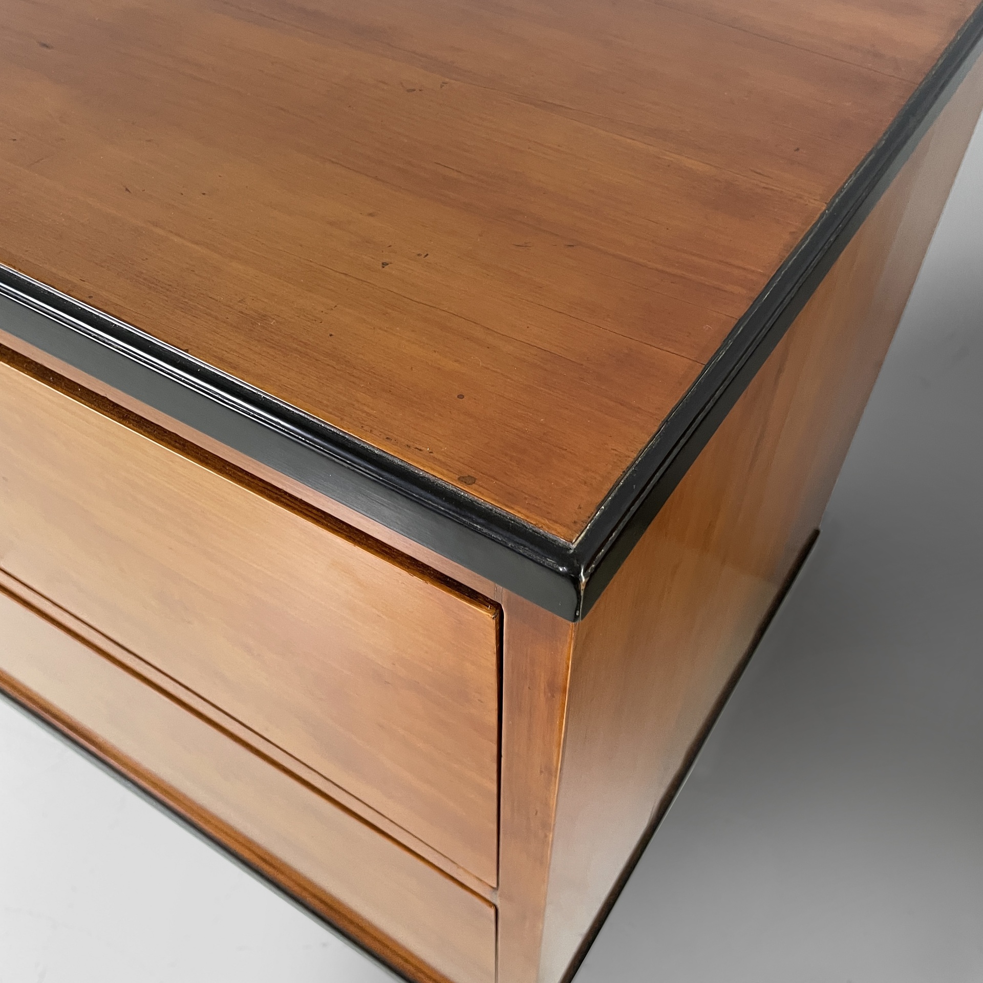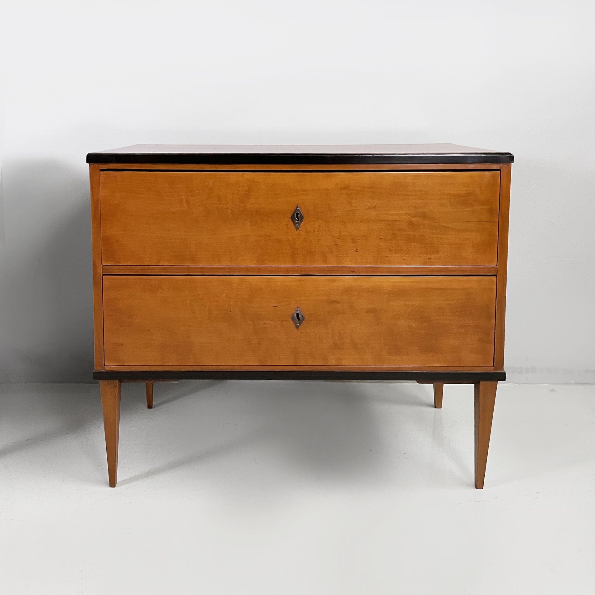 Coppia di cassettiere interamente in legno. Il piano rettangolare presenta un profilo nero. Sul fronte sono presenti due cassetti. Zampe a sezione squadrata. In stile Biedermeier (1850 ca.)
