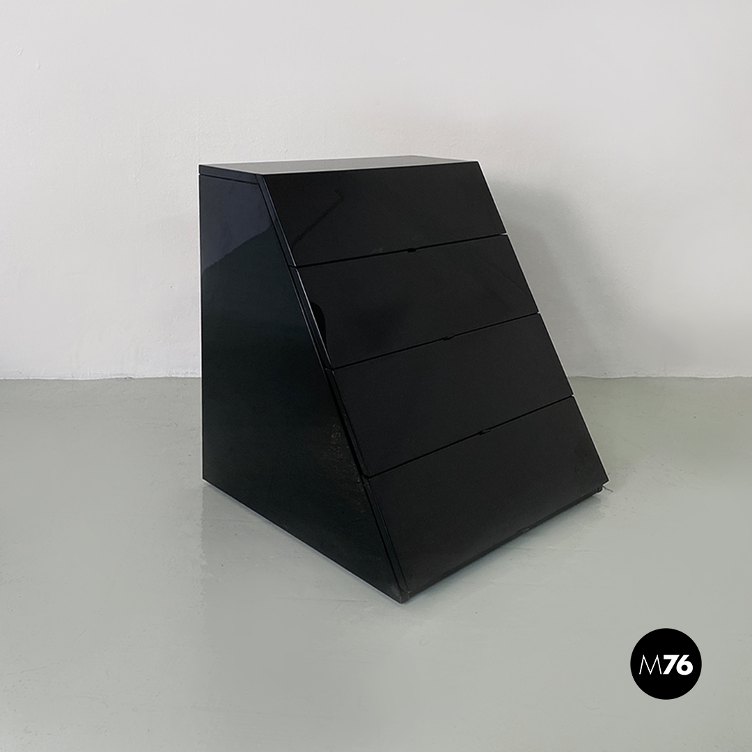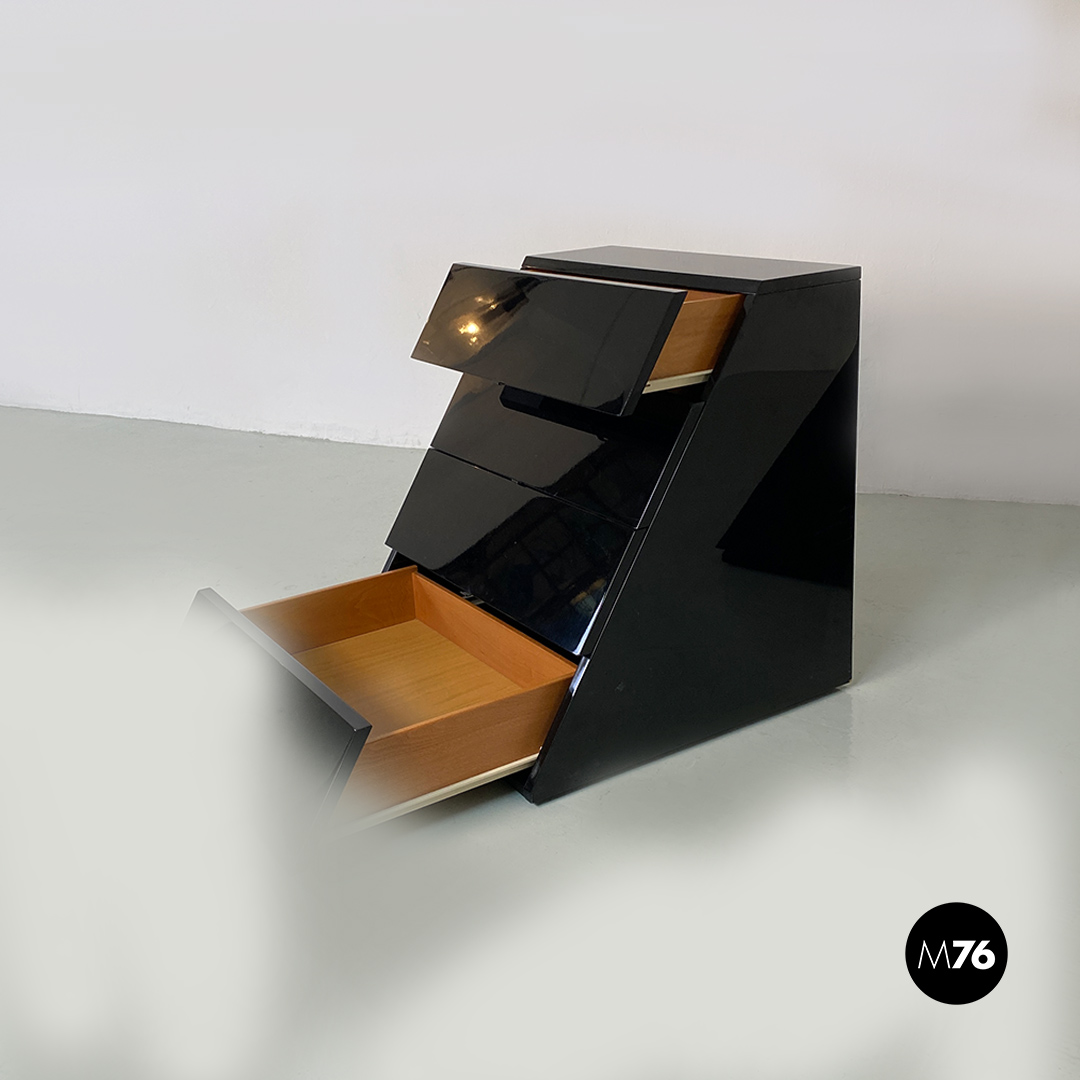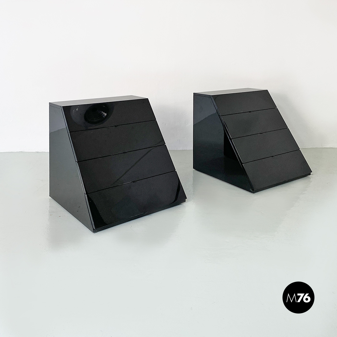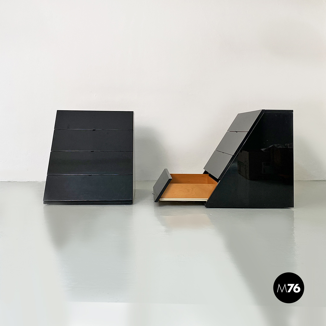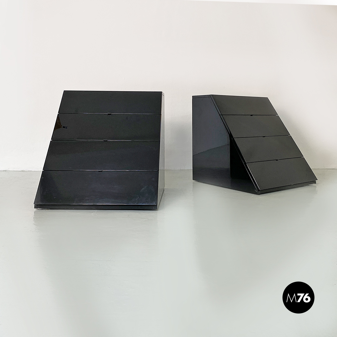 Coppia di cassettiere con profilo trapezioidale, con quattro cassetti con apertura scorrevole e piccola maniglia centrale. Struttura interamente in legno con laccatura nera sui tre lati a vista.