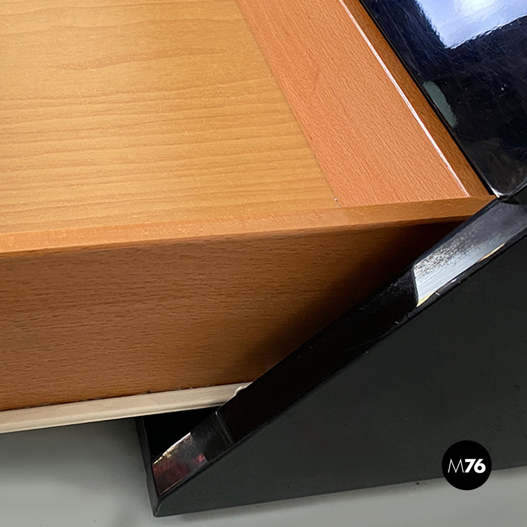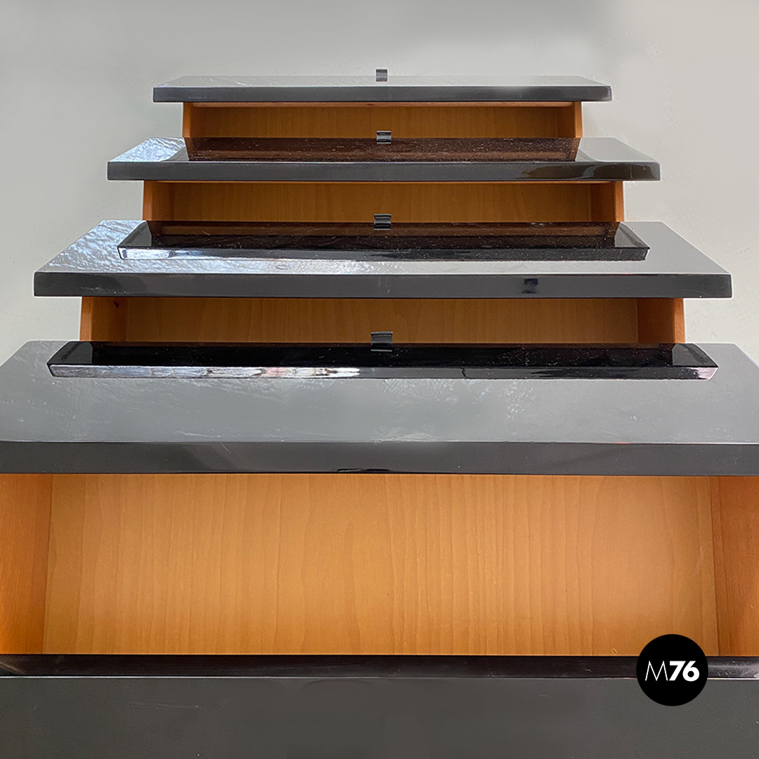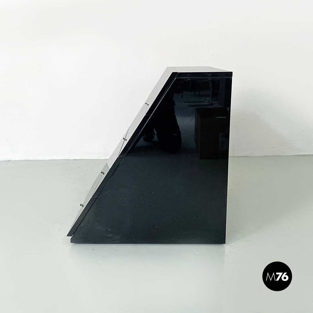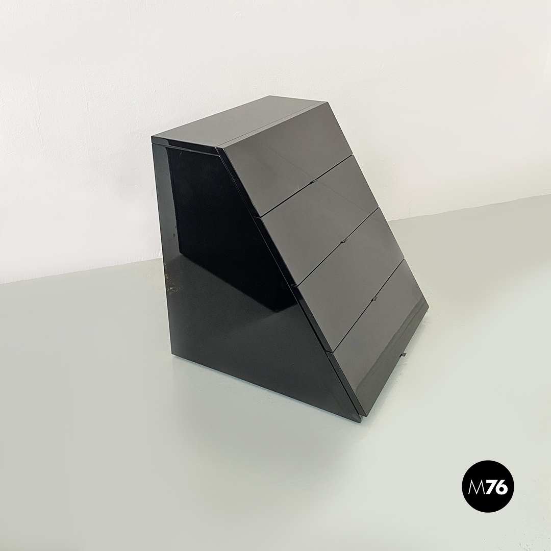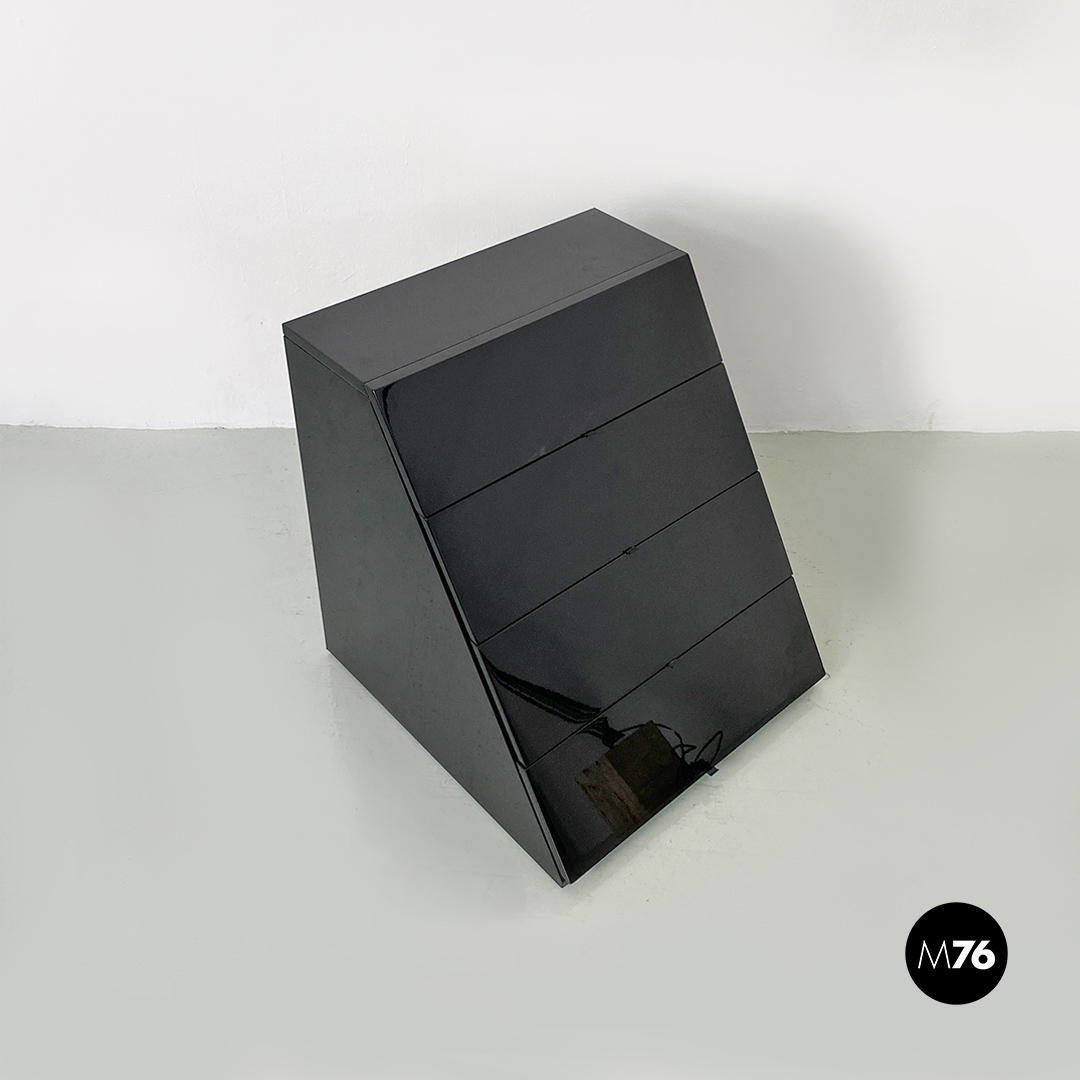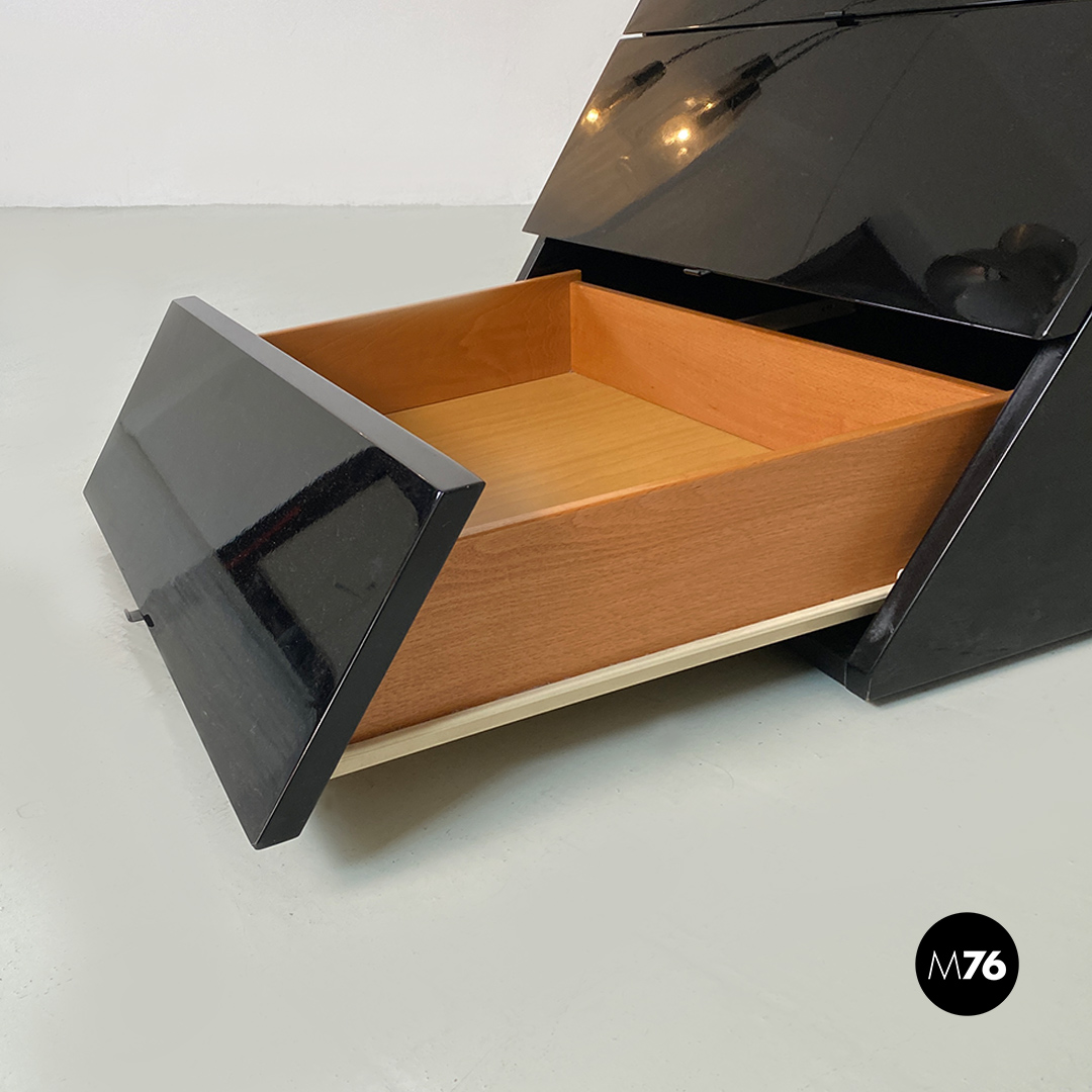 Coppia di cassettiere con profilo trapezioidale, con quattro cassetti con apertura scorrevole e piccola maniglia centrale. Struttura interamente in legno con laccatura nera sui tre lati a vista.