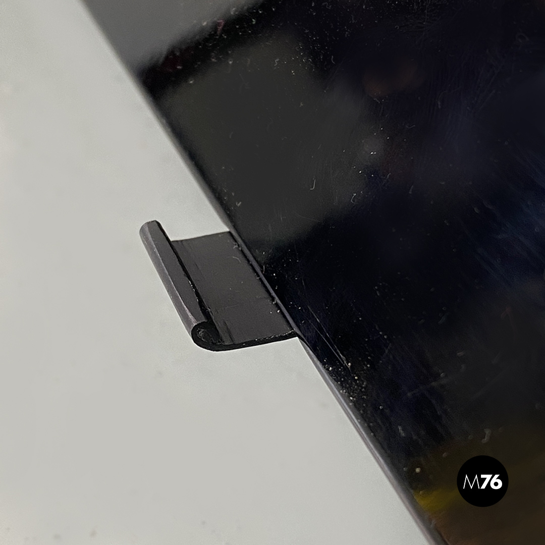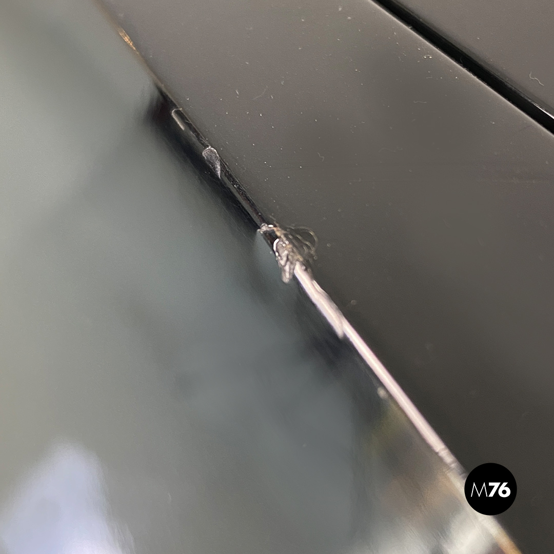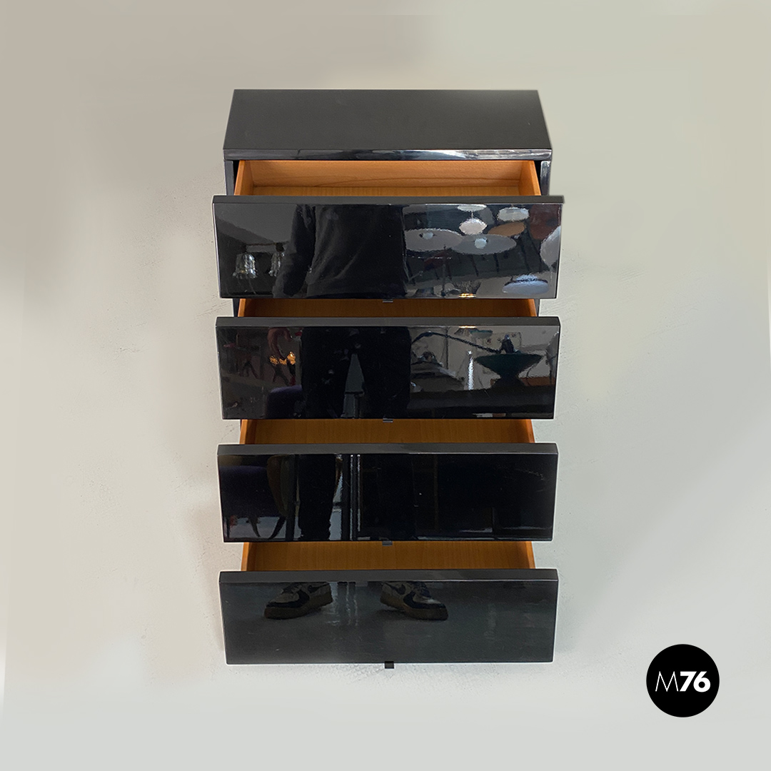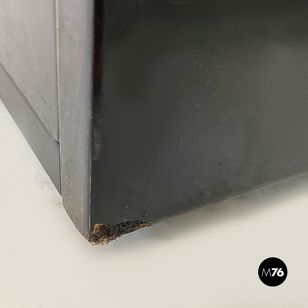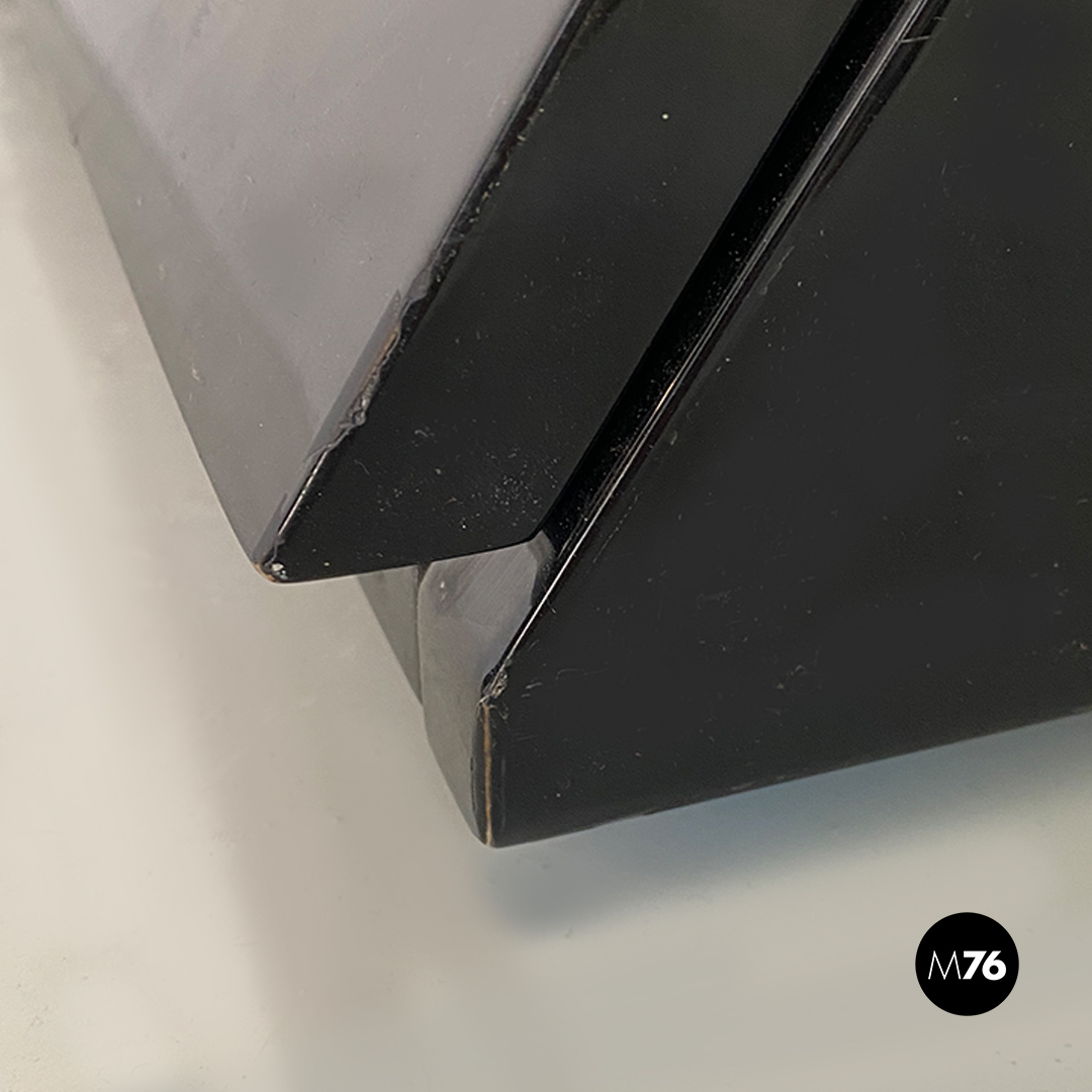 Coppia di cassettiere con profilo trapezioidale, con quattro cassetti con apertura scorrevole e piccola maniglia centrale. Struttura interamente in legno con laccatura nera sui tre lati a vista.