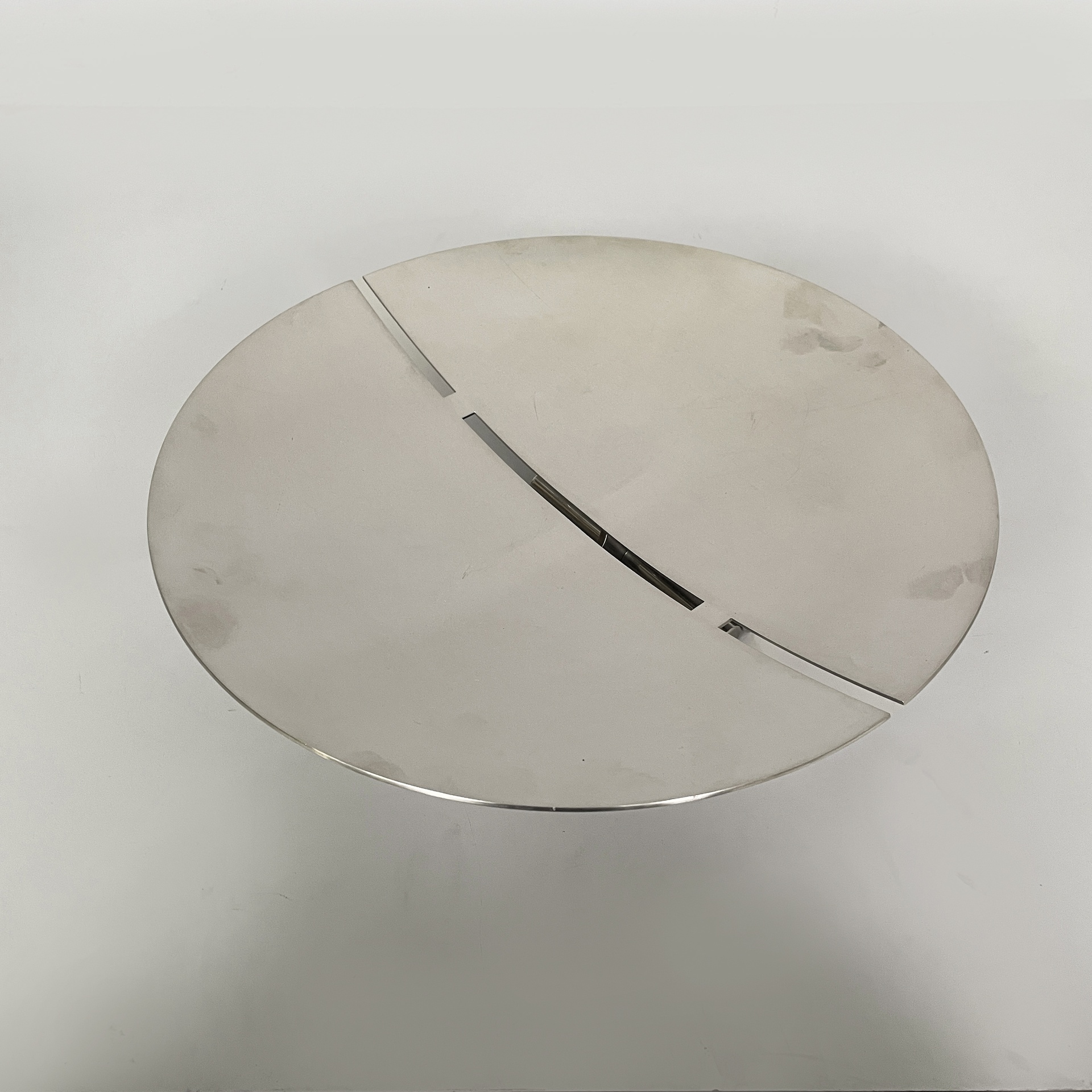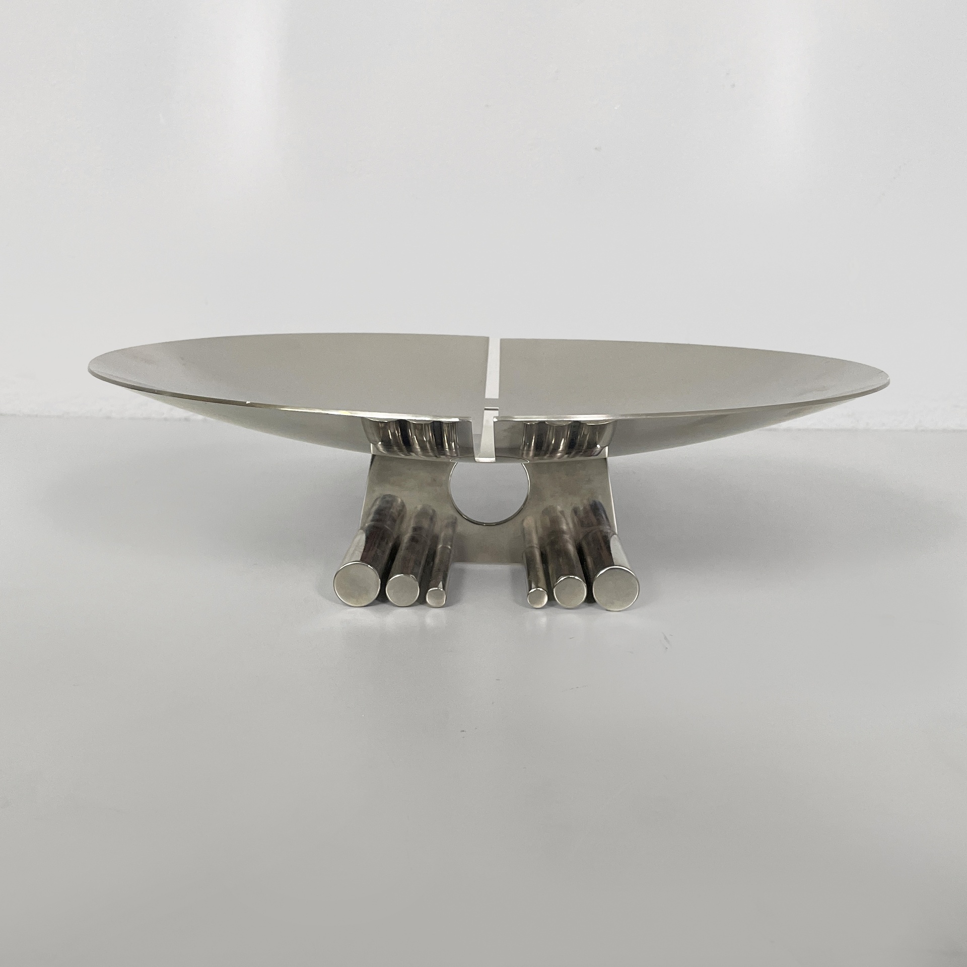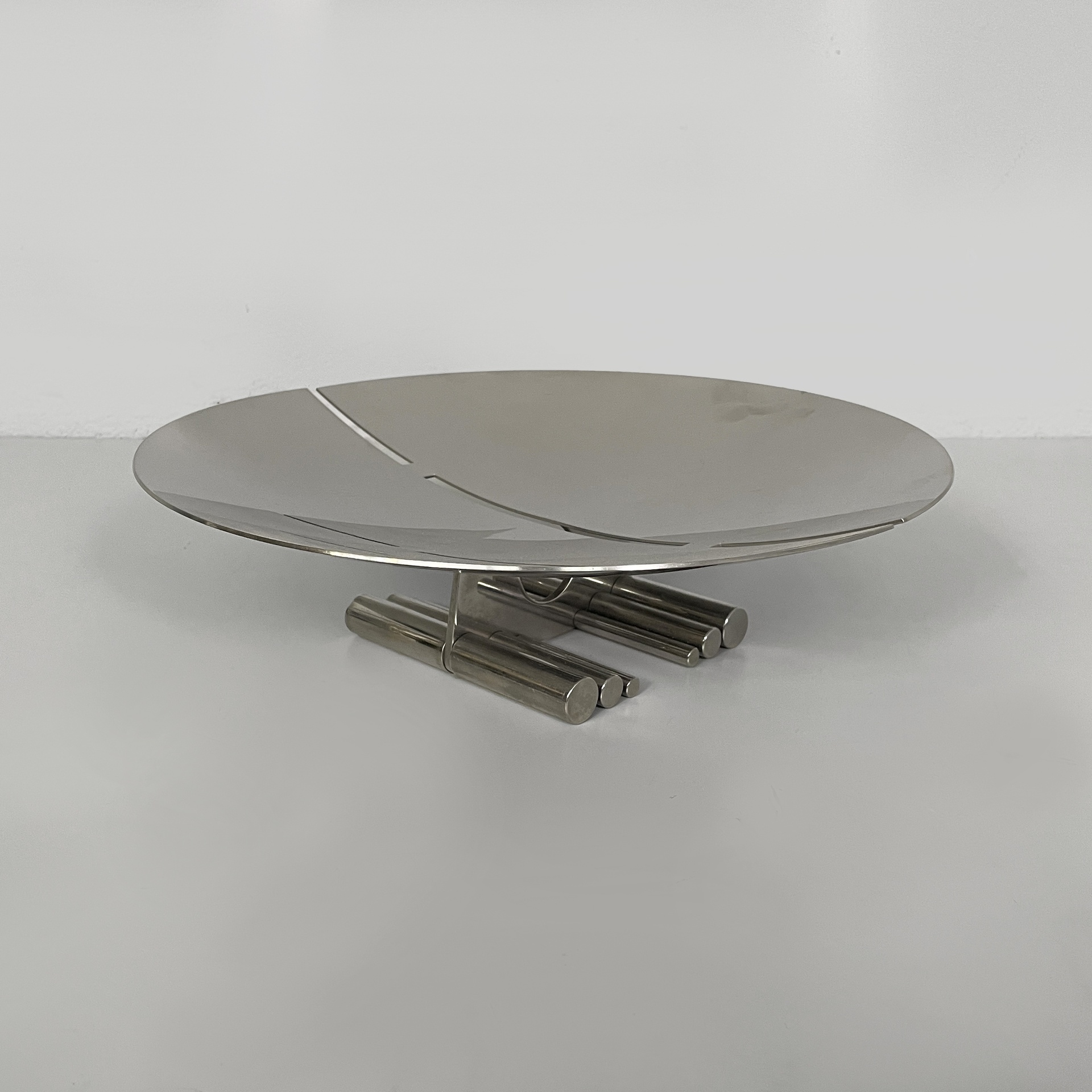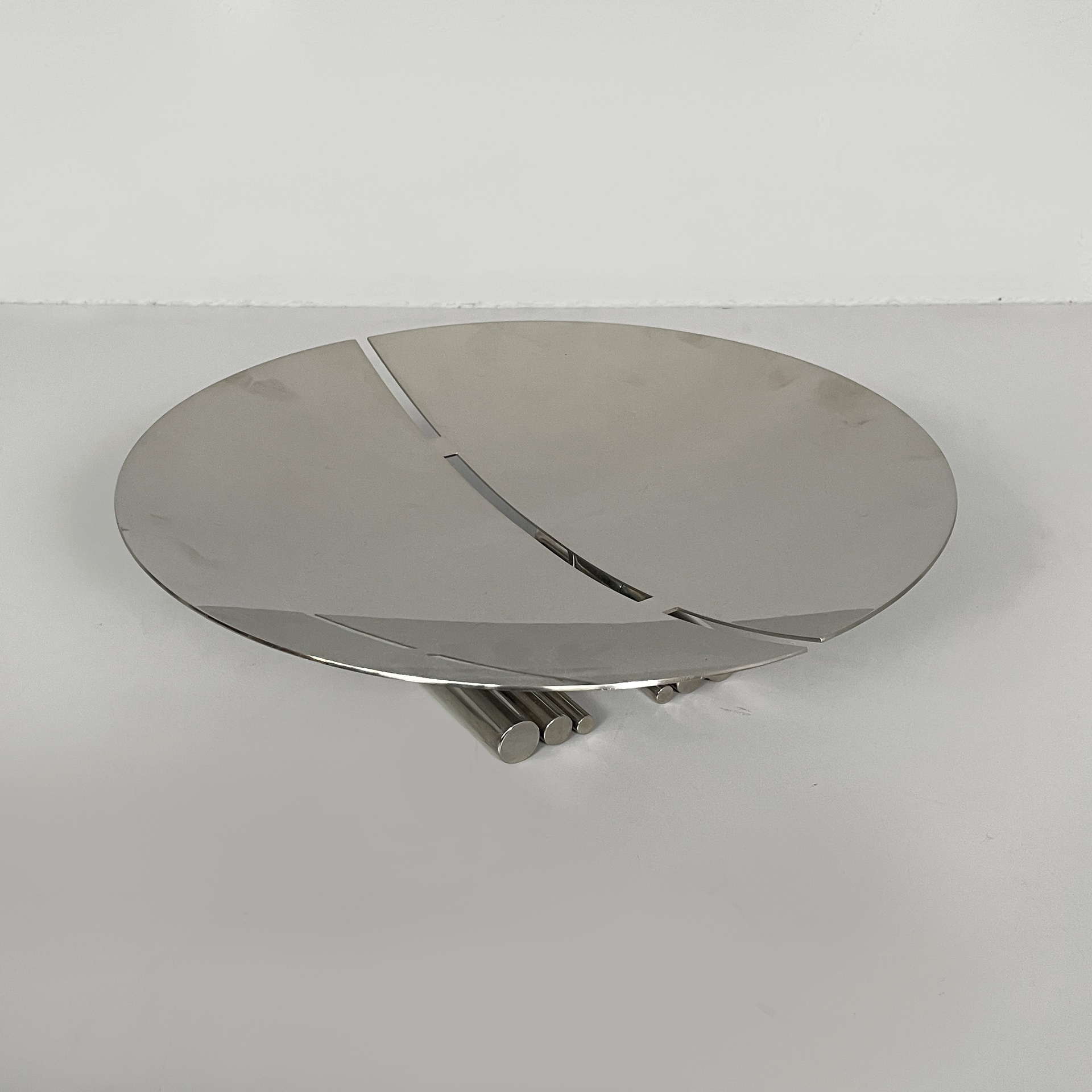 Centrotavola tondo interamente in acciaio. La base presenta due piedini composti da tondini d’acciaio.