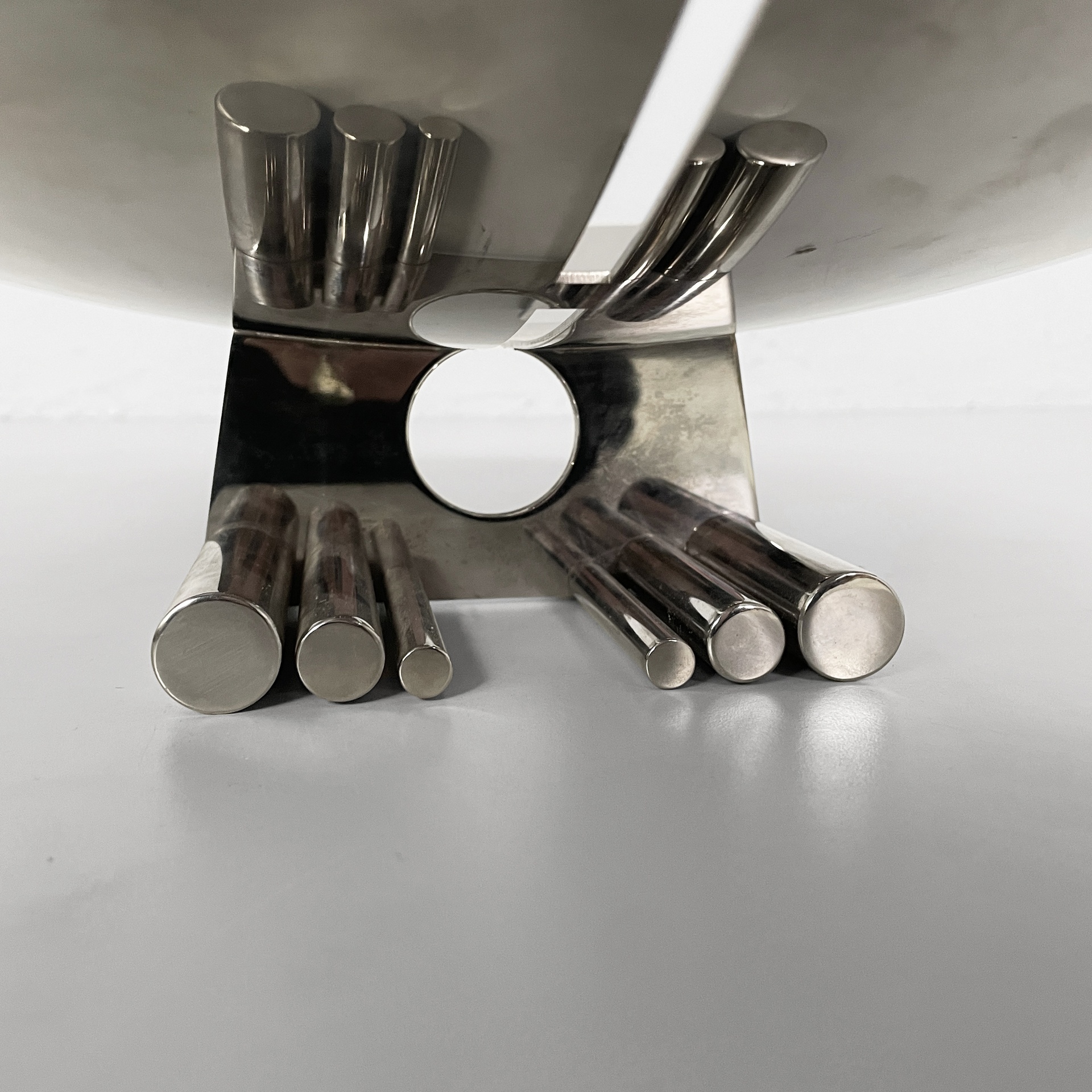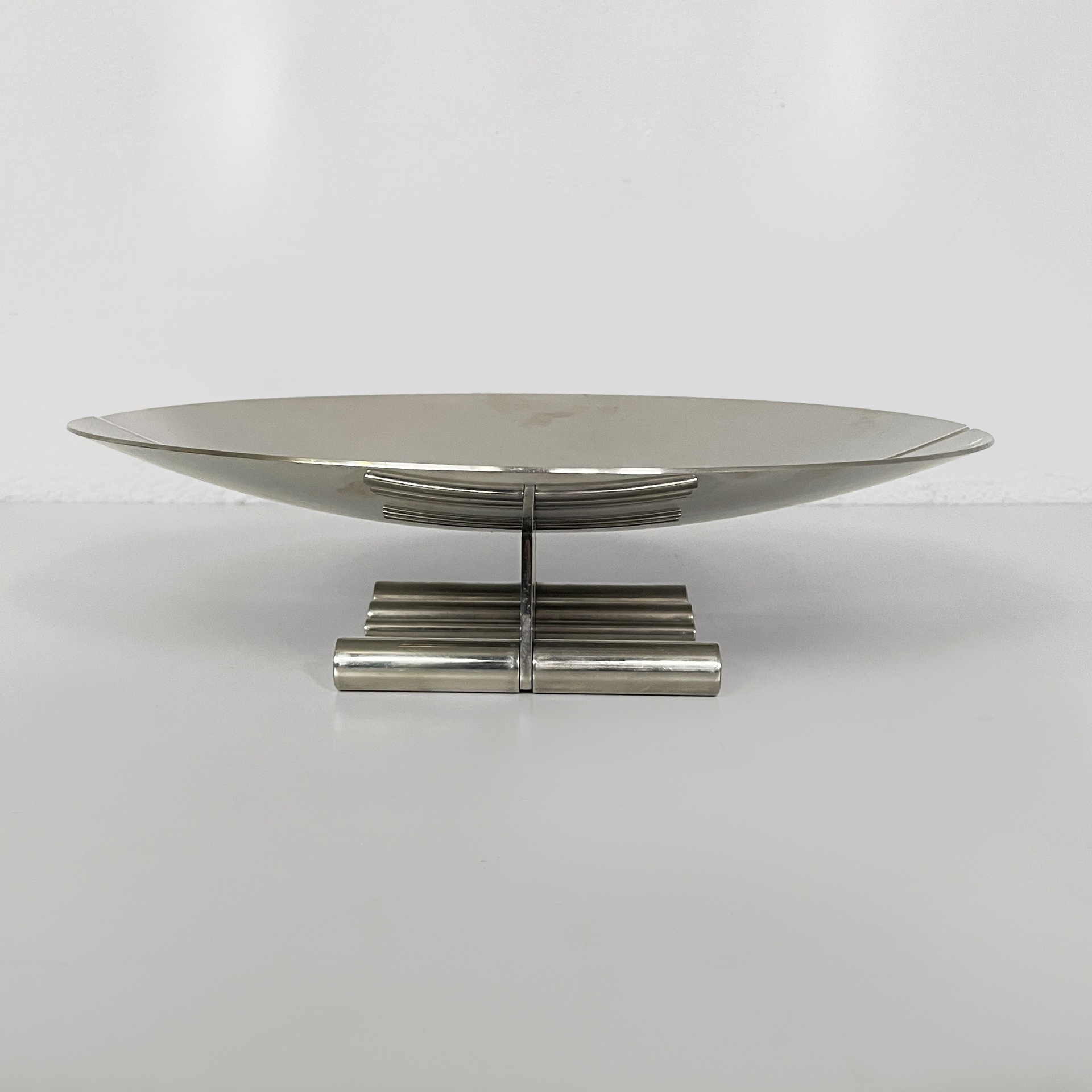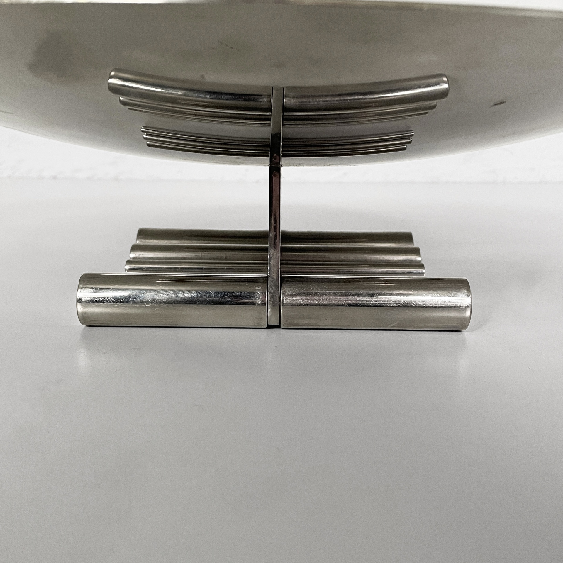 Centrotavola tondo interamente in acciaio. La base presenta due piedini composti da tondini d’acciaio.