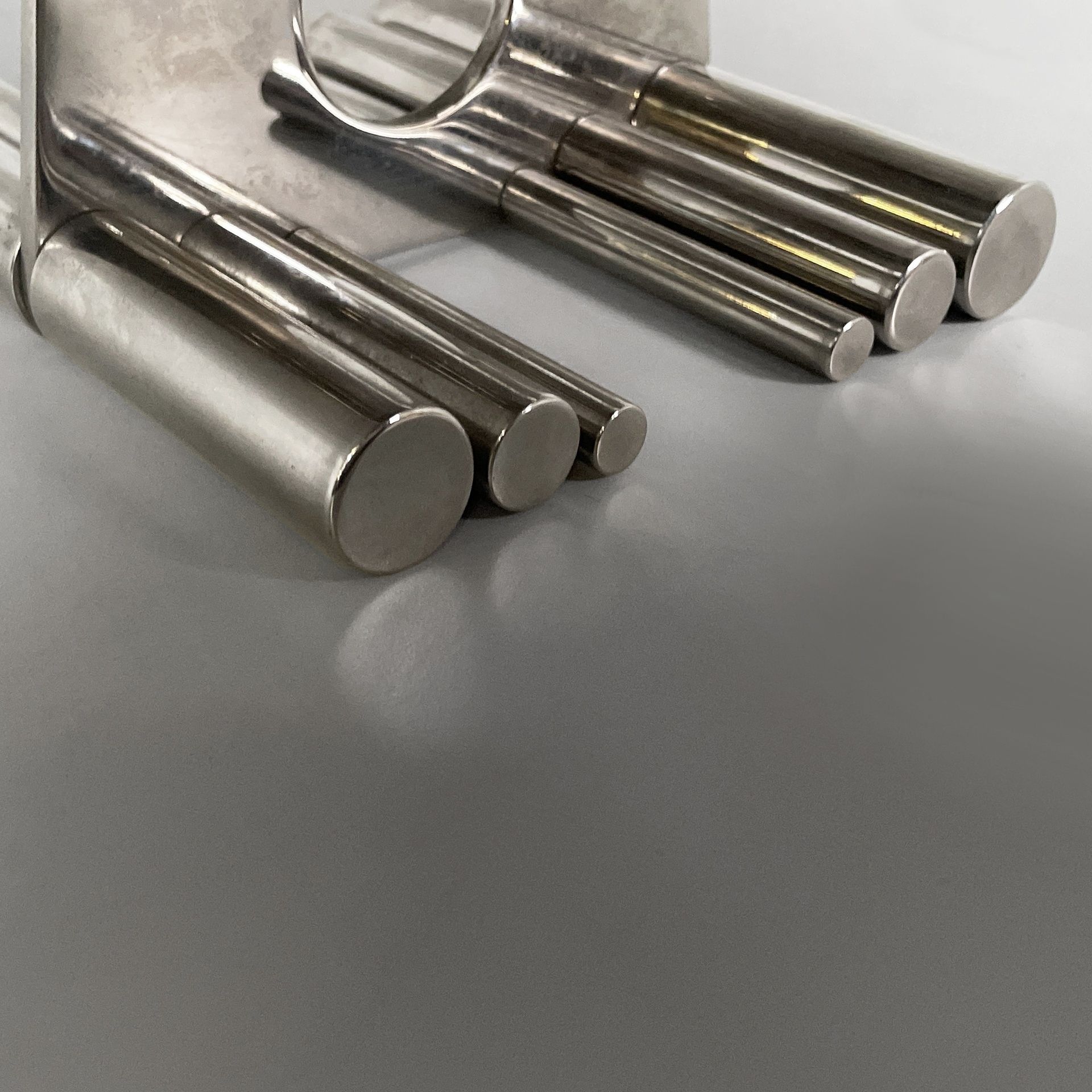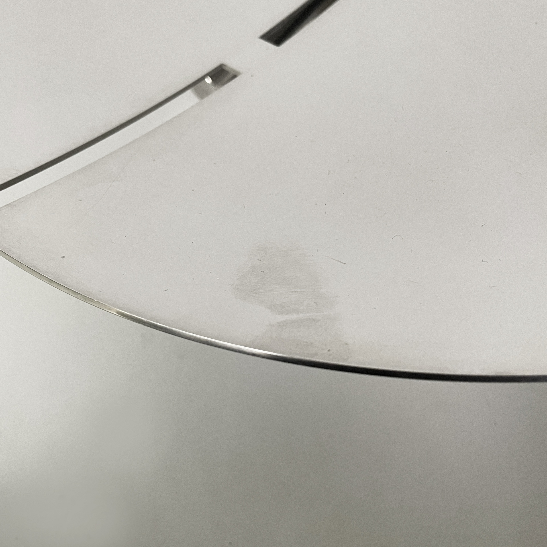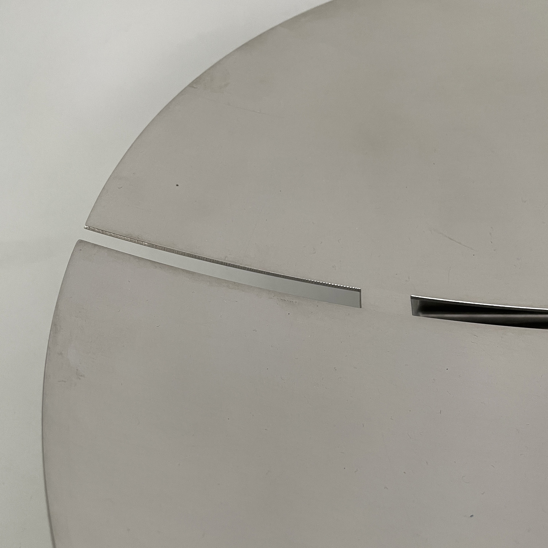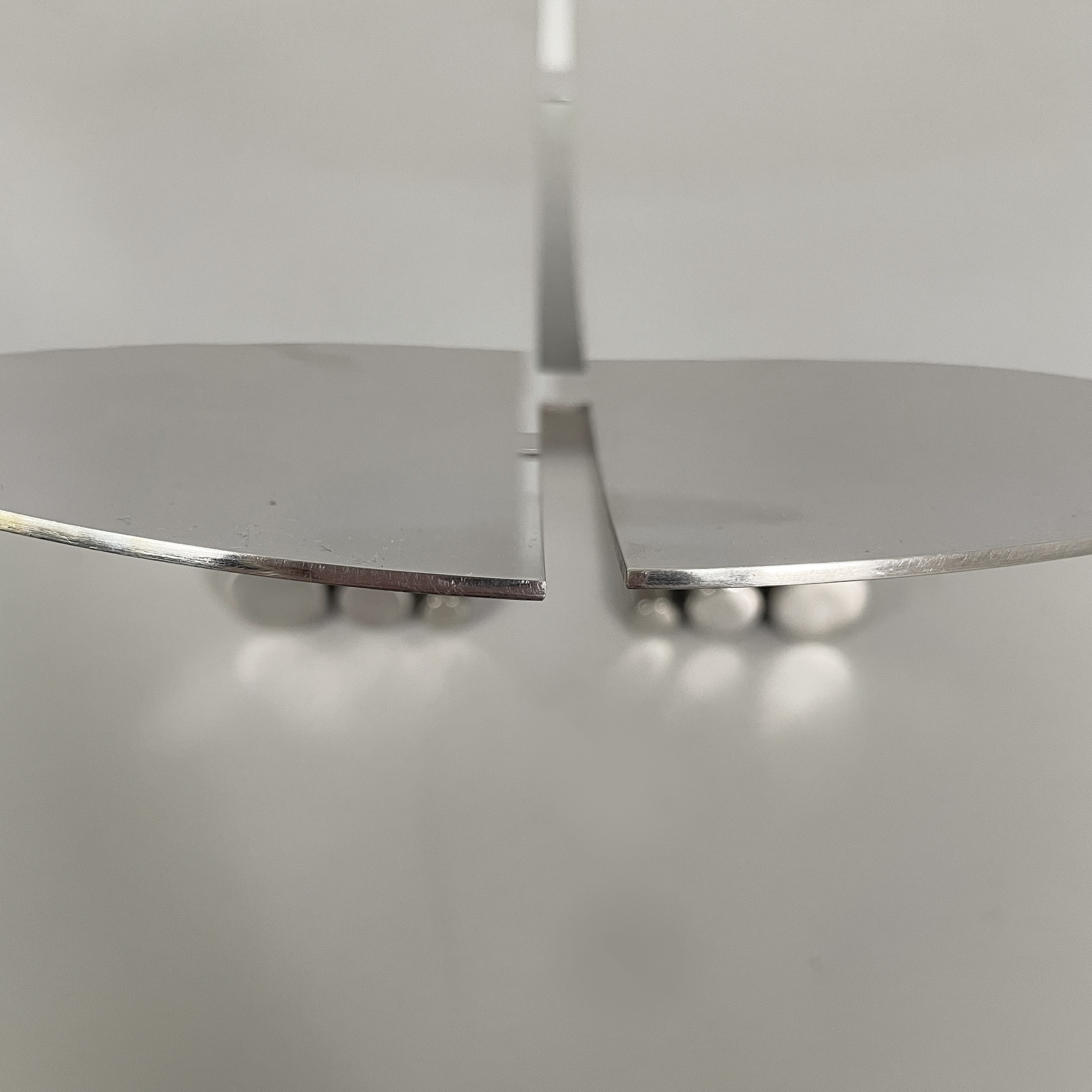 Centrotavola tondo interamente in acciaio. La base presenta due piedini composti da tondini d’acciaio.