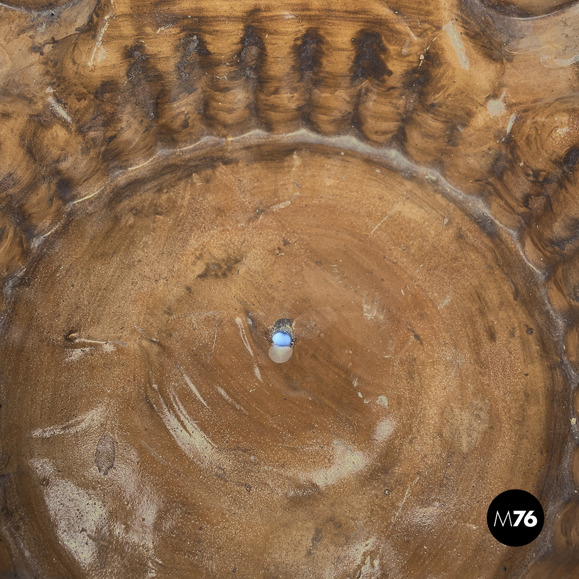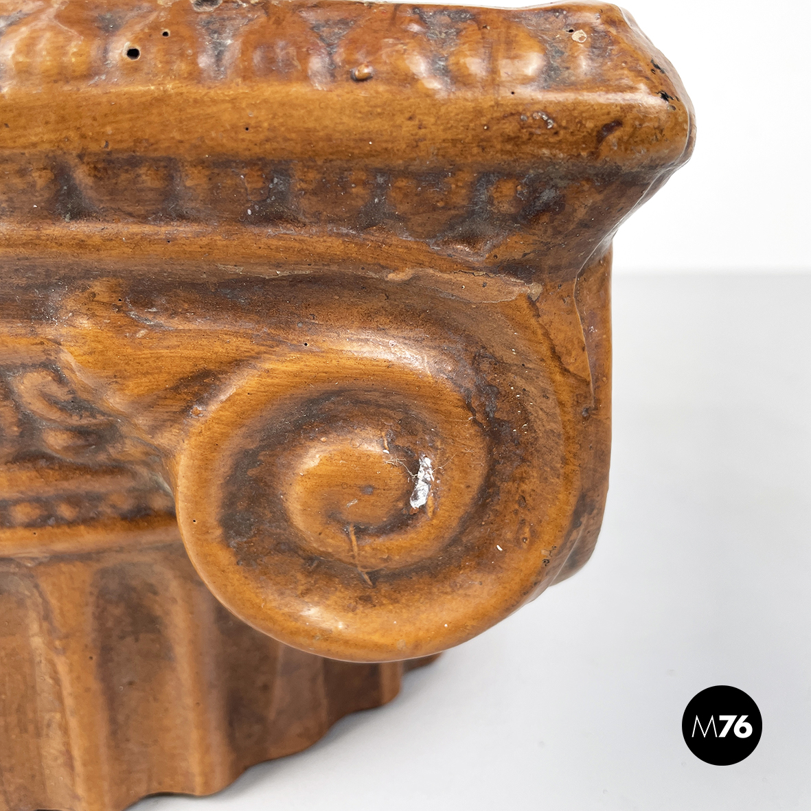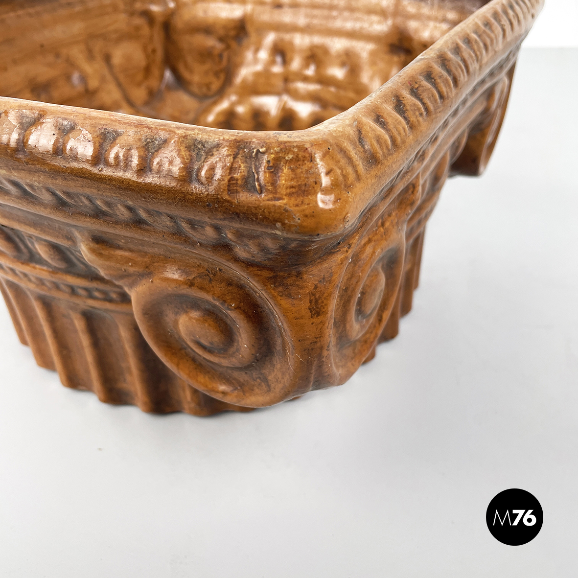 Centrotavola a base tonda in ceramica verniciata marrone. La ciotola ha la forma di un capitello ionico.