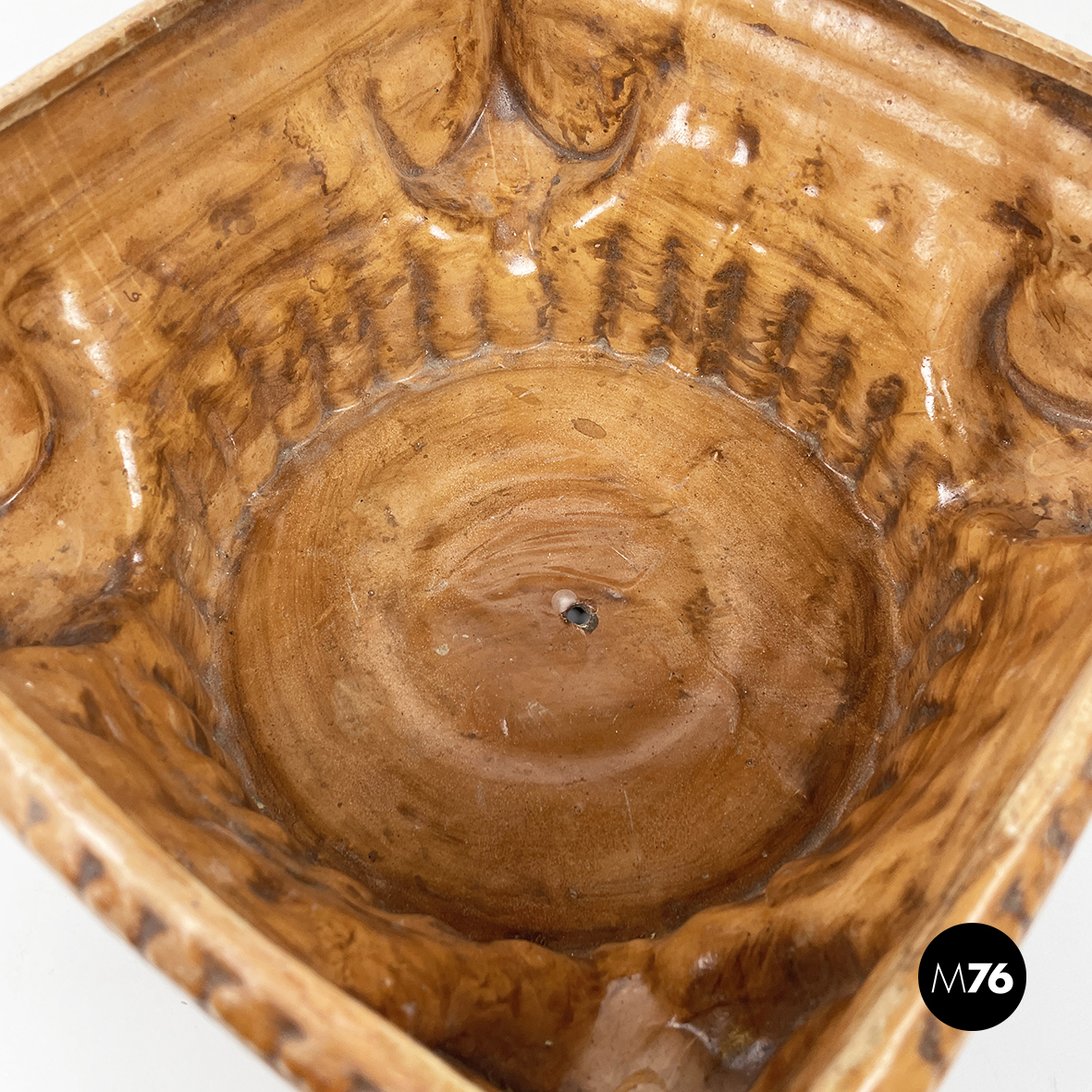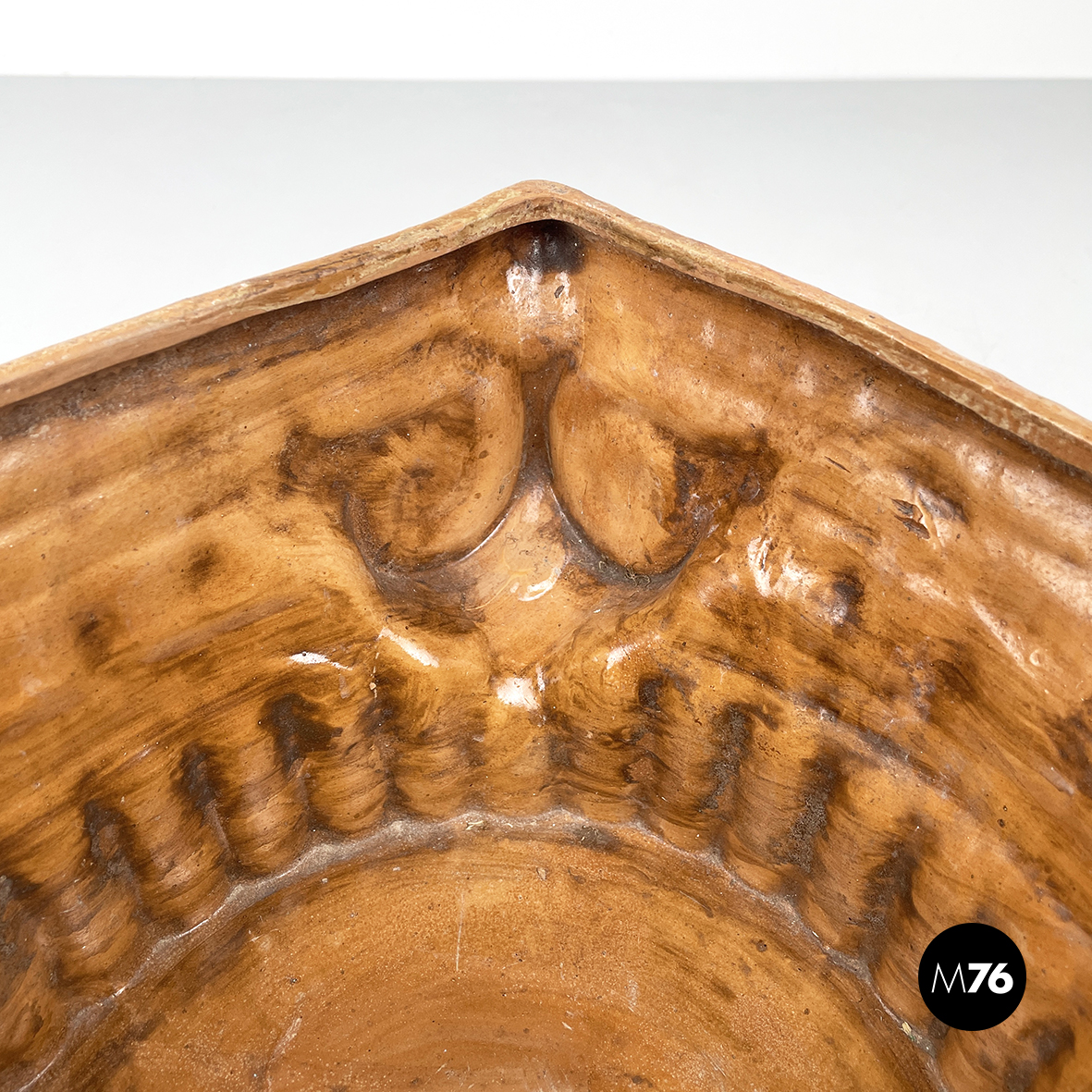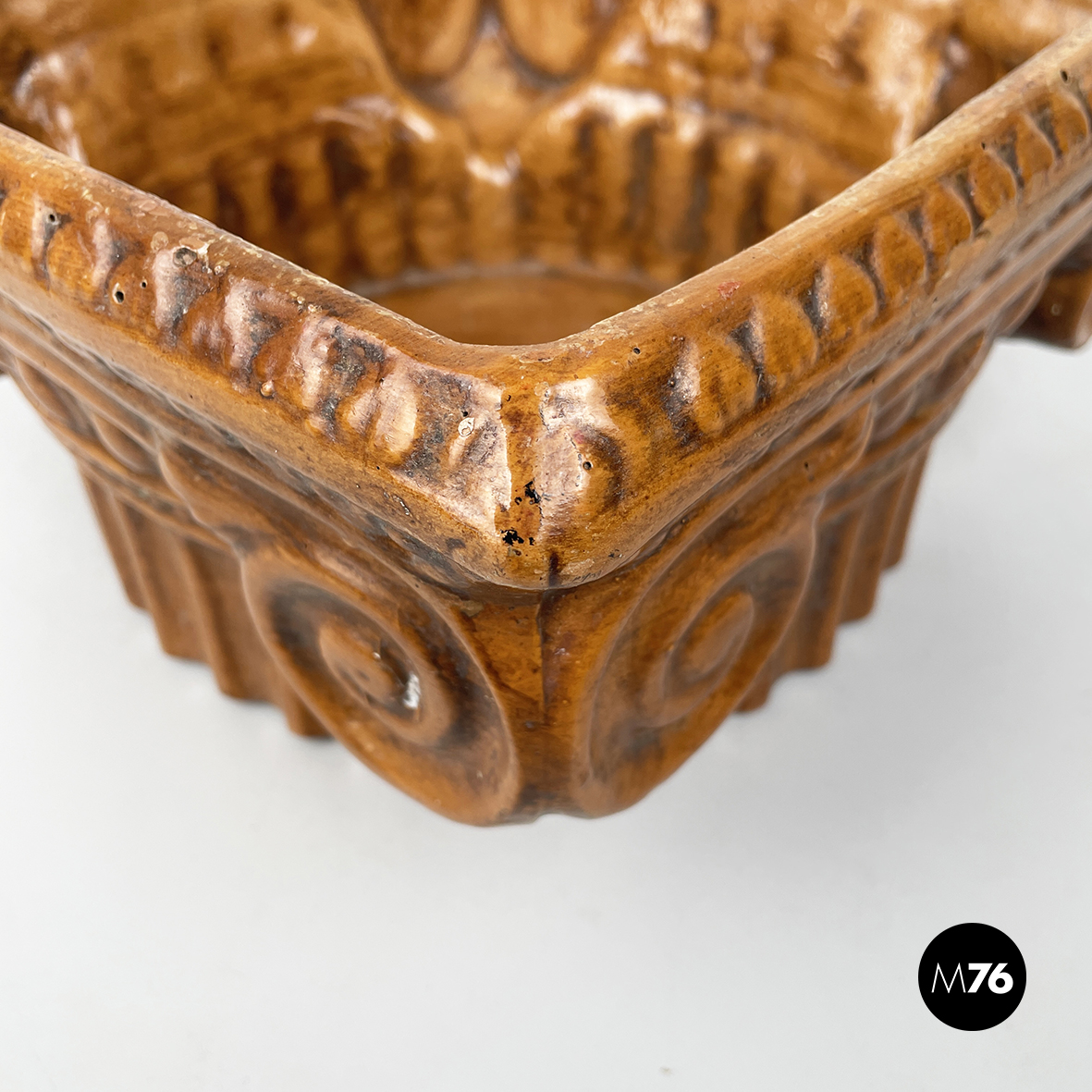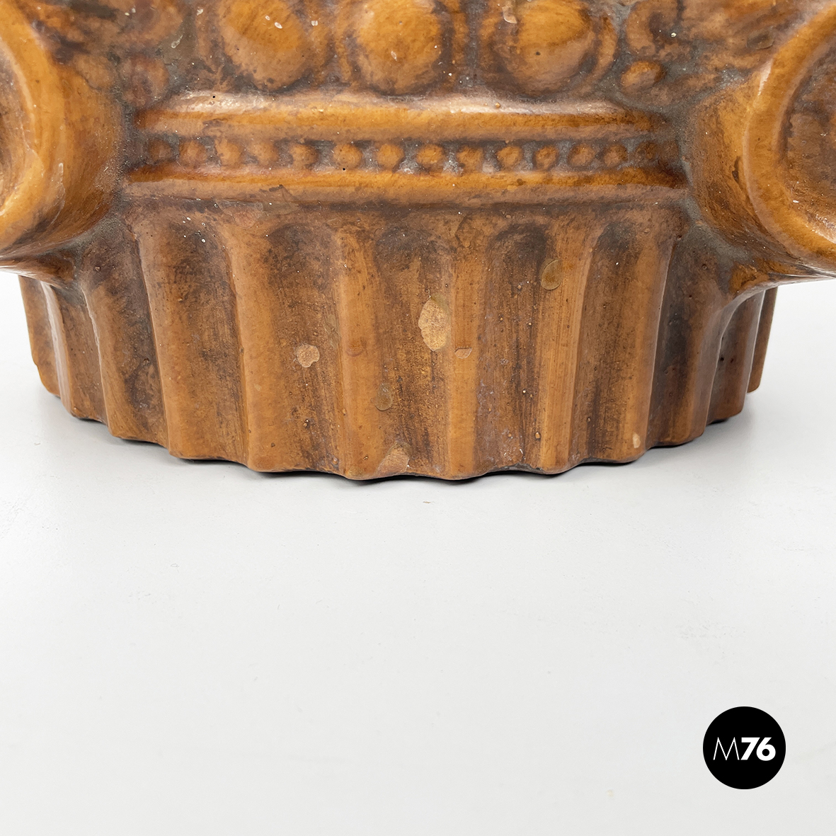 Centrotavola a base tonda in ceramica verniciata marrone. La ciotola ha la forma di un capitello ionico.