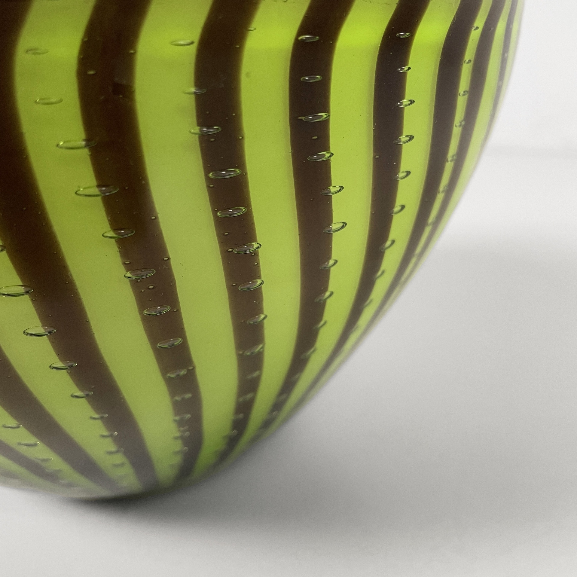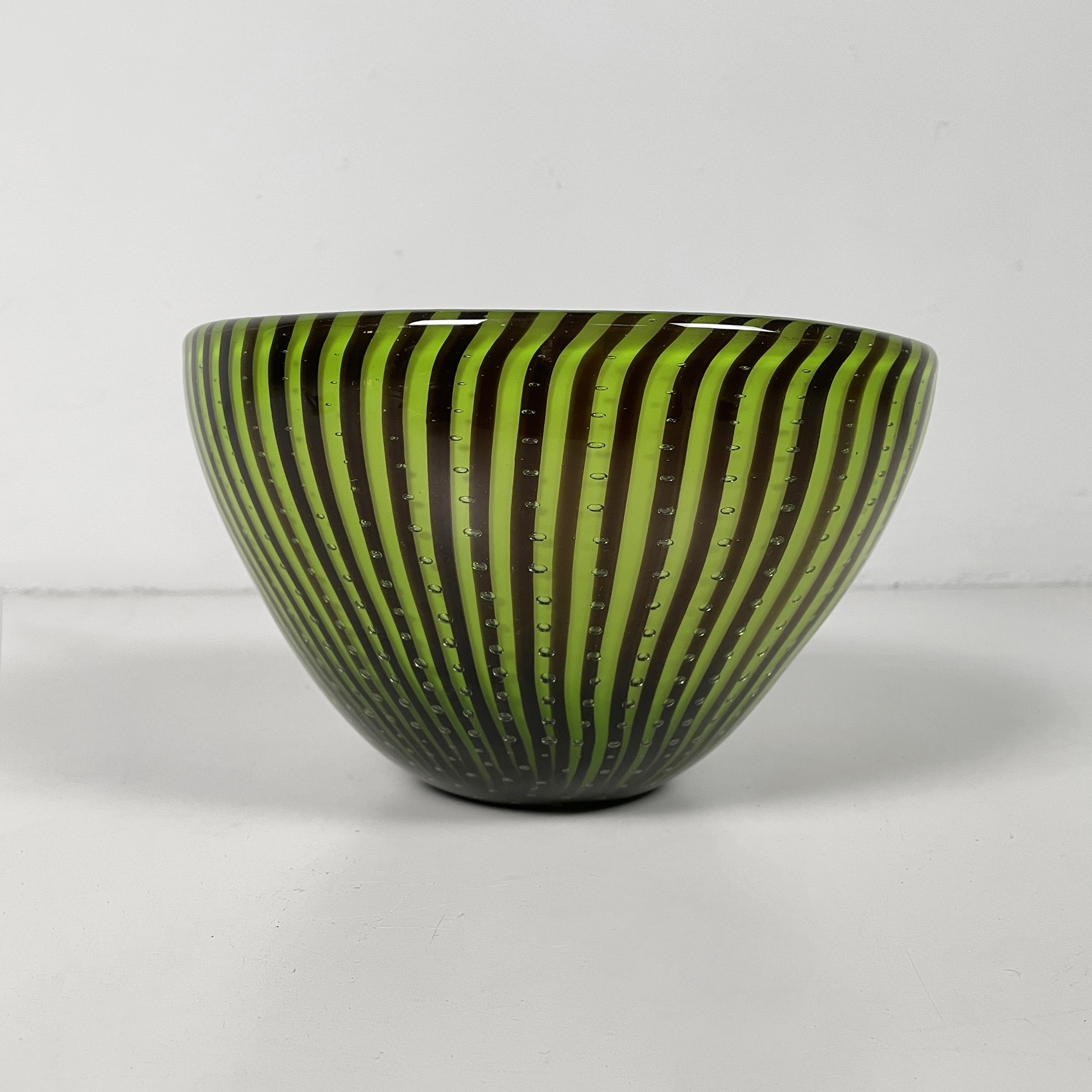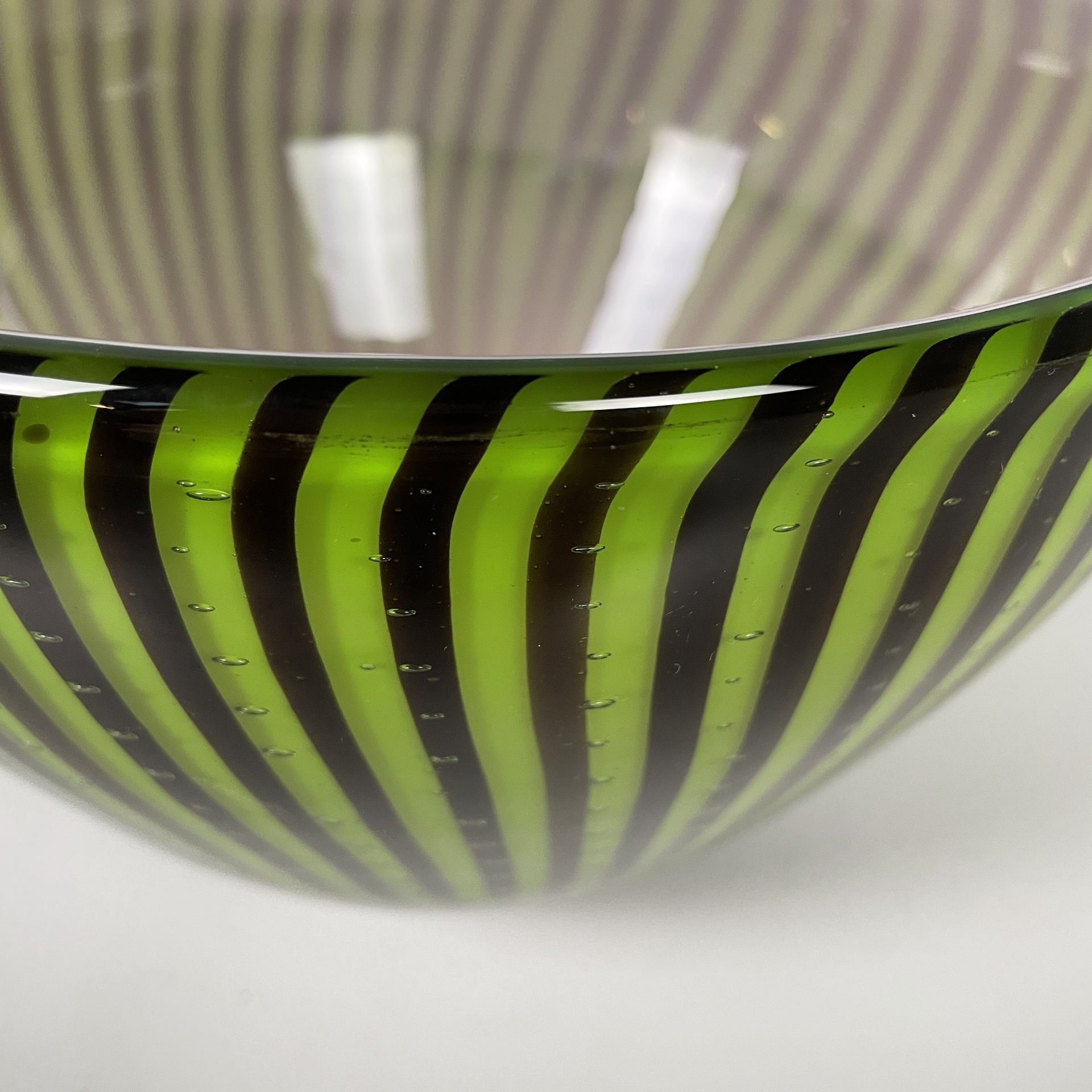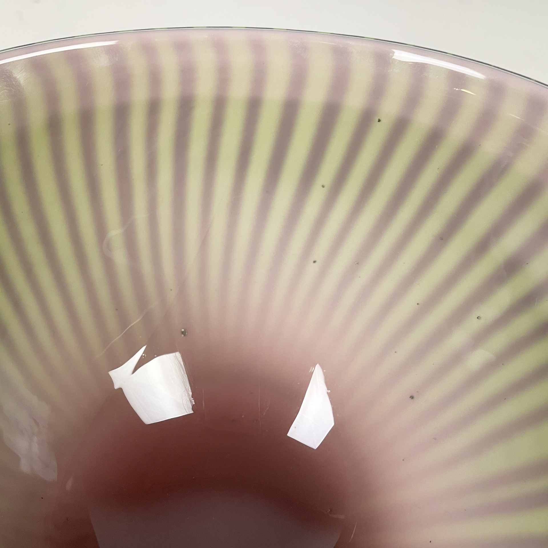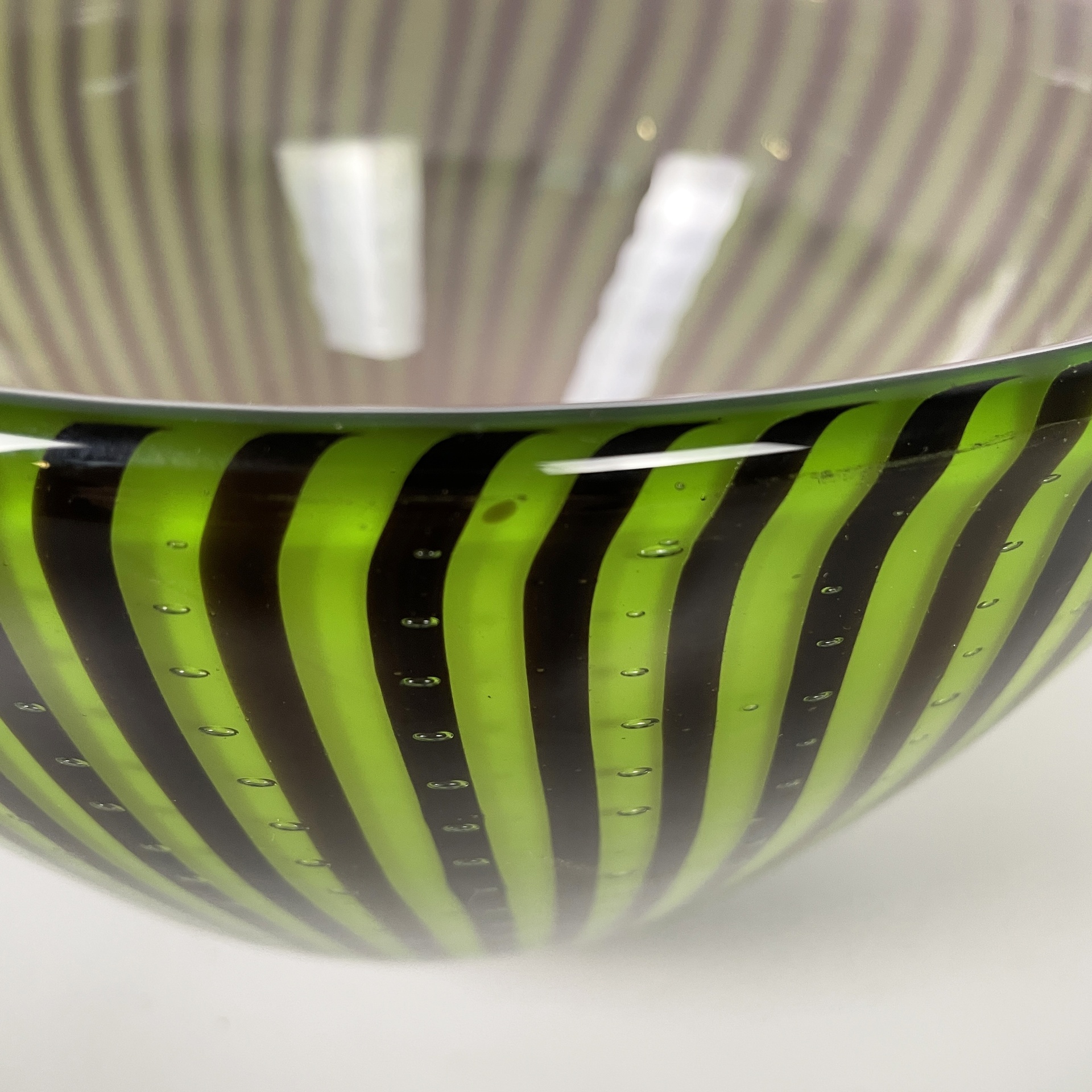 Centrotavola a base tonda in vetro. L’esterno della ciotola è a strisce in verde chiaro e verde scuro esternamente, mentre l’interno a è bianco e viola. Utilizzabile come svuotatasche.
