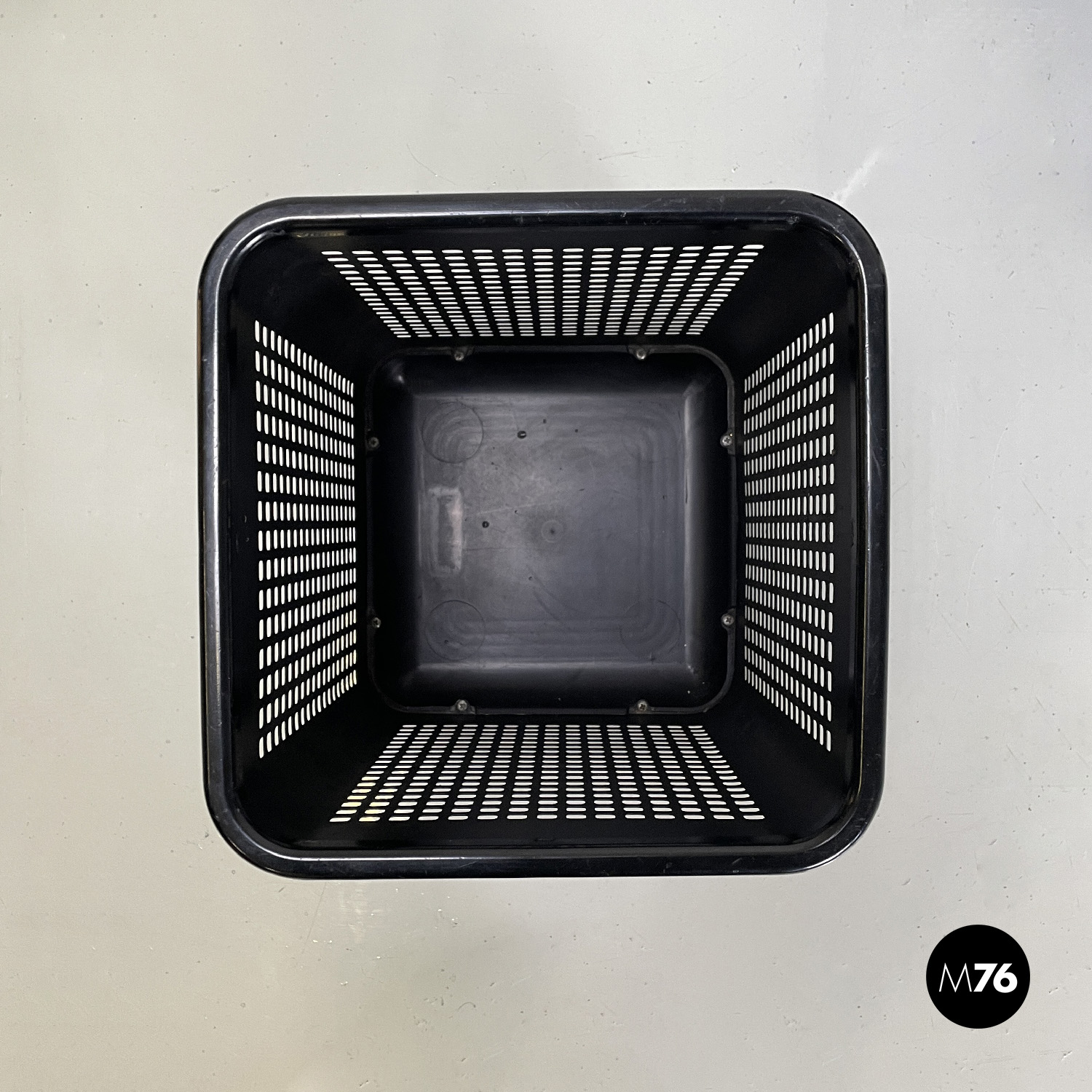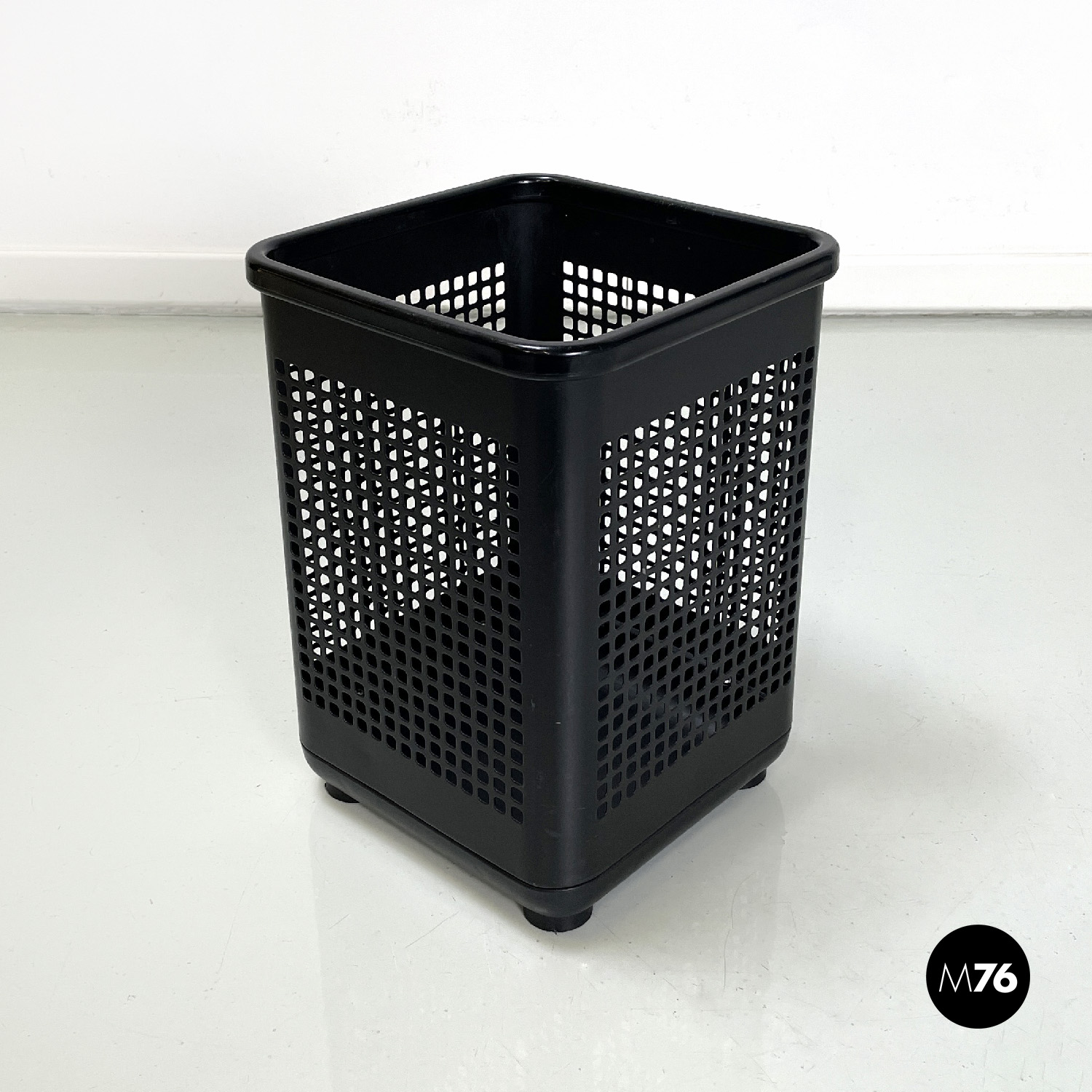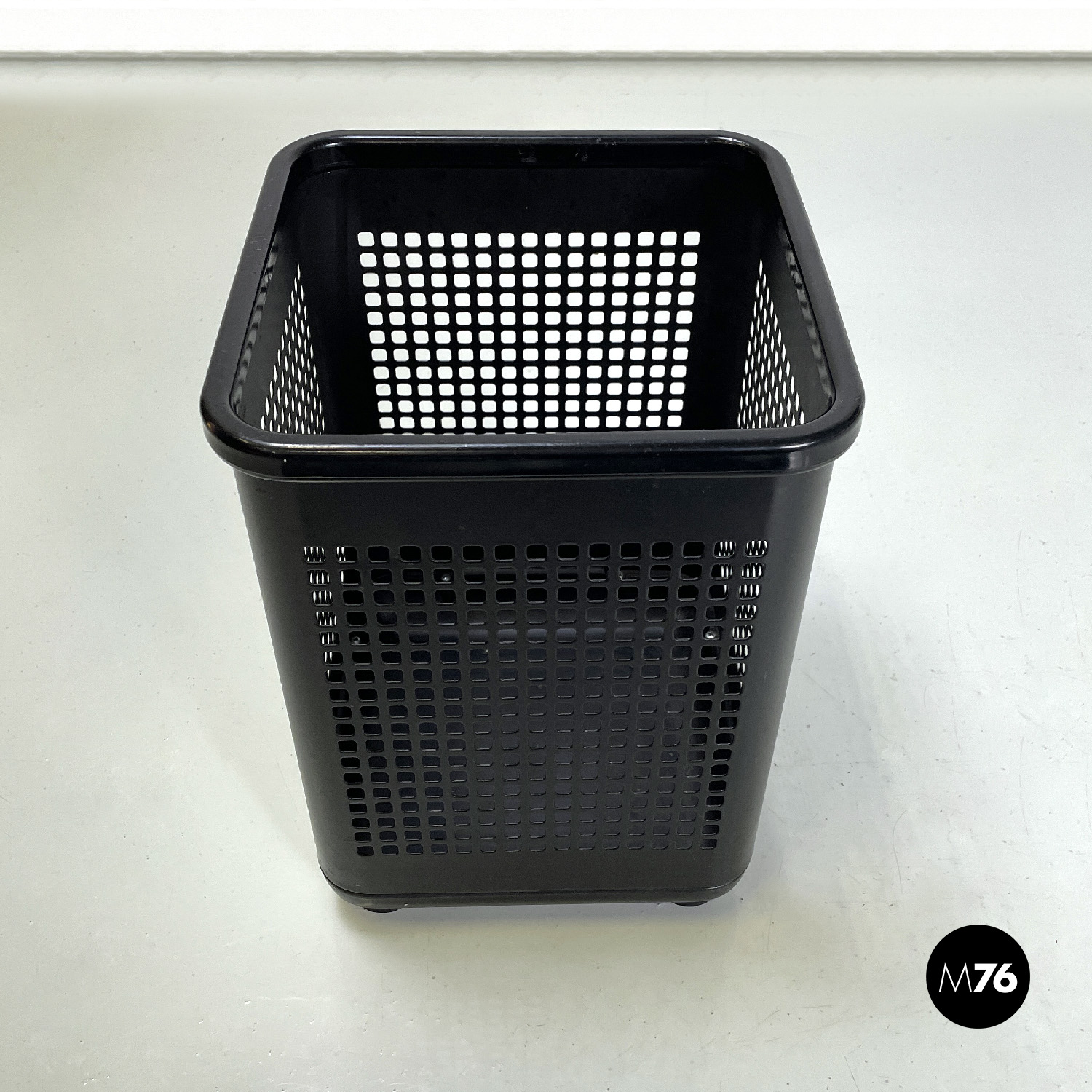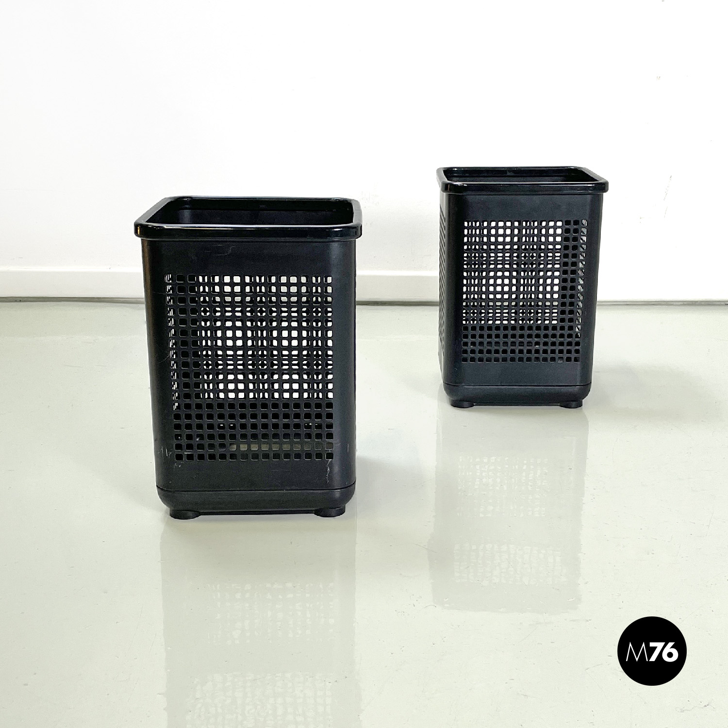 Coppia di cestini da ufficio a base quadrata. La struttura principale è composta da una lamiera forata con fori quadrati, ed è verniciata in nero con finitura opaca. La parte superiore e la base con piedini tondi sono in plastica nera.