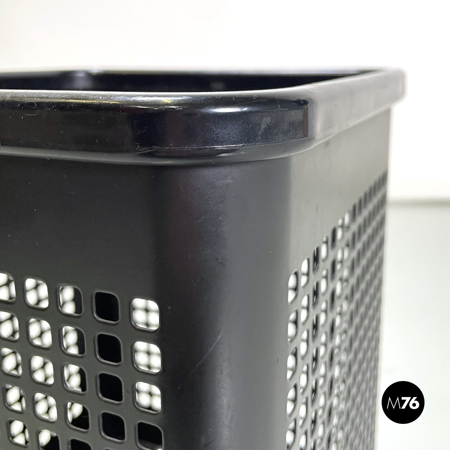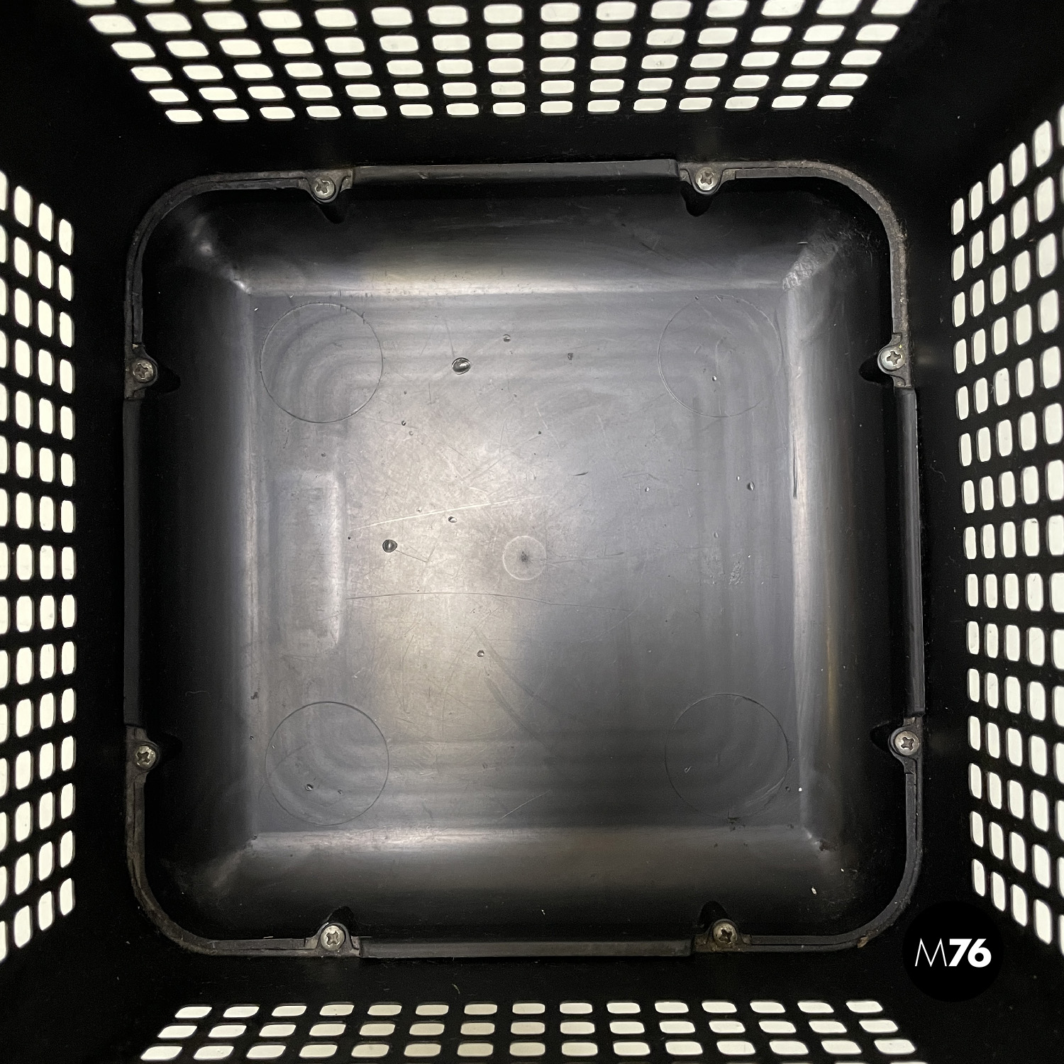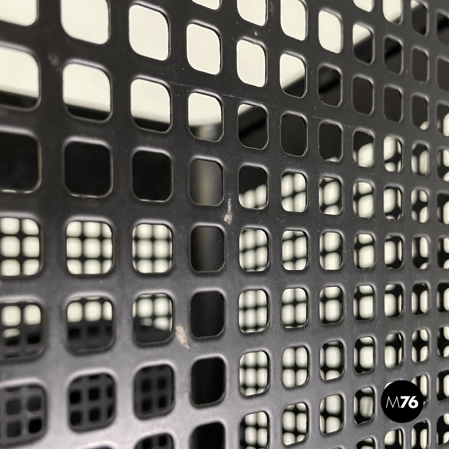 Coppia di cestini da ufficio a base quadrata. La struttura principale è composta da una lamiera forata con fori quadrati, ed è verniciata in nero con finitura opaca. La parte superiore e la base con piedini tondi sono in plastica nera.