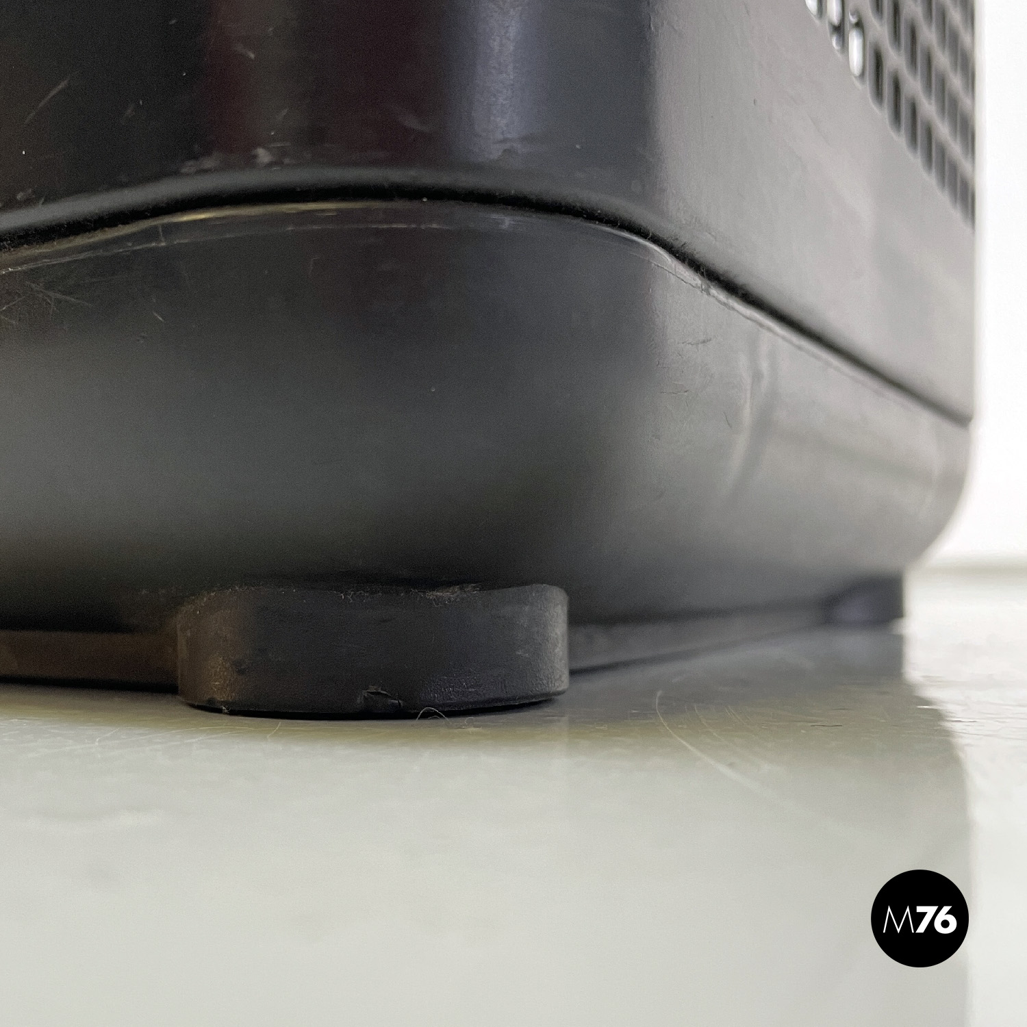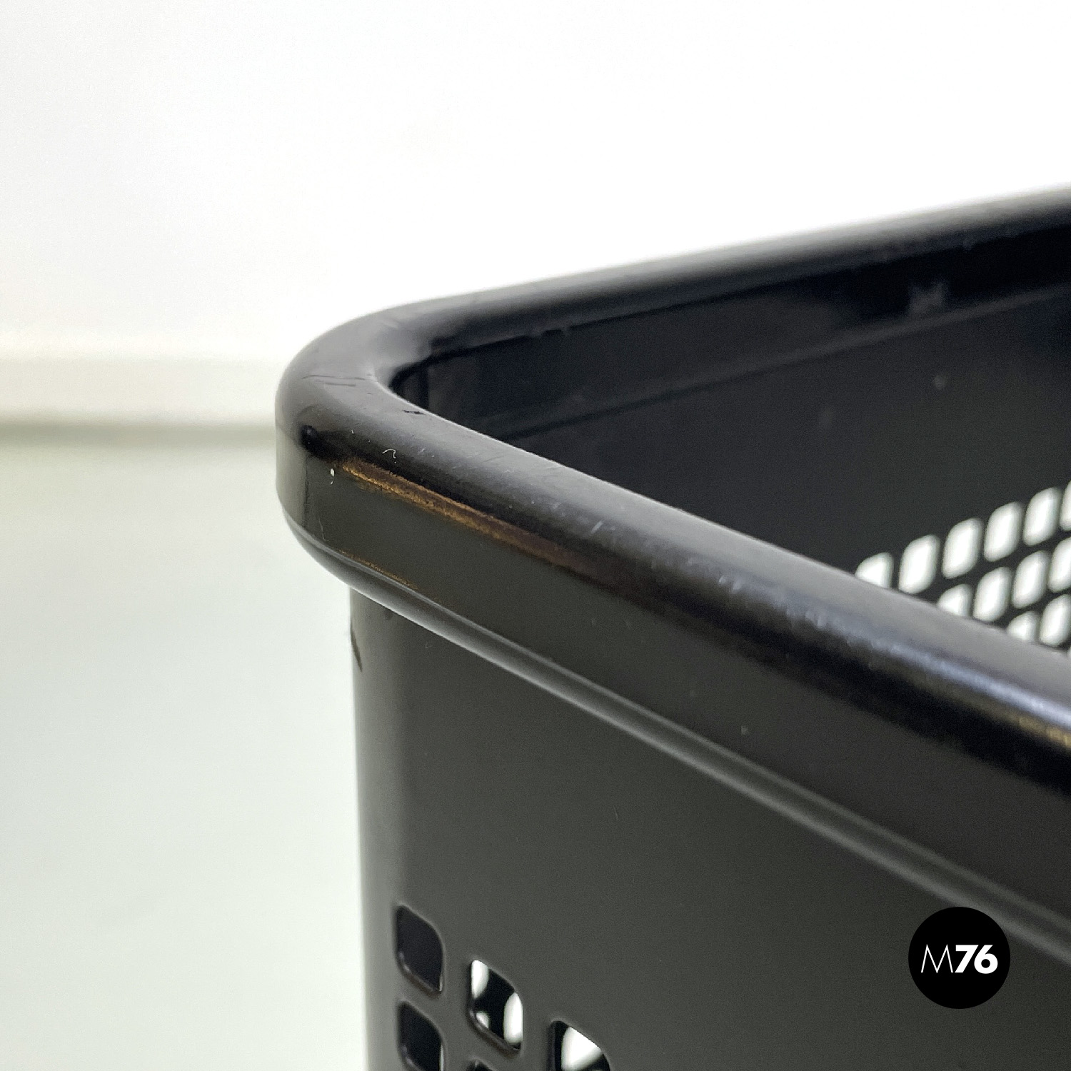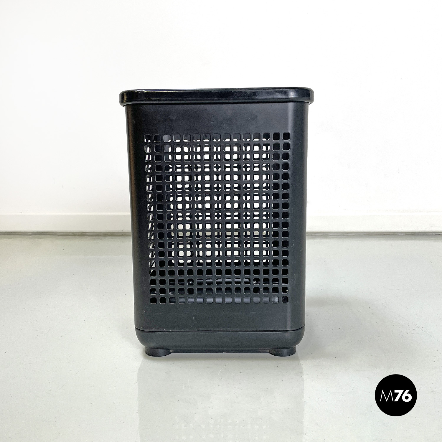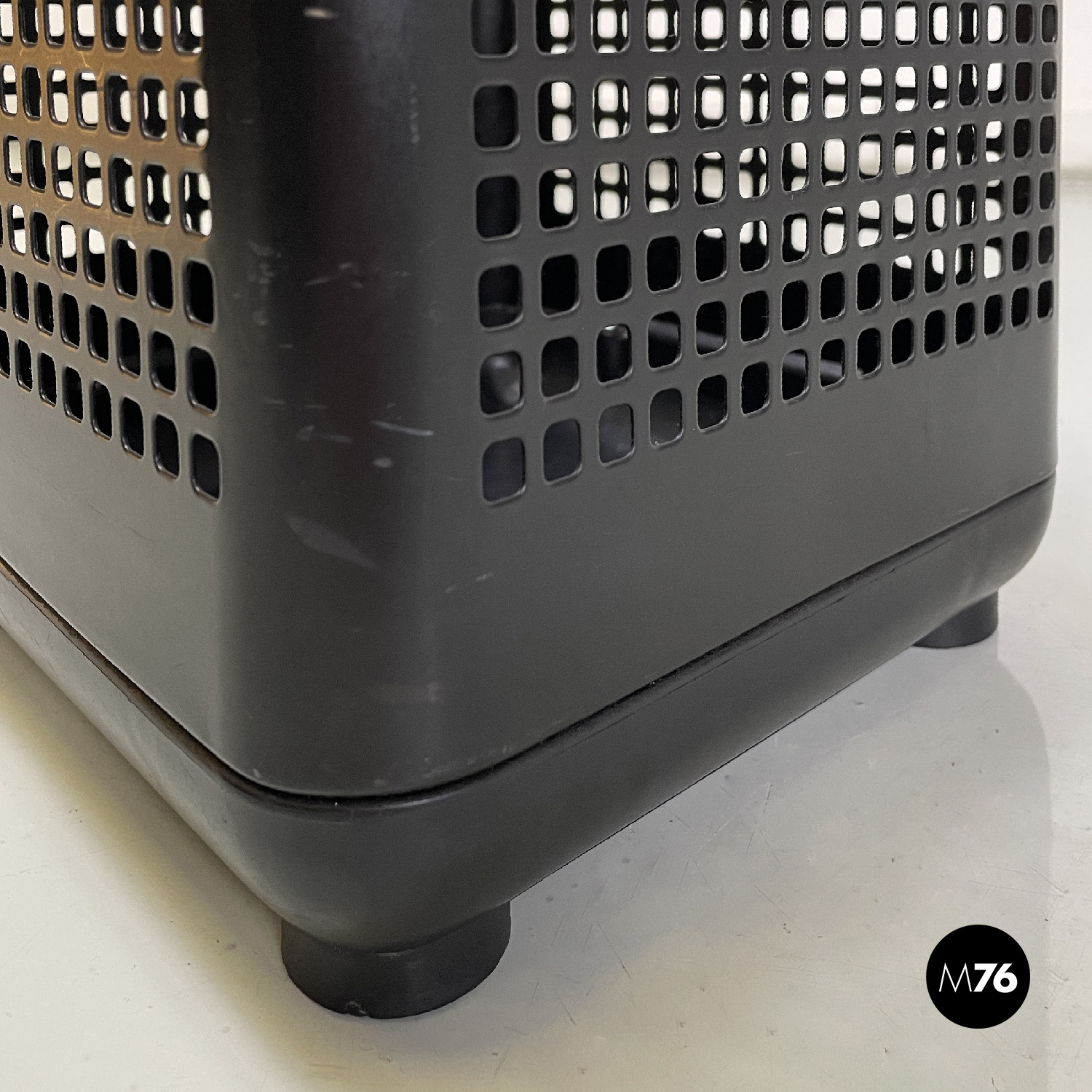 Coppia di cestini da ufficio a base quadrata. La struttura principale è composta da una lamiera forata con fori quadrati, ed è verniciata in nero con finitura opaca. La parte superiore e la base con piedini tondi sono in plastica nera.