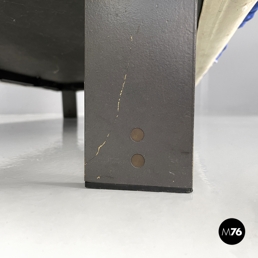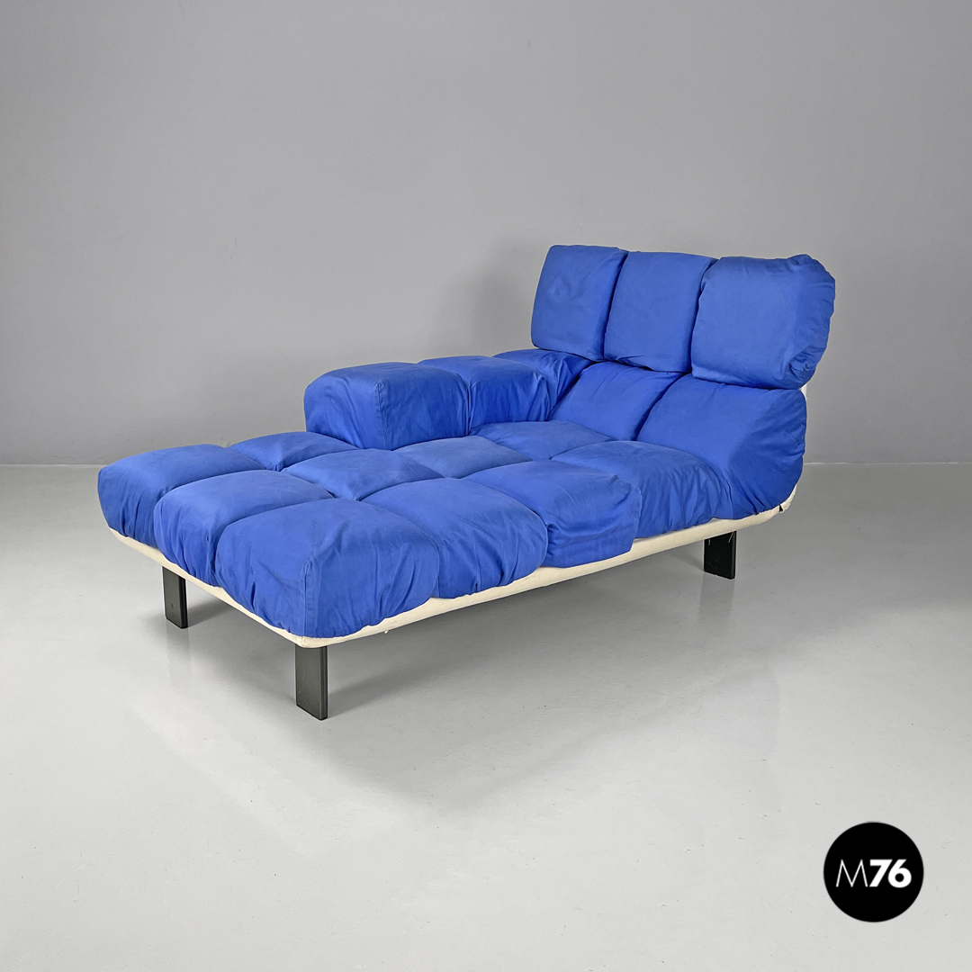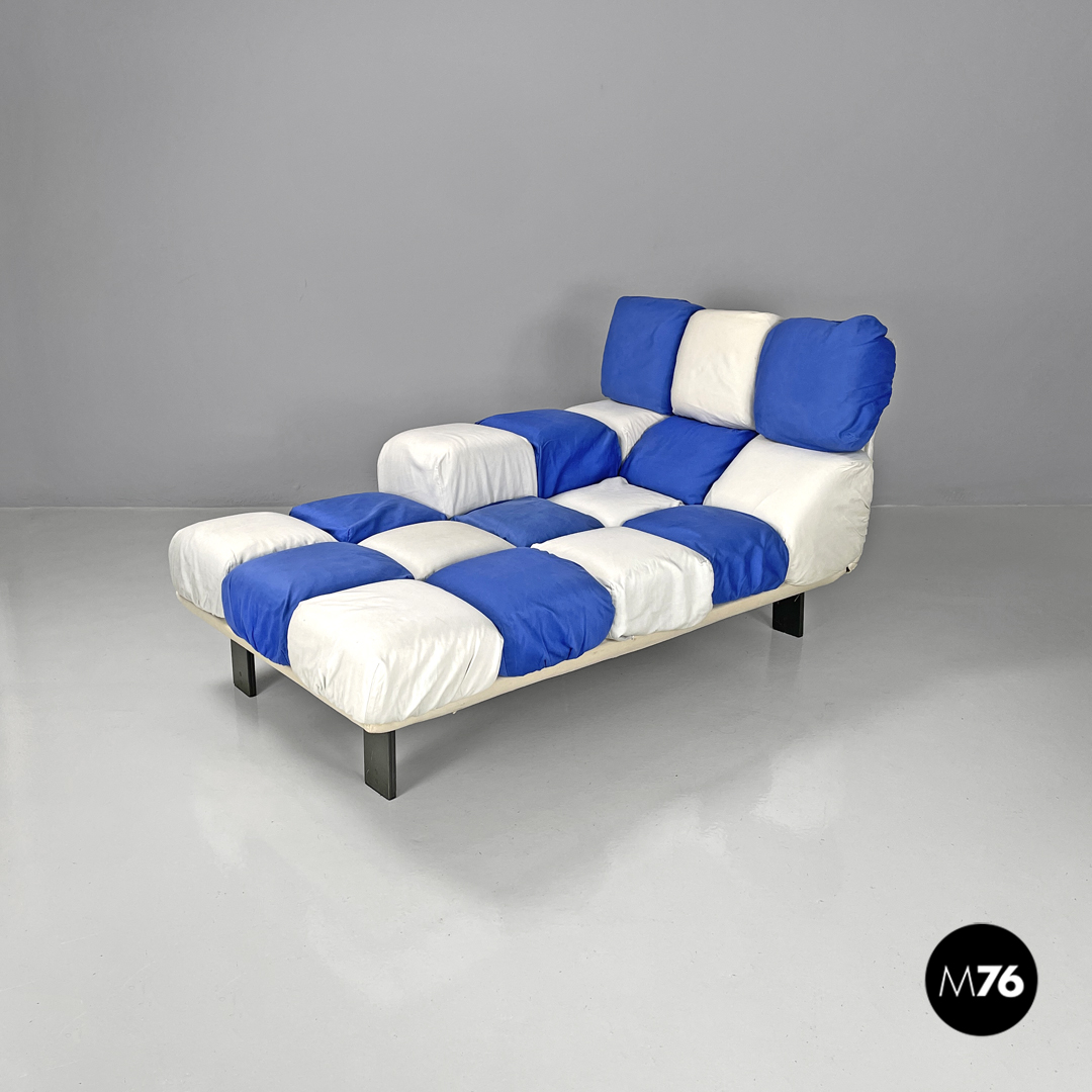 Chaise longue imbottita con seduta rettangolare. La schienale, il bracciolo e la seduta sono composti da diciotto cubi imbottiti e rivestiti di tessuto double face blue elettrico e bianco. I cubi della seduta e dello schienale sono collegati alla struttura tramite velcro, mentre quelli del bracciolo si incastrano in guide di tondino di ferro nero e sono più alti. Con quattro gambe a sezione rettangolare in metallo nero. Utilizzabile come daybed.