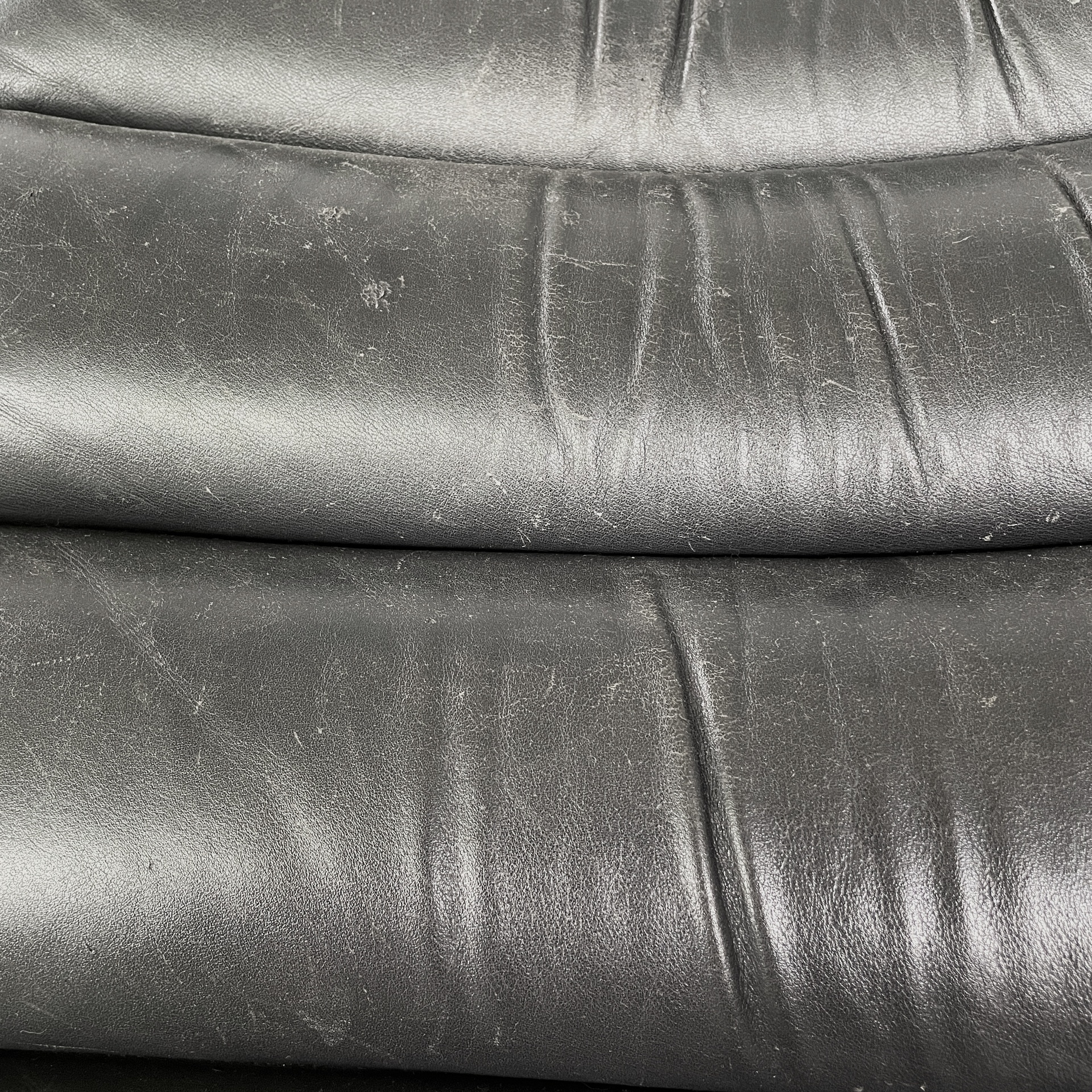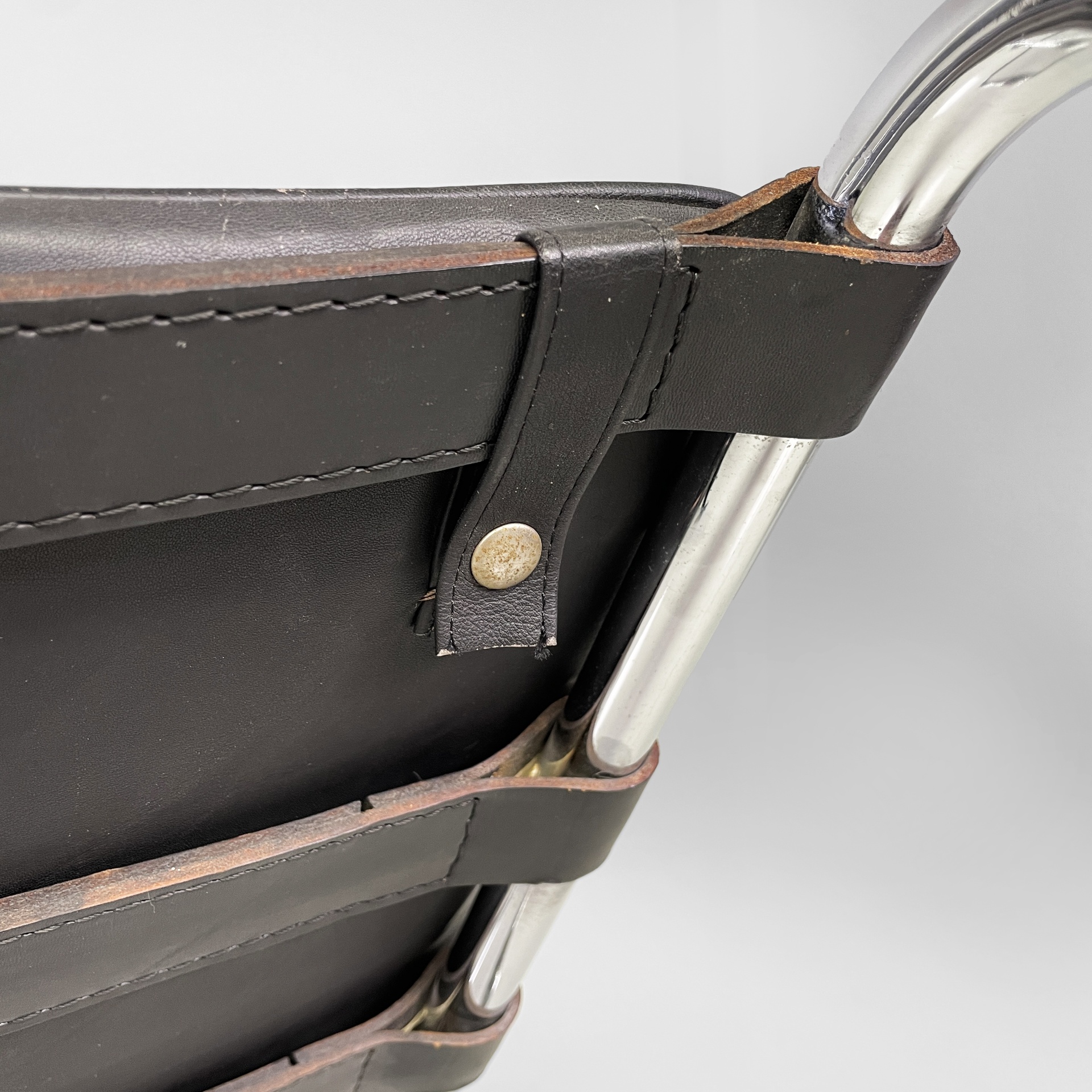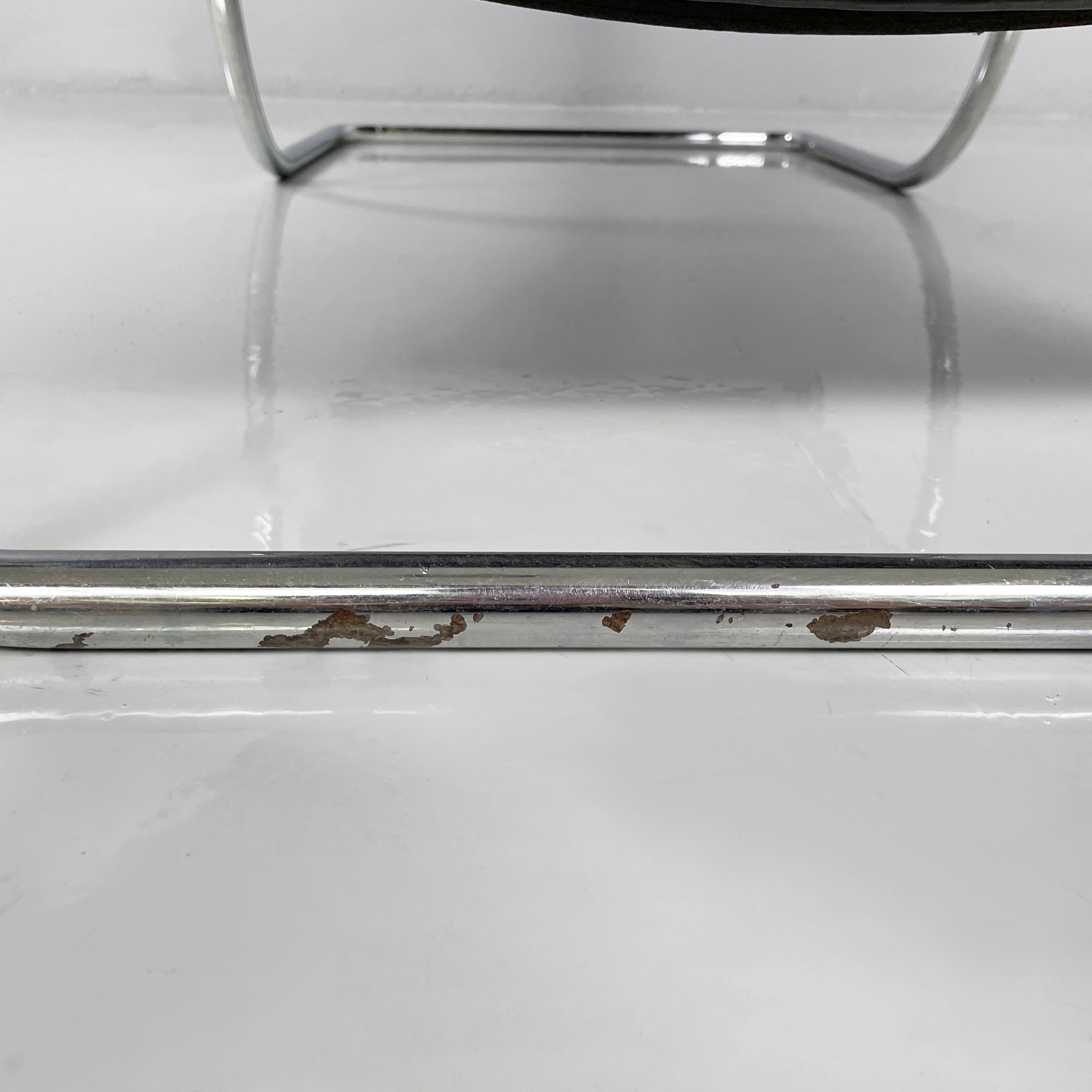 Condizioni discrete. La pelle presenta segni sparsi dati dall’utilizzo e due difetti sul profilo. Il metallo presenta segni di ossidazione. Alla base è presente un segno più evidente sul tubolare di metallo. Alcune cinghie in pelle presentano segni evidenti, i quali non compromettono la seduta.