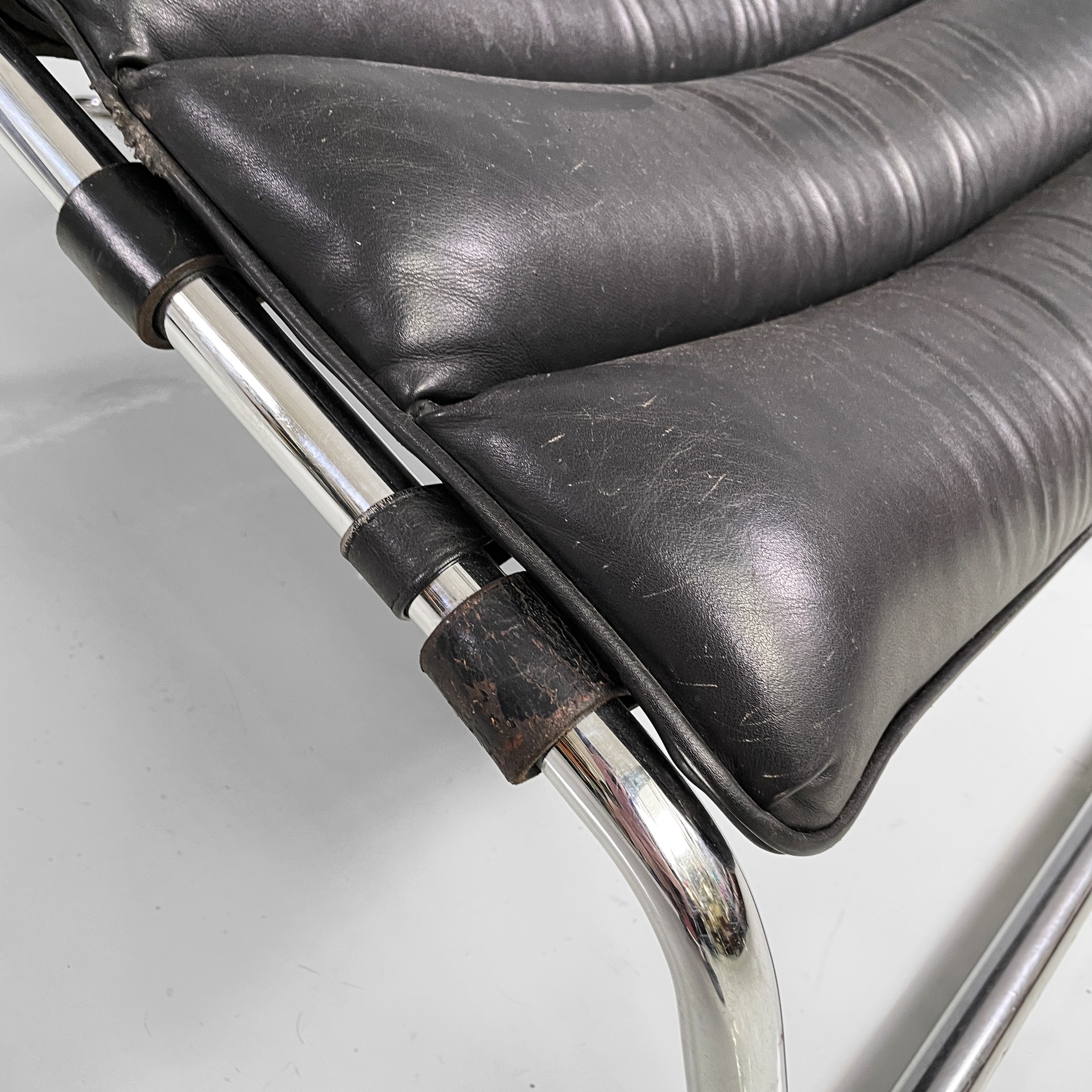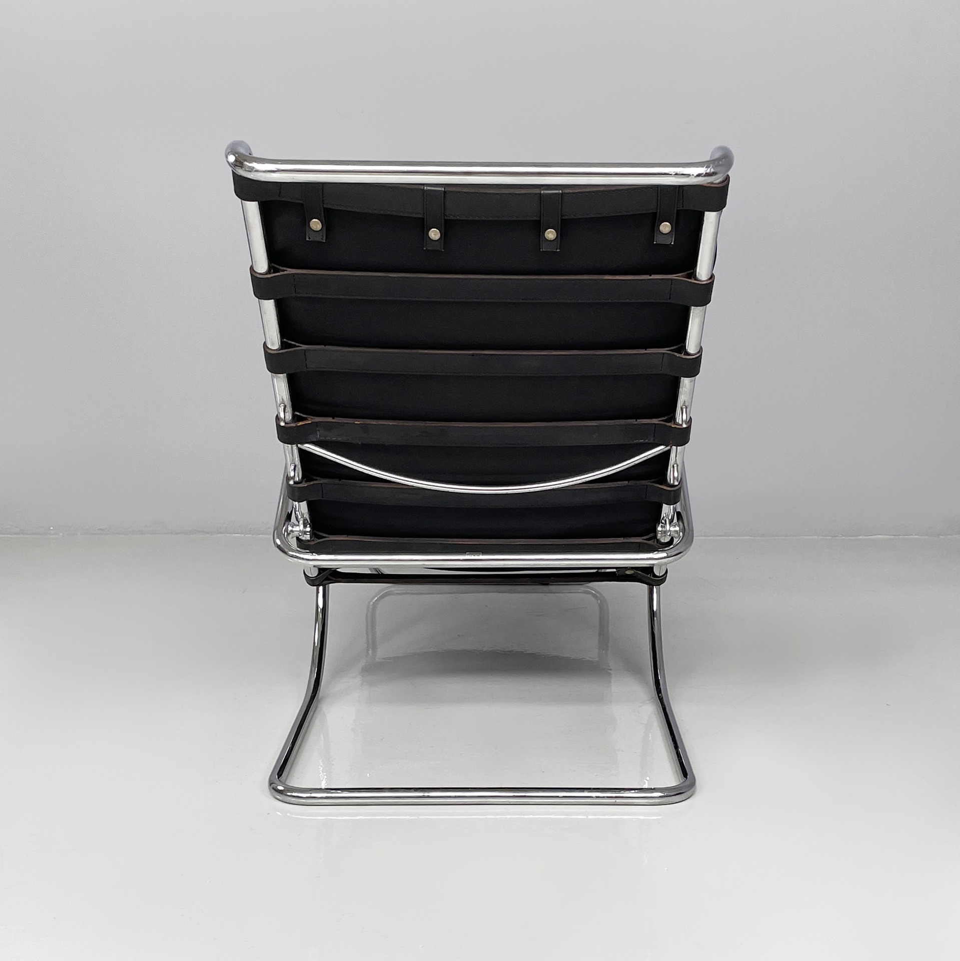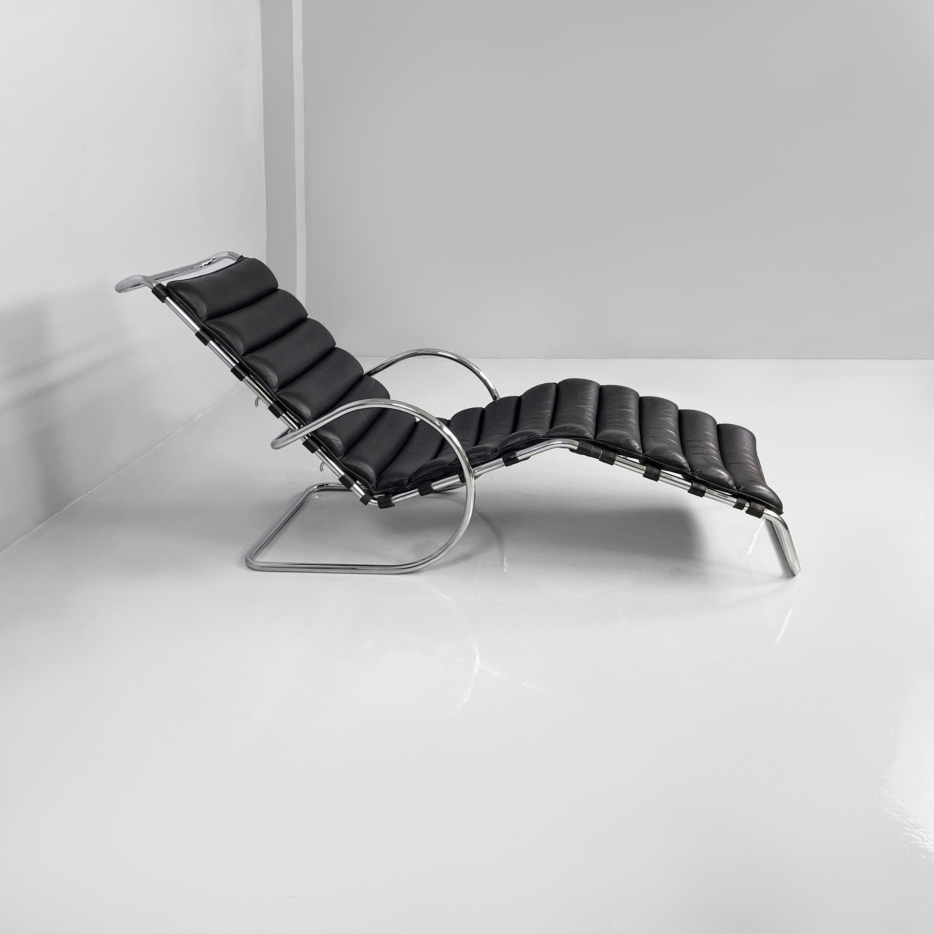 Chaise longue con seduta e schienale imbottiti e rivestiti in pelle nera con cinghie nere sul retro. La struttura e la base sono in tubolare di acciaio cromato. Sullo schienale sono presenti tre ganci, i quali permettono di scegliere l’inclinazione della poltrona.