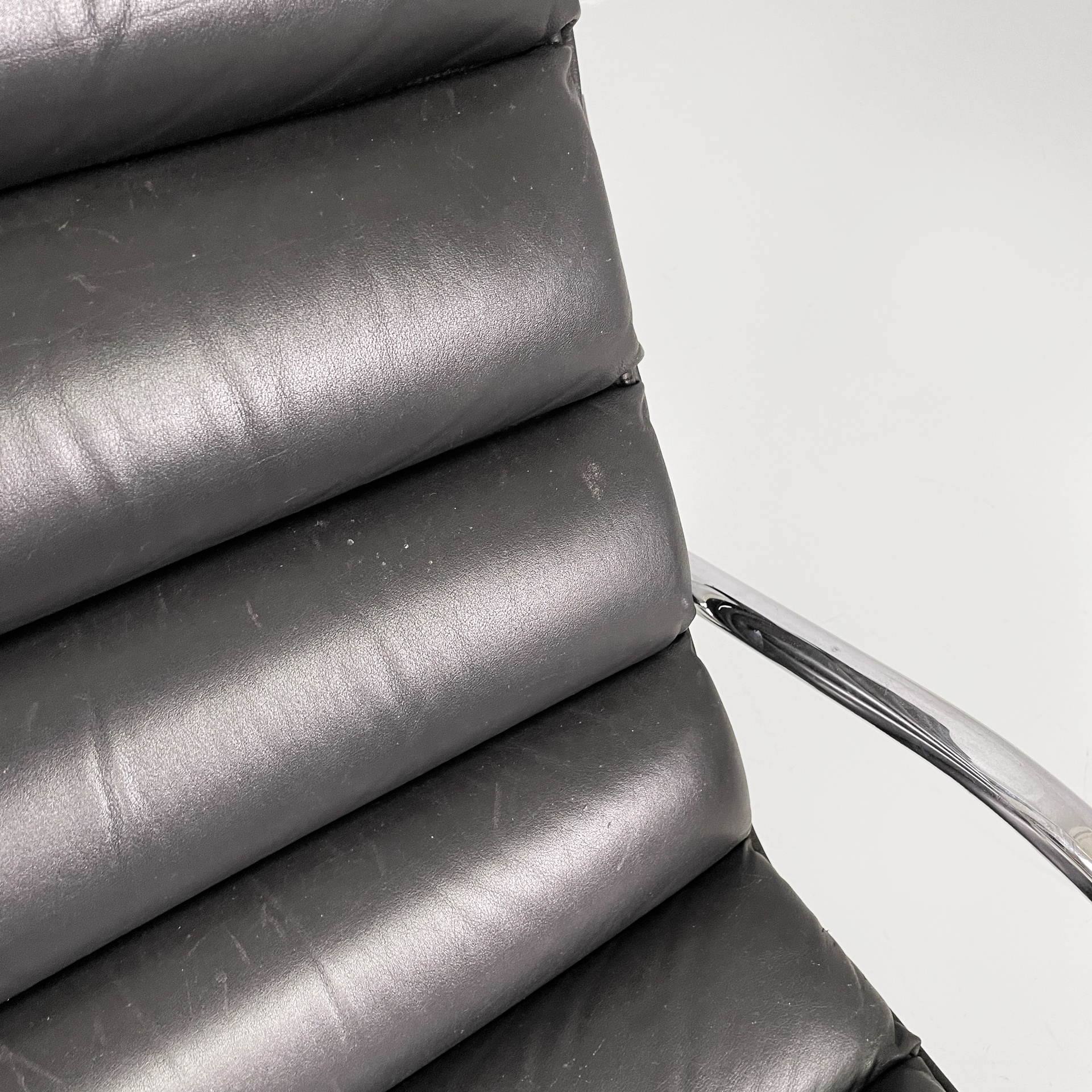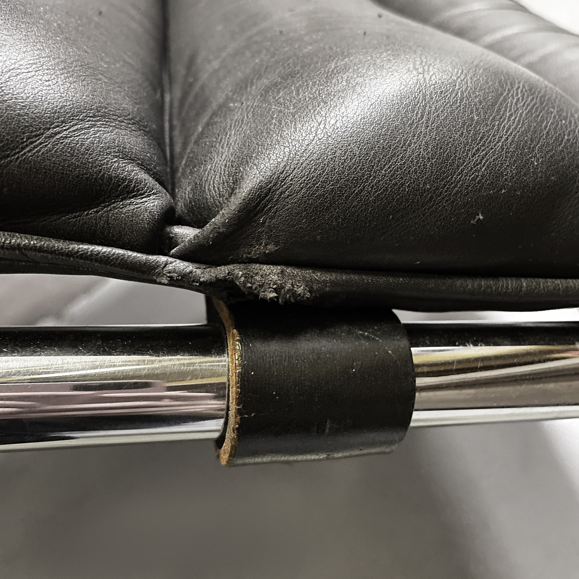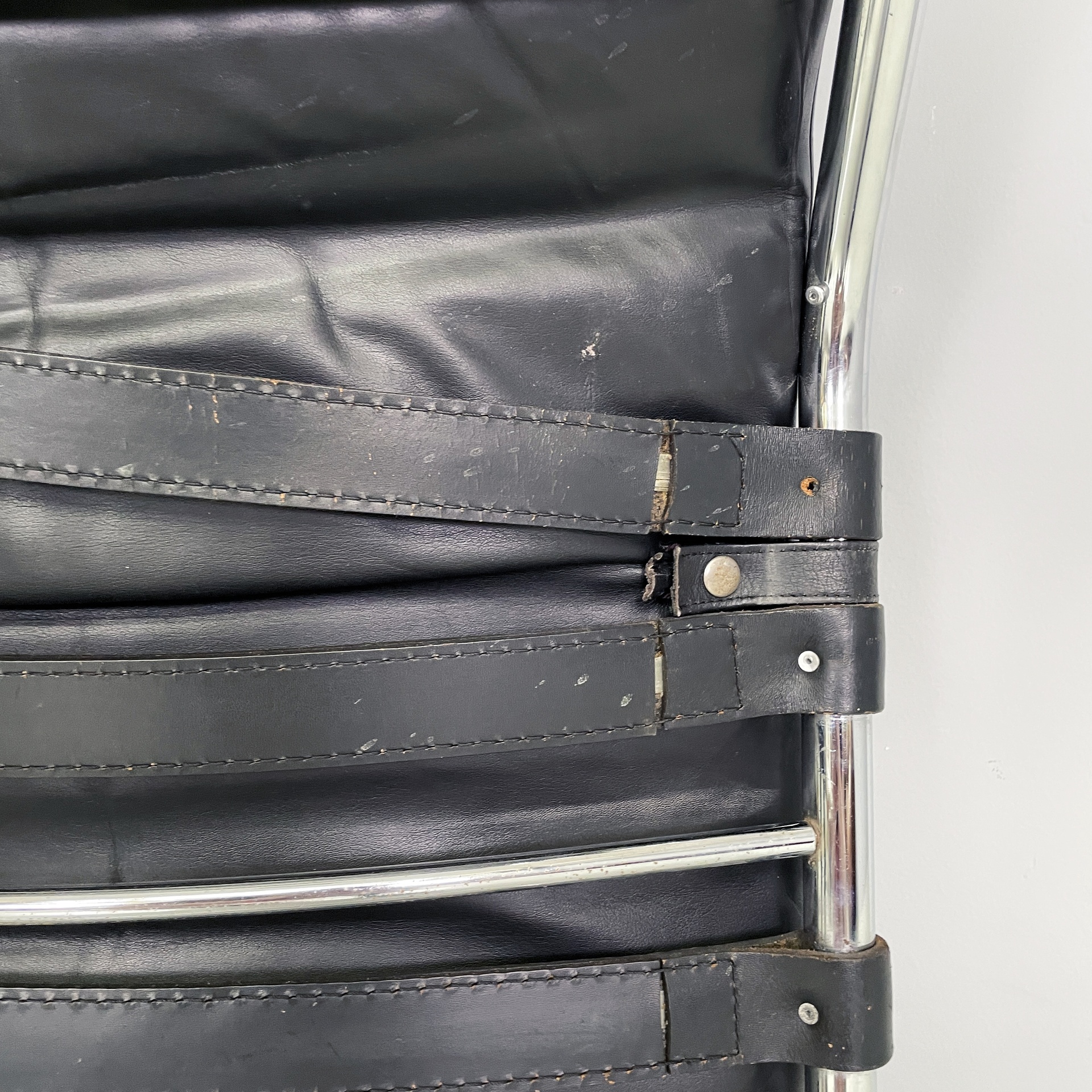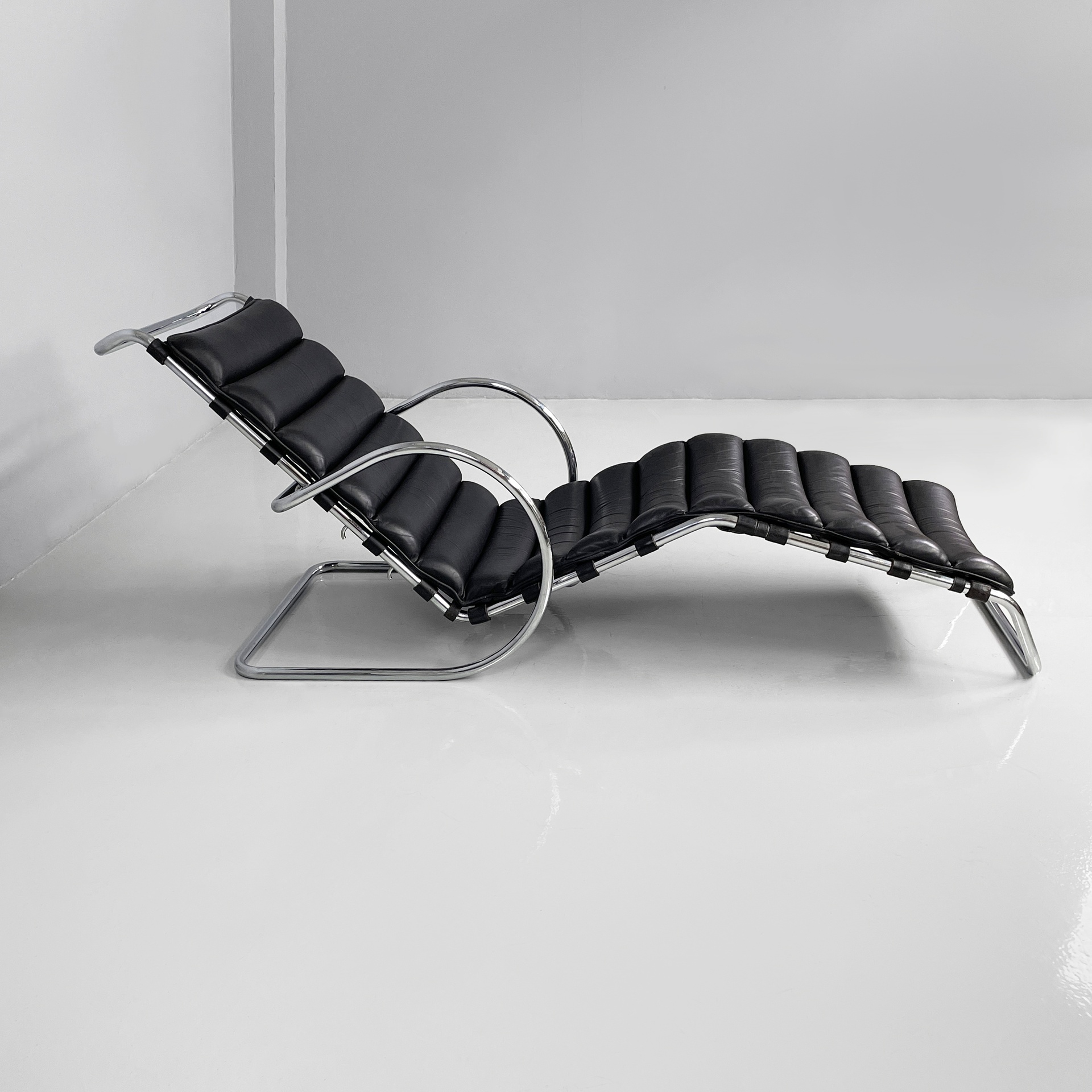 Chaise longue con seduta e schienale imbottiti e rivestiti in pelle nera con cinghie nere sul retro. La struttura e la base sono in tubolare di acciaio cromato. Sullo schienale sono presenti tre ganci, i quali permettono di scegliere l’inclinazione della poltrona.