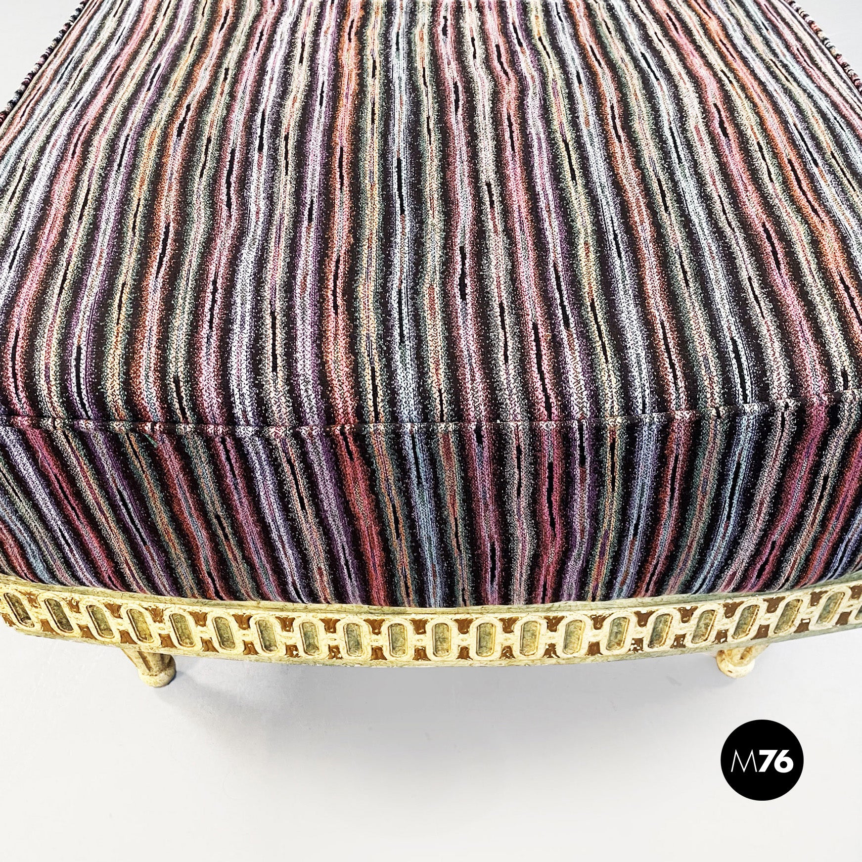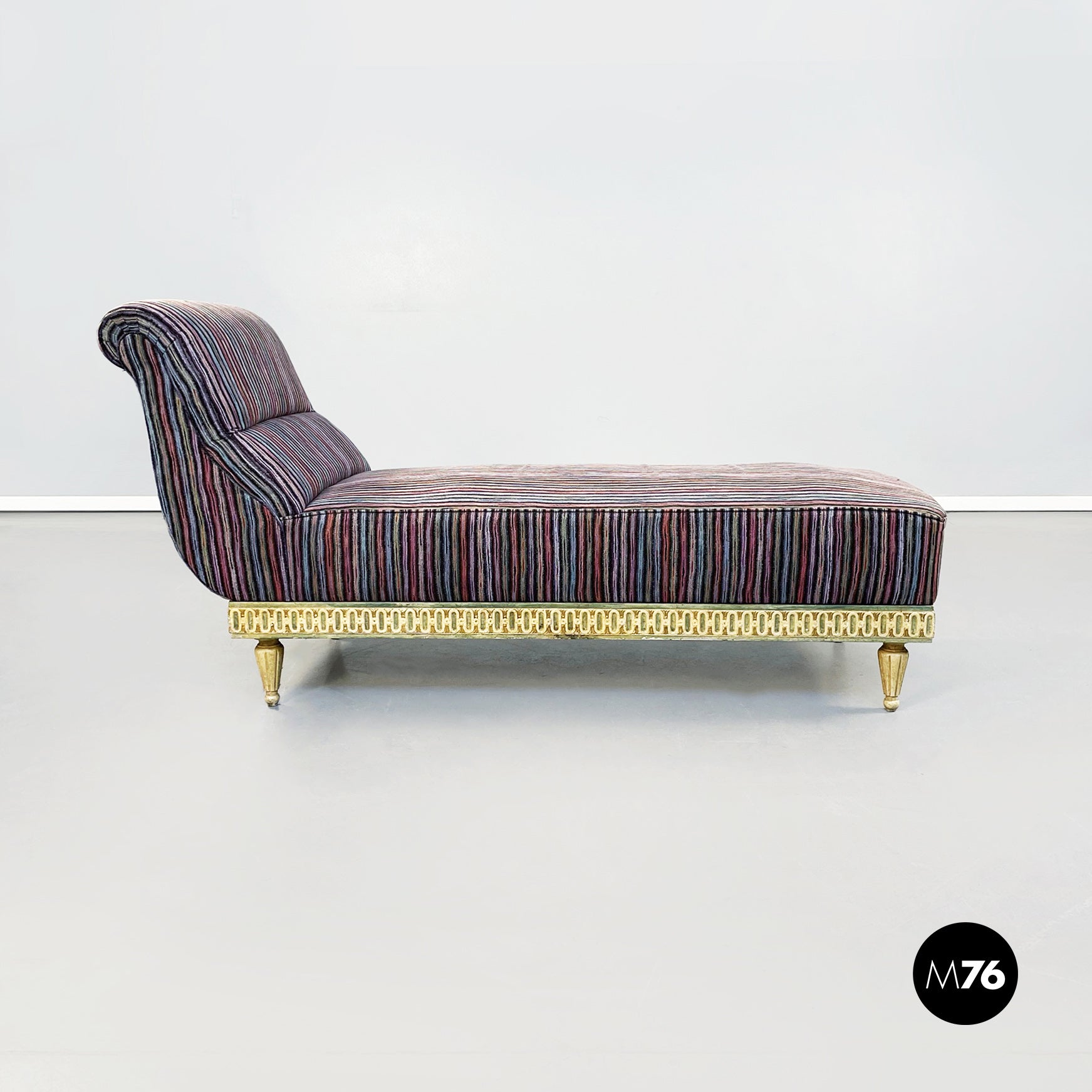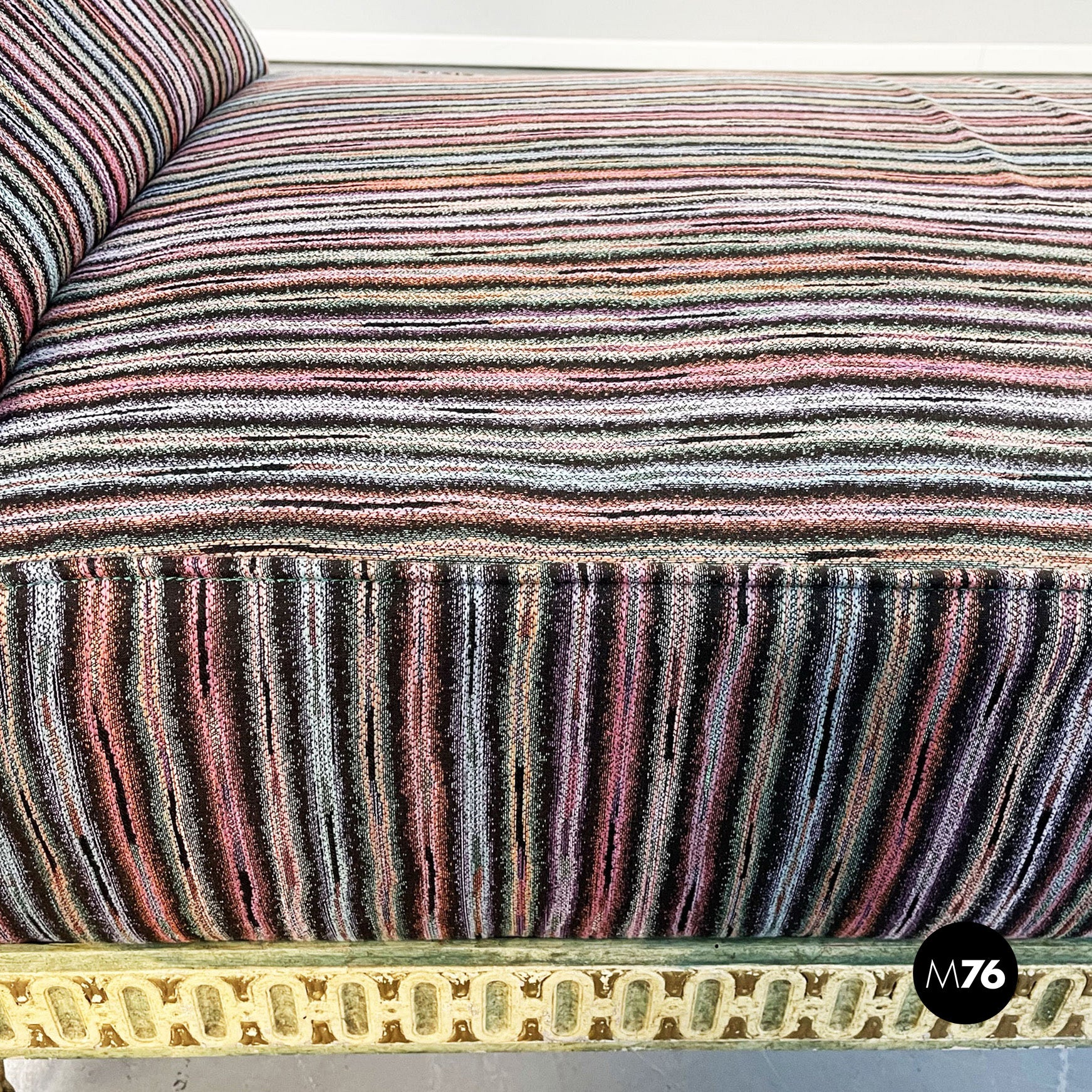 Chaise longue con seduta rettangolare e schienale imbottiti e rivestiti di tessuto a righe variopinte di Missoni. La struttura sottostante è in legno lavorata e dipinta di bianco avorio, verde e giallo. I piedini sono finemente lavorati. In stile veneziano.