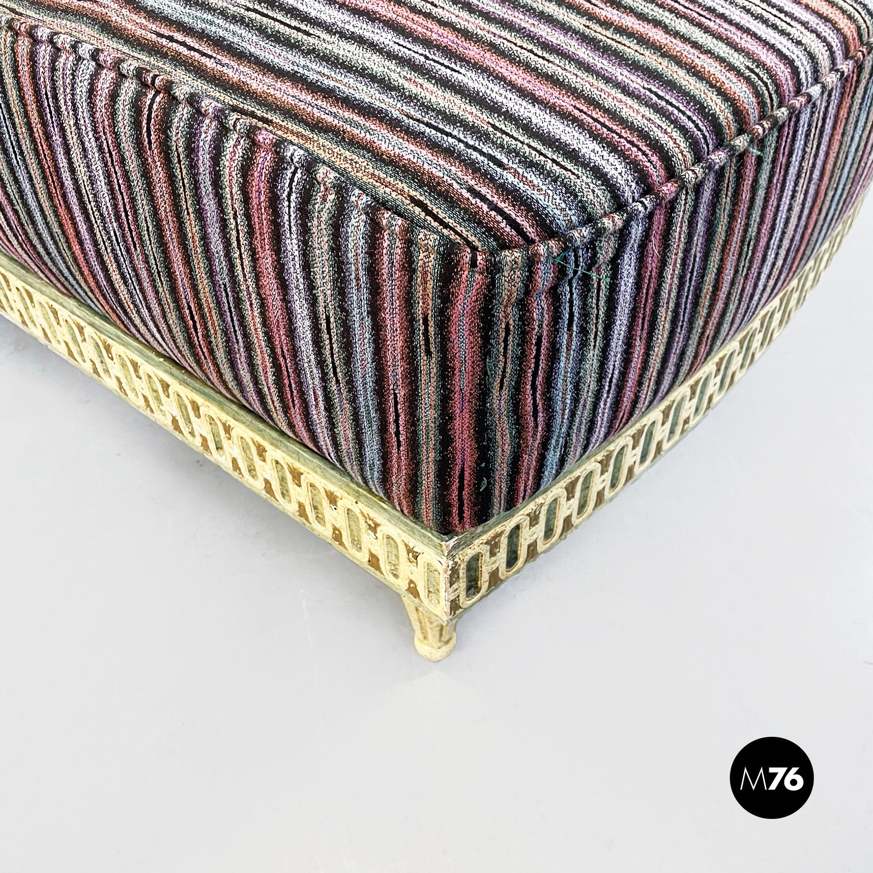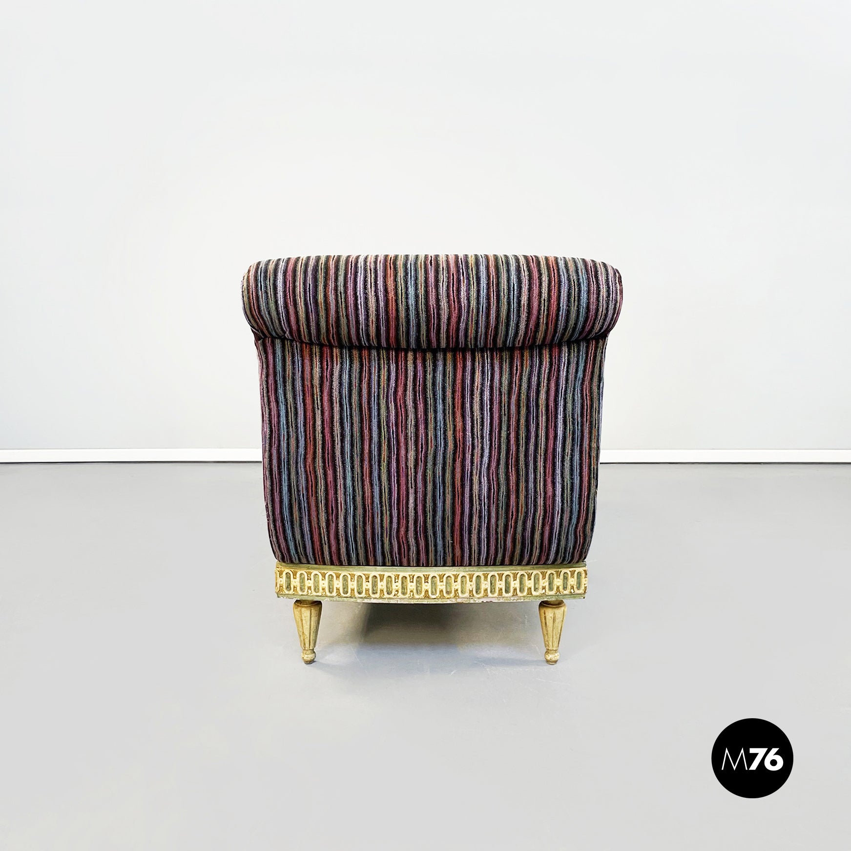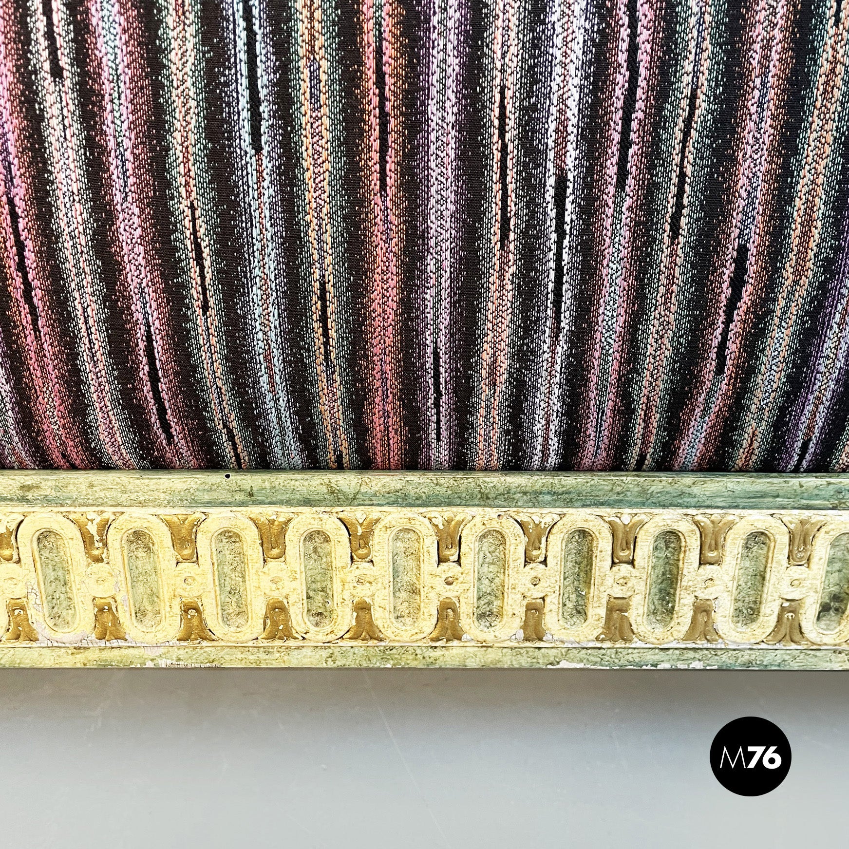 Chaise longue con seduta rettangolare e schienale imbottiti e rivestiti di tessuto a righe variopinte di Missoni. La struttura sottostante è in legno lavorata e dipinta di bianco avorio, verde e giallo. I piedini sono finemente lavorati. In stile veneziano.